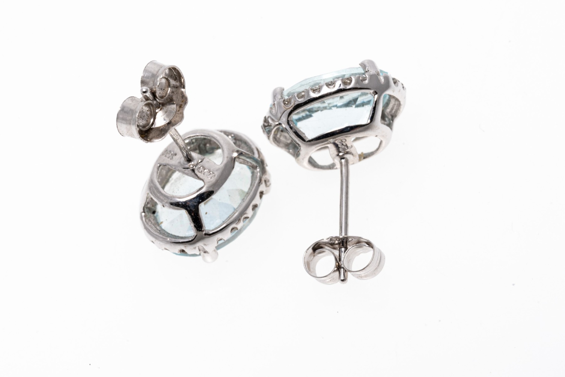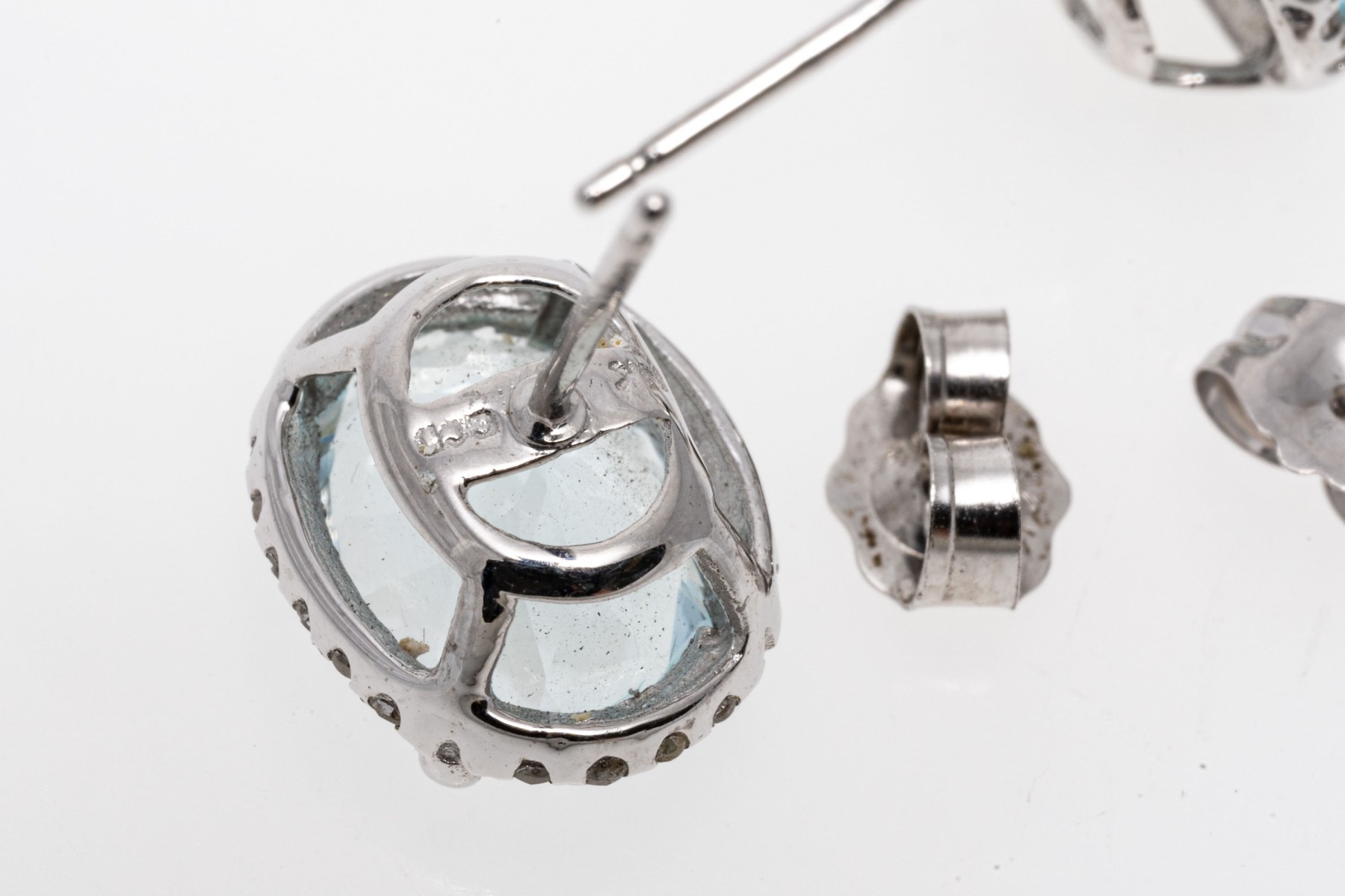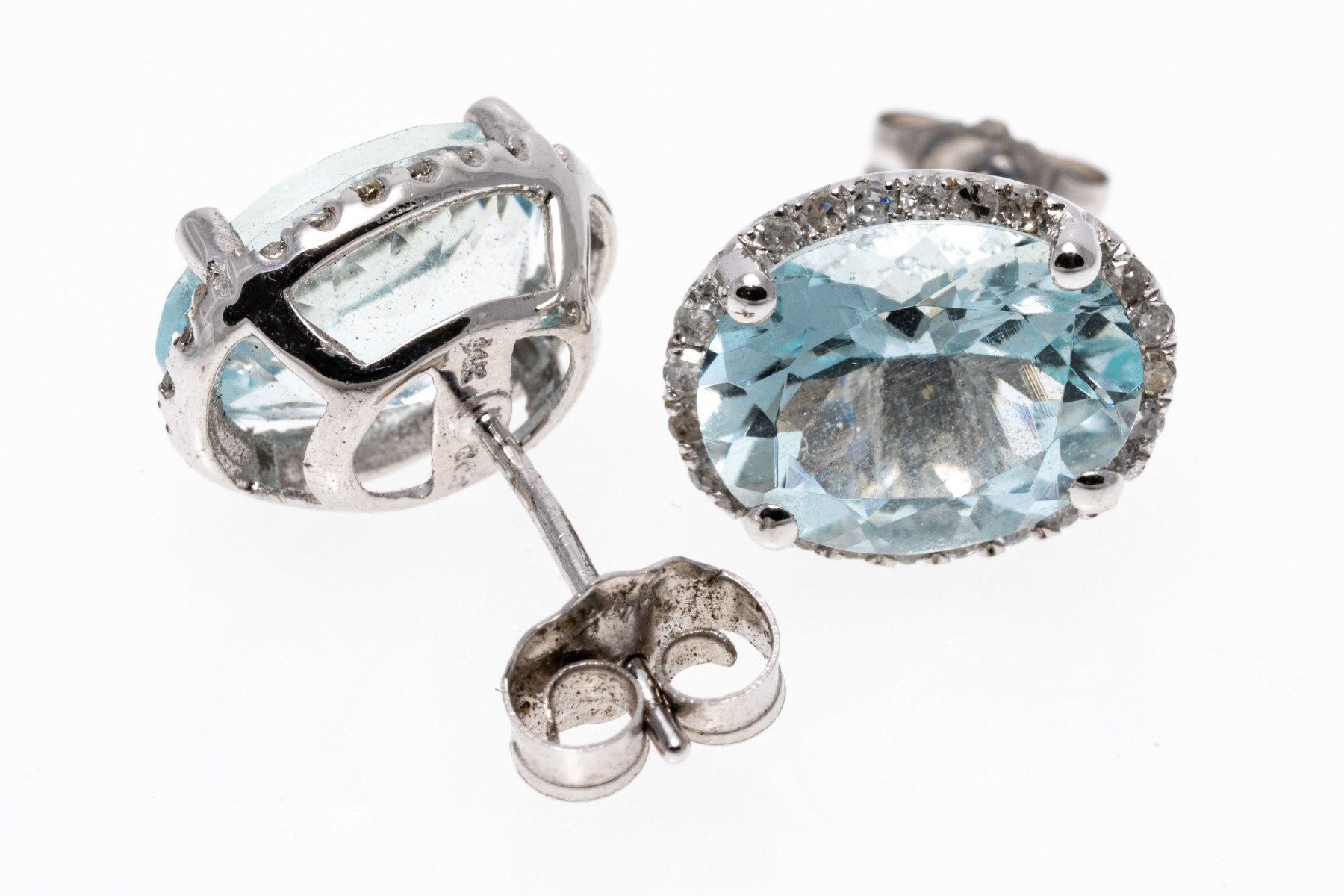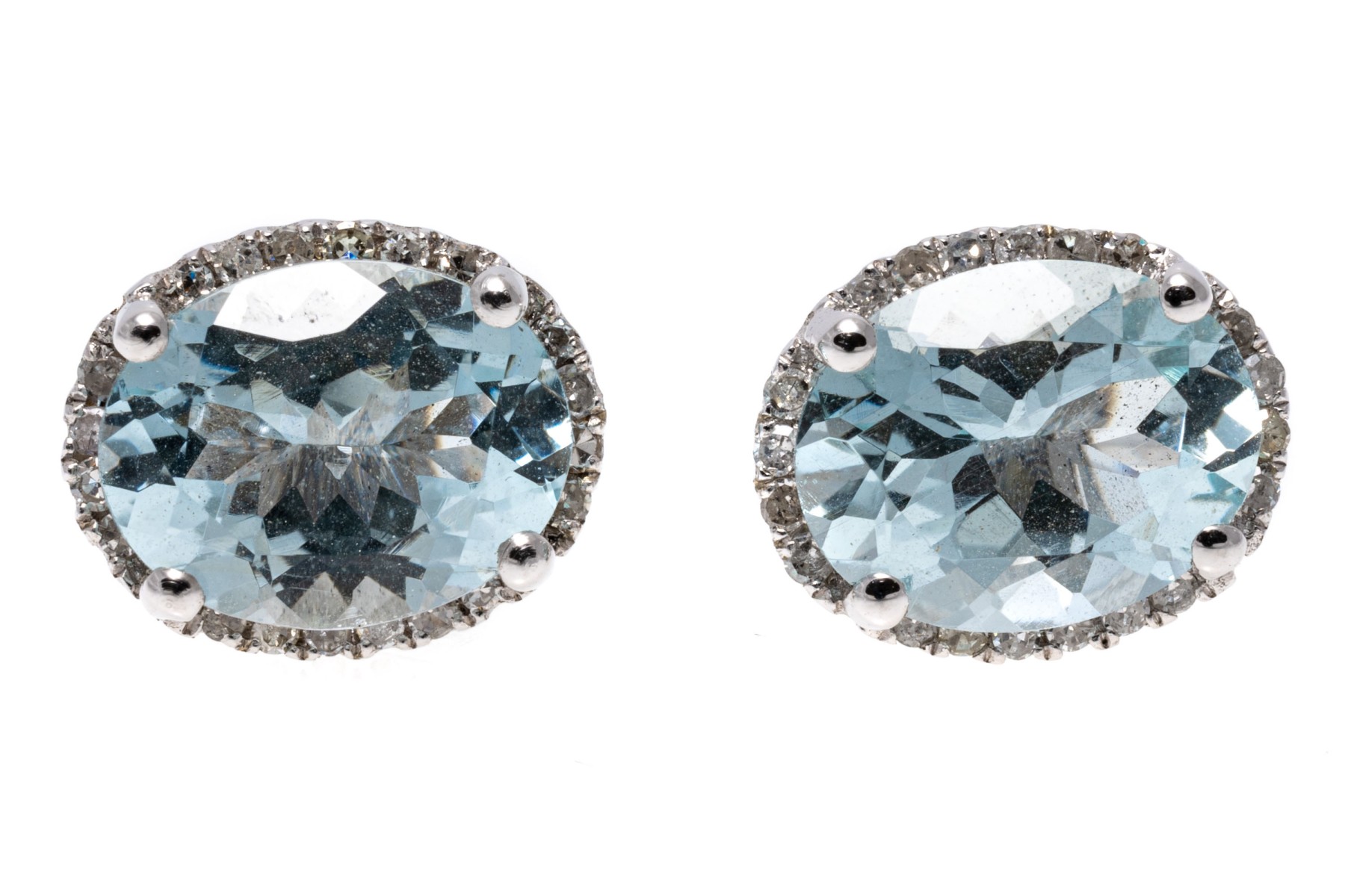 Created from 14K white gold, these earrings display oval faceted aquamarines with a pale blue coloring. Surrounding the aquamarines are diamond frames. Aquamarines are approximately 2.96 TCW and the diamonds are approximately 0.15 TCW. Post and clutch backings.