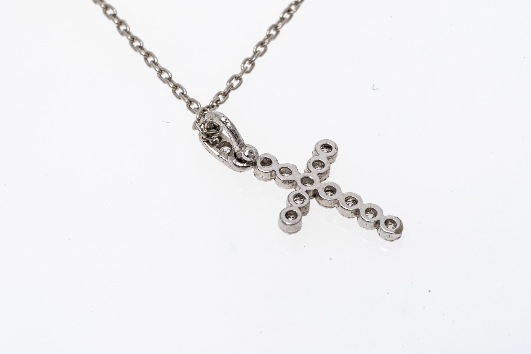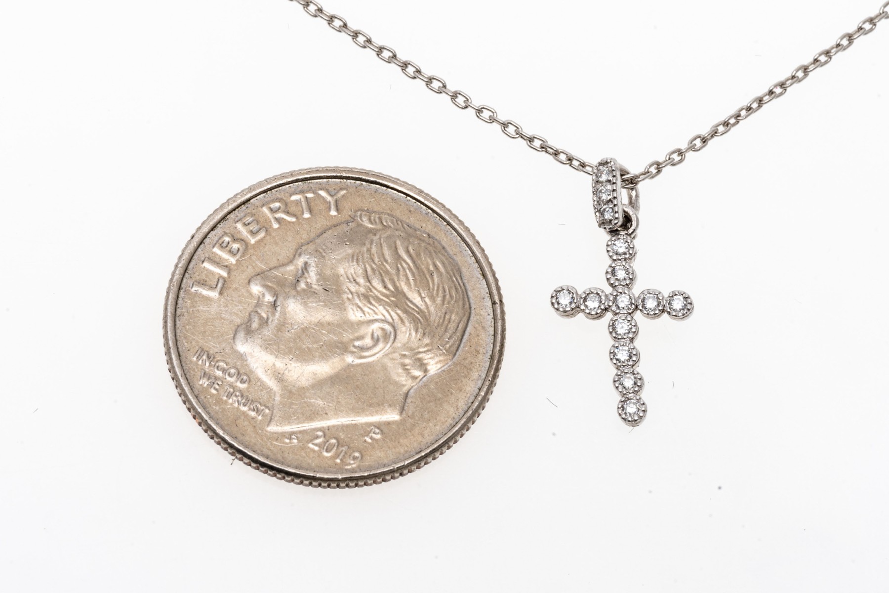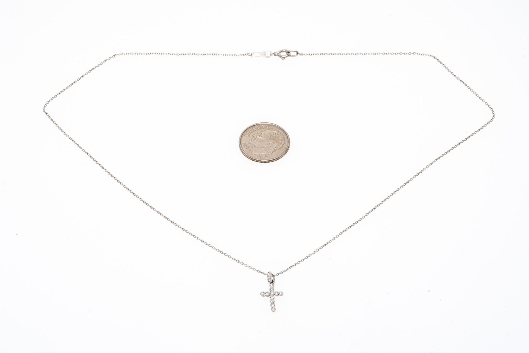 A delicate platinum cable link style chain displays a petite diamond bezel set cross pendant. The diamonds are approximately 0.07 TCW. Spring ring clasp.
