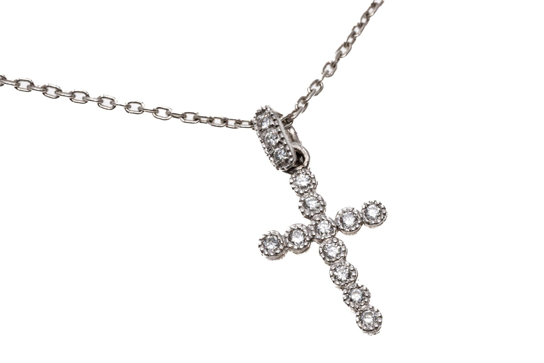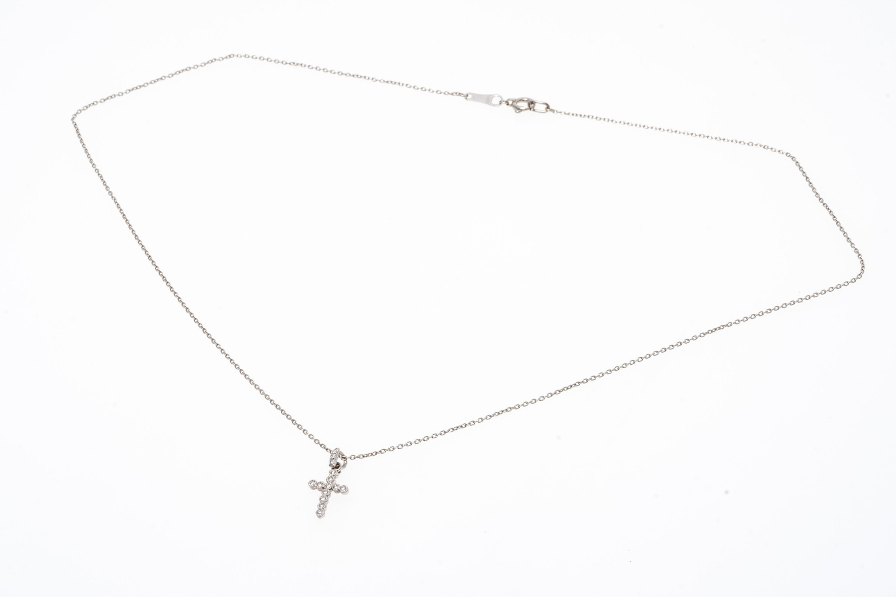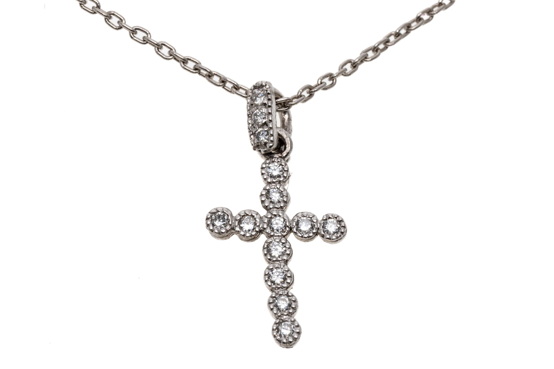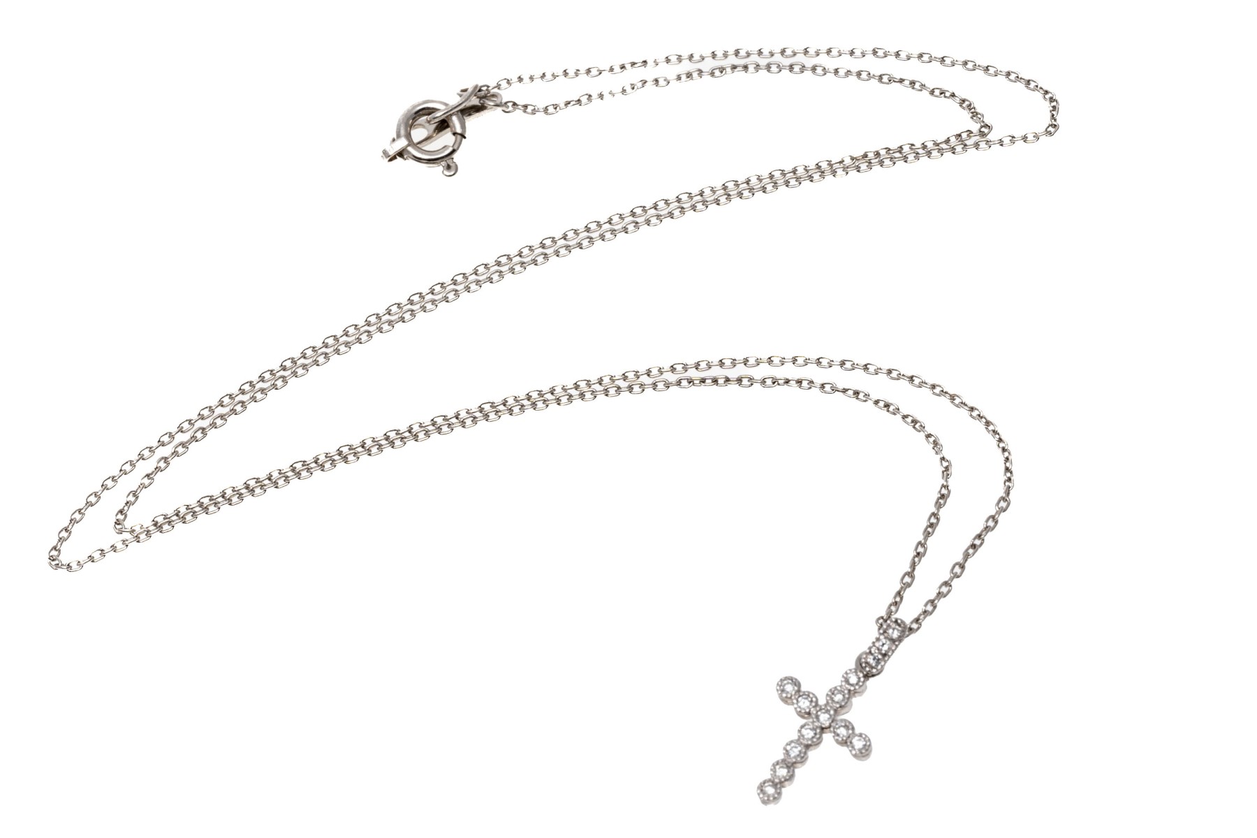 A delicate platinum cable link style chain displays a petite diamond bezel set cross pendant. The diamonds are approximately 0.07 TCW. Spring ring clasp.