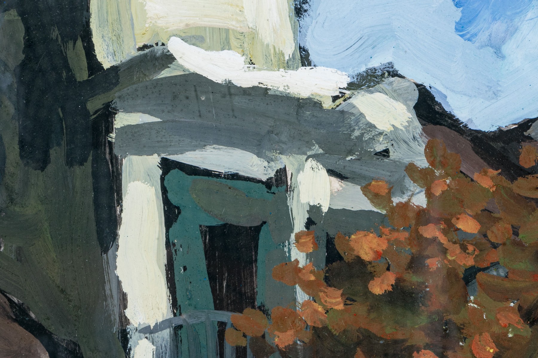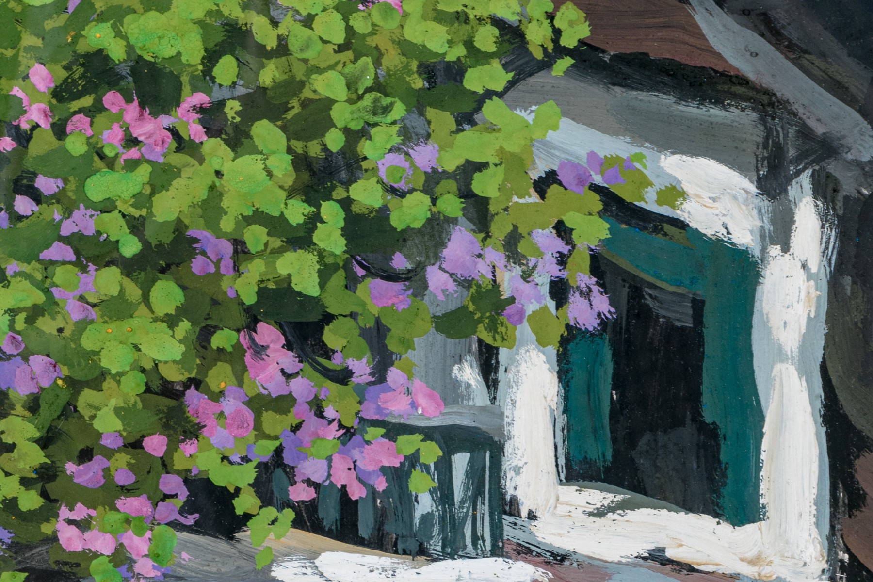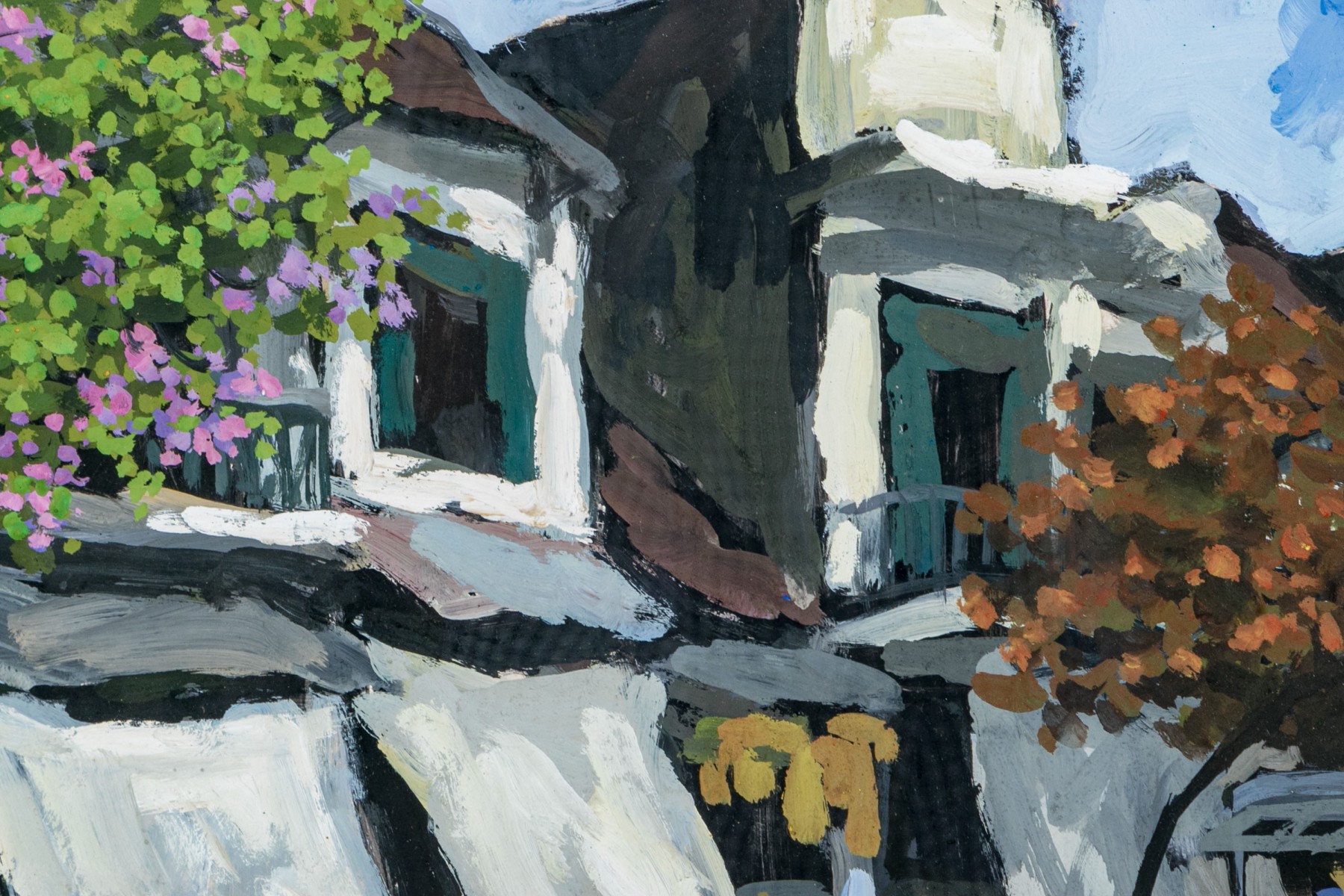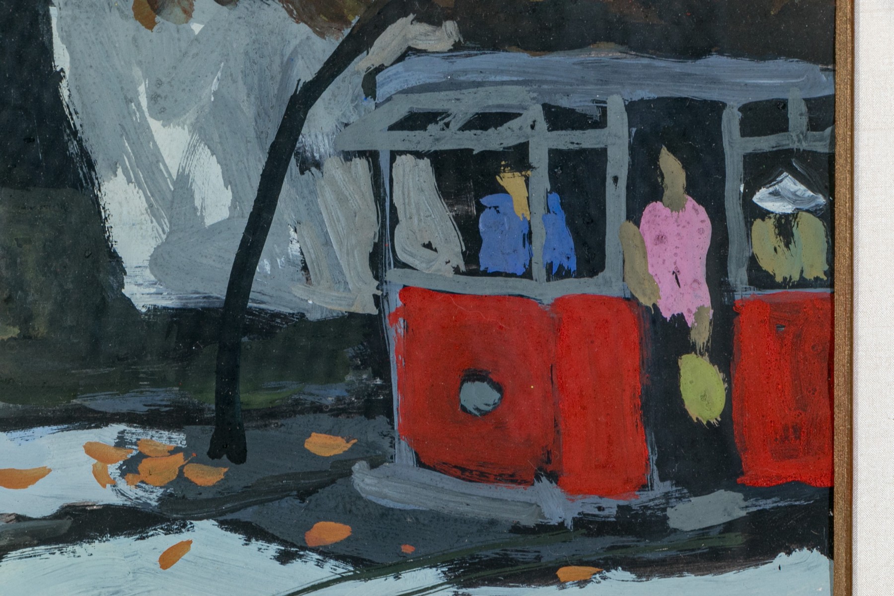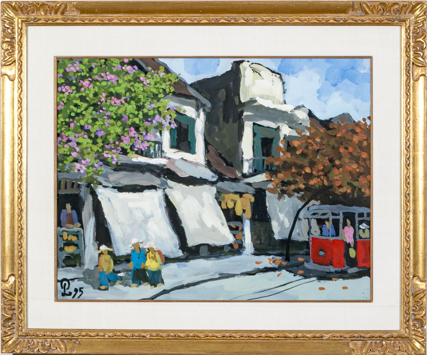 Pham Luan (Vietnamese, B. 1954) gouache on paper painting depicting an urban area, likely Hanoi, in the spring / summer months with vibrant blooming flora and fauna. A group of three figures wearing traditional Vietnamese wide brimmed hats walk on the sidewalk gazing back at a red trolley that can be seen entering from the left hand side of the painting.