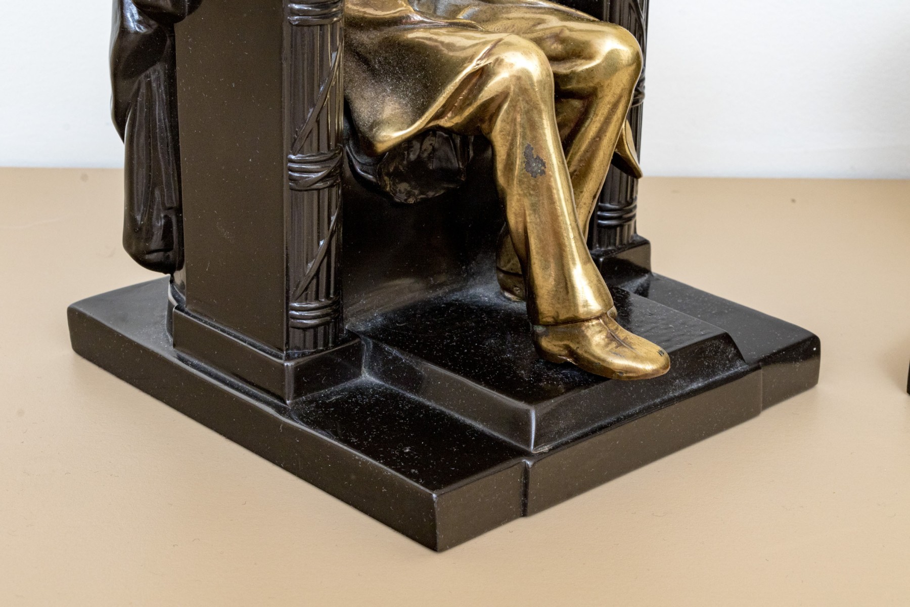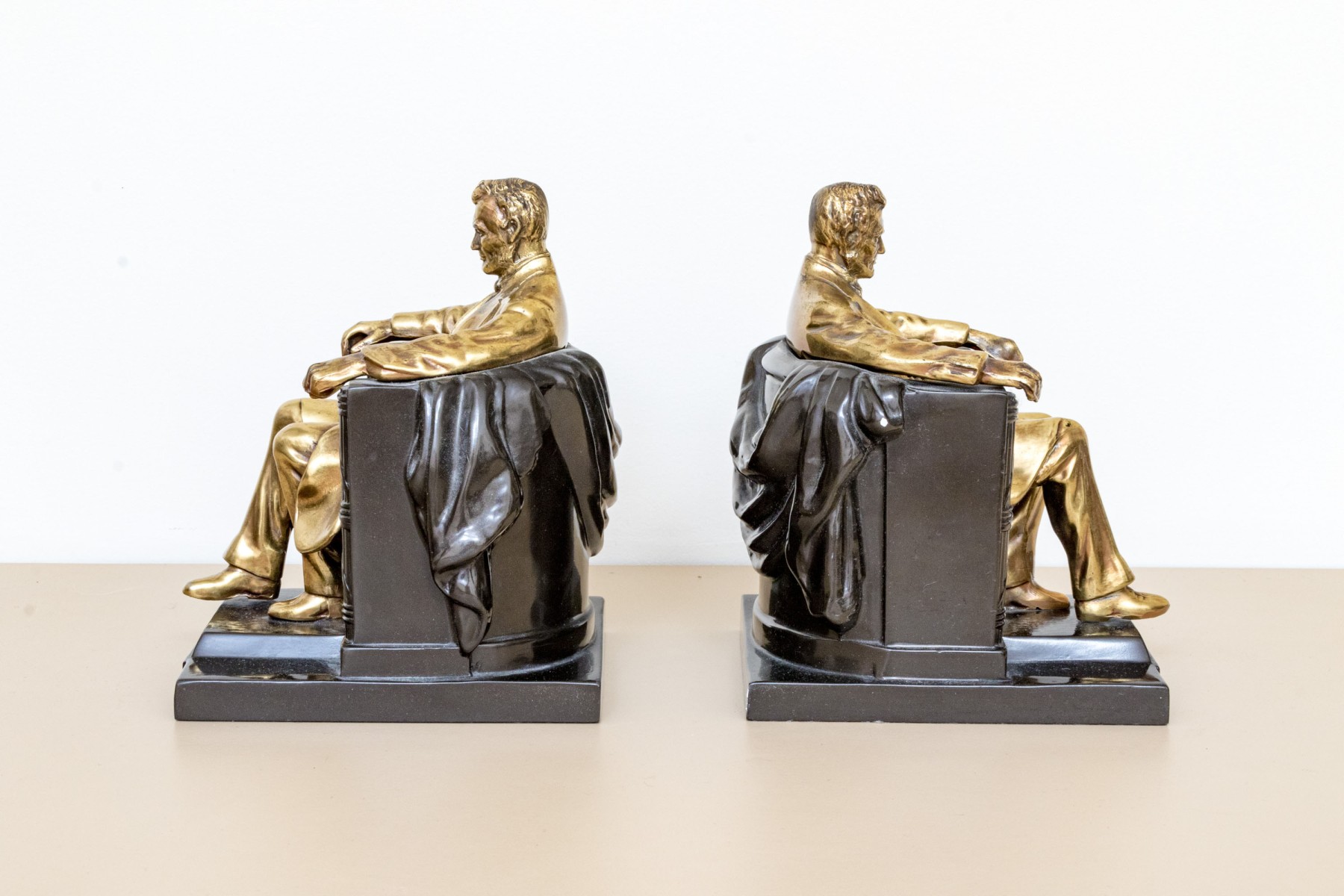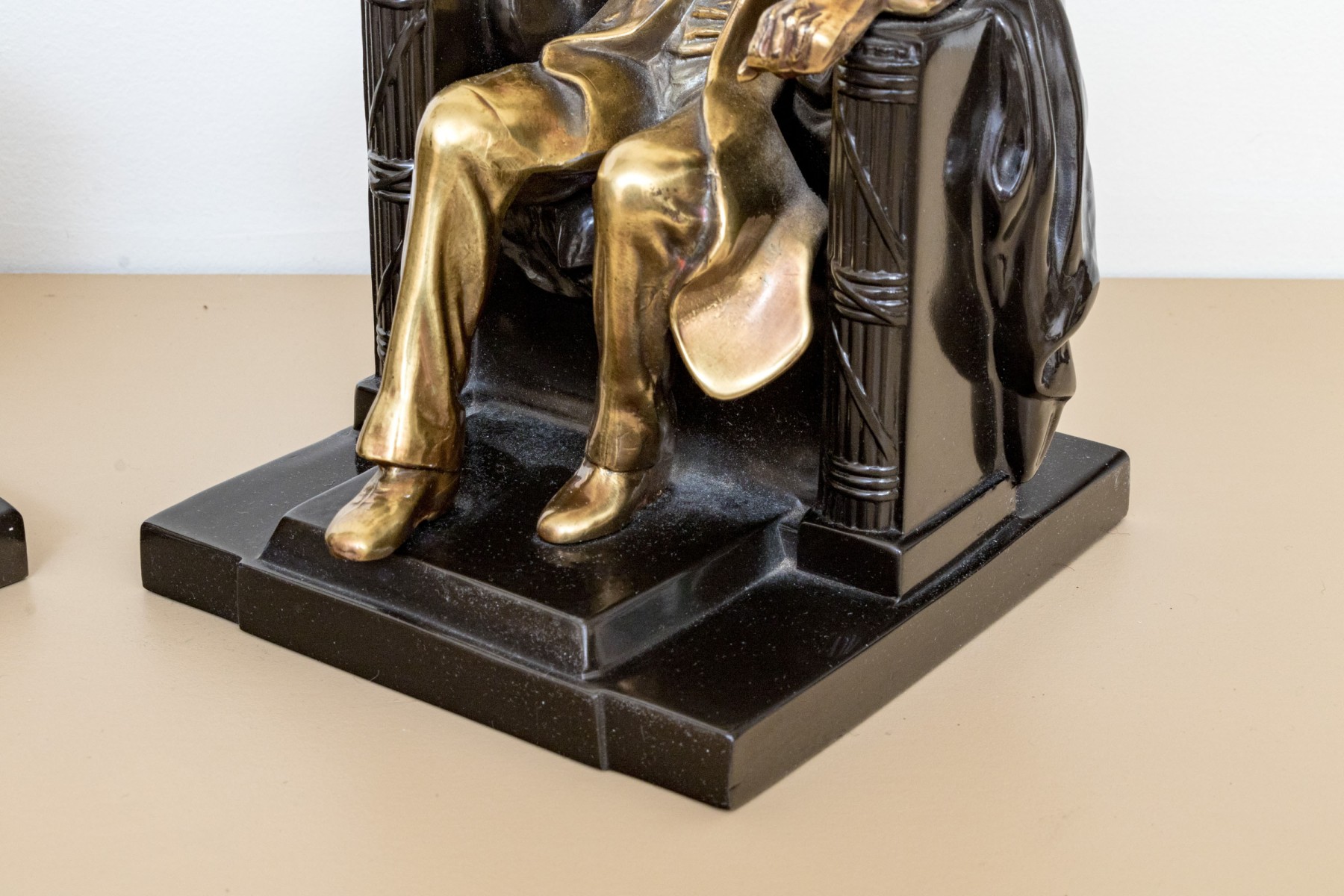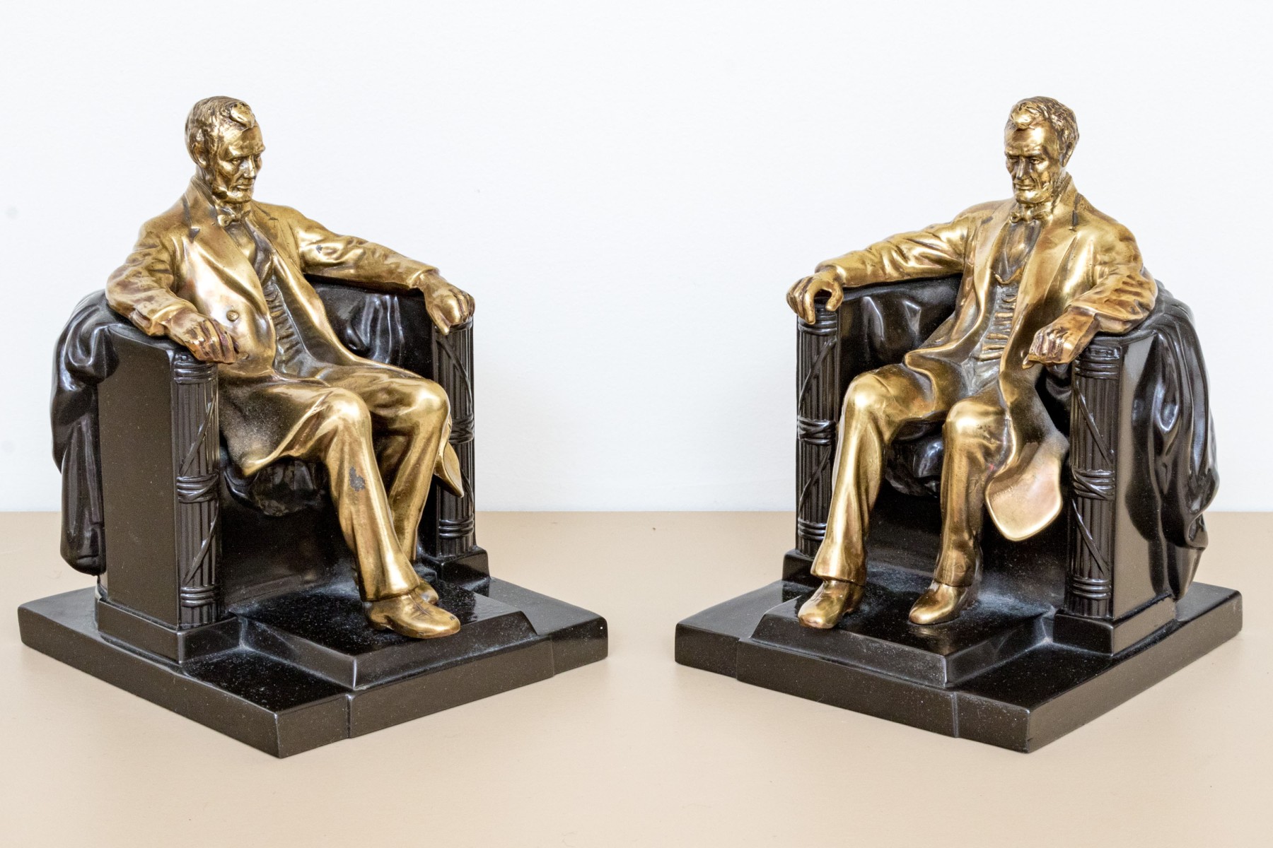 A wonderful pair of vintage Philadelphia Mfg. Co. reproduction statues or bookends of H. French "Lincoln in the Chair" depicting Abraham Lincoln sitting in a stately armchair draped along the back. Lincoln is finished in brass, while the chair is wonderfully finished in satin black. Manufacturer's label affixed to the underside.
