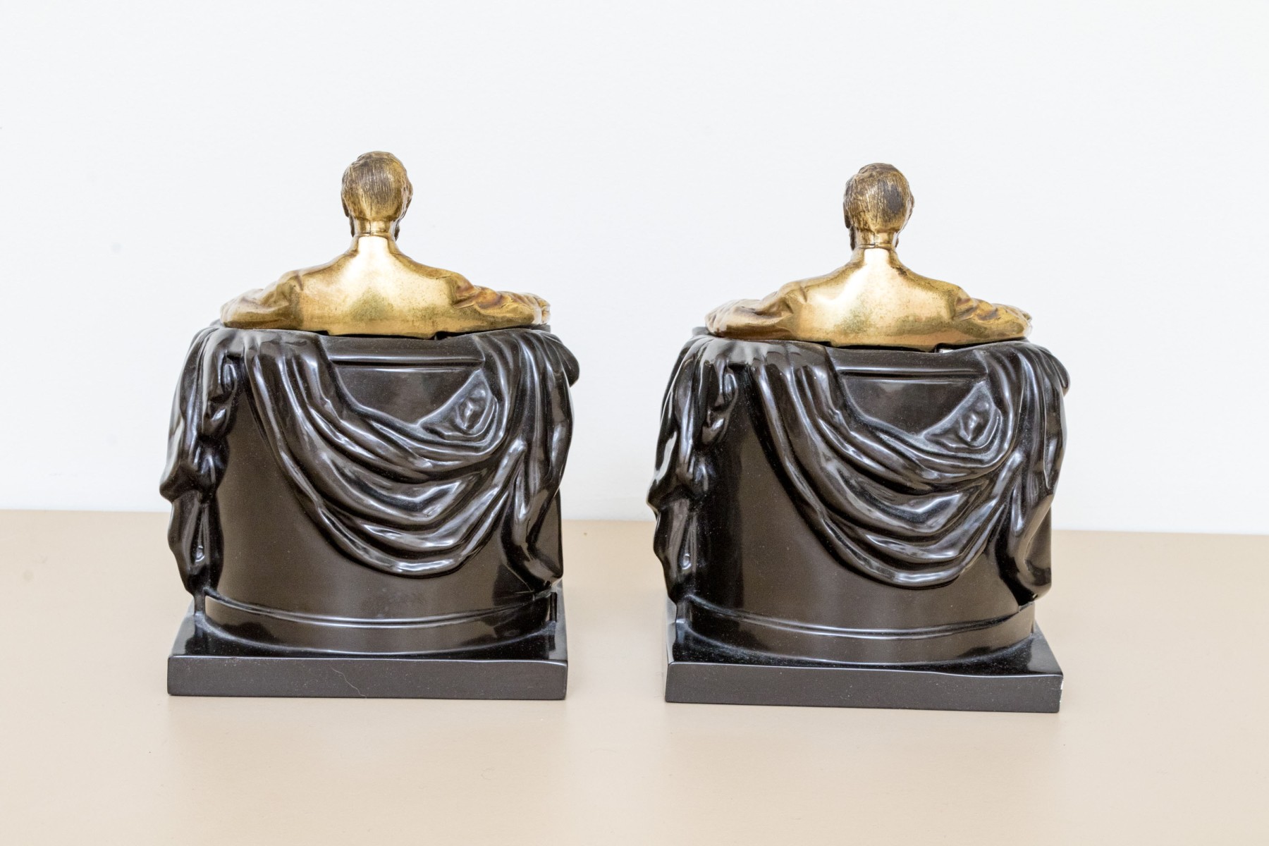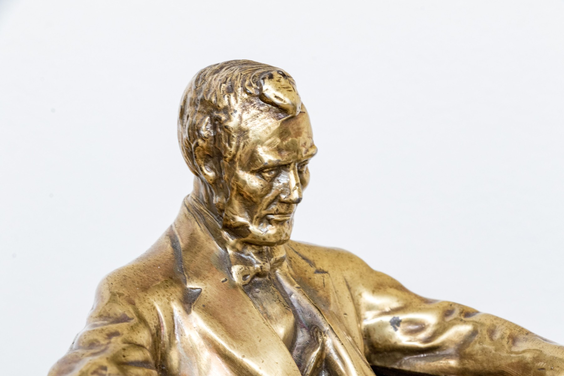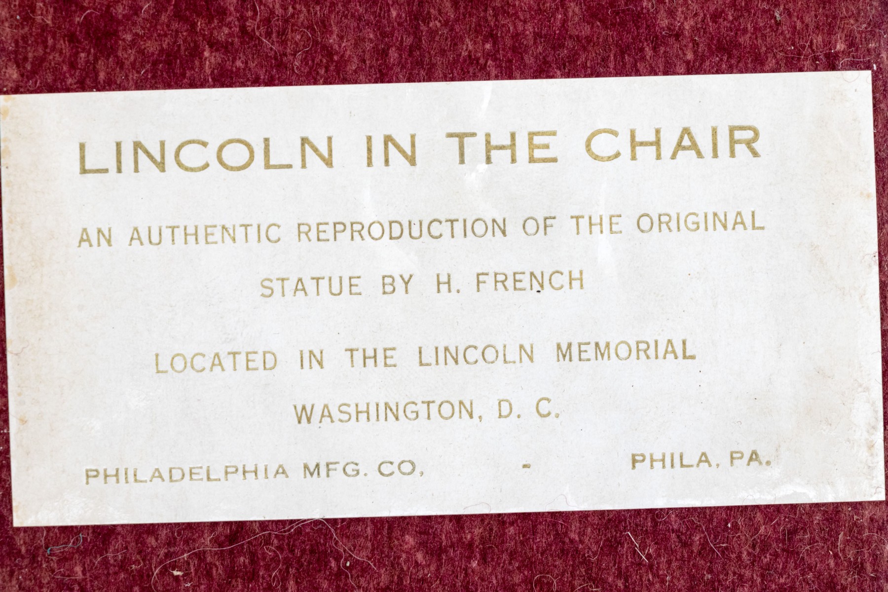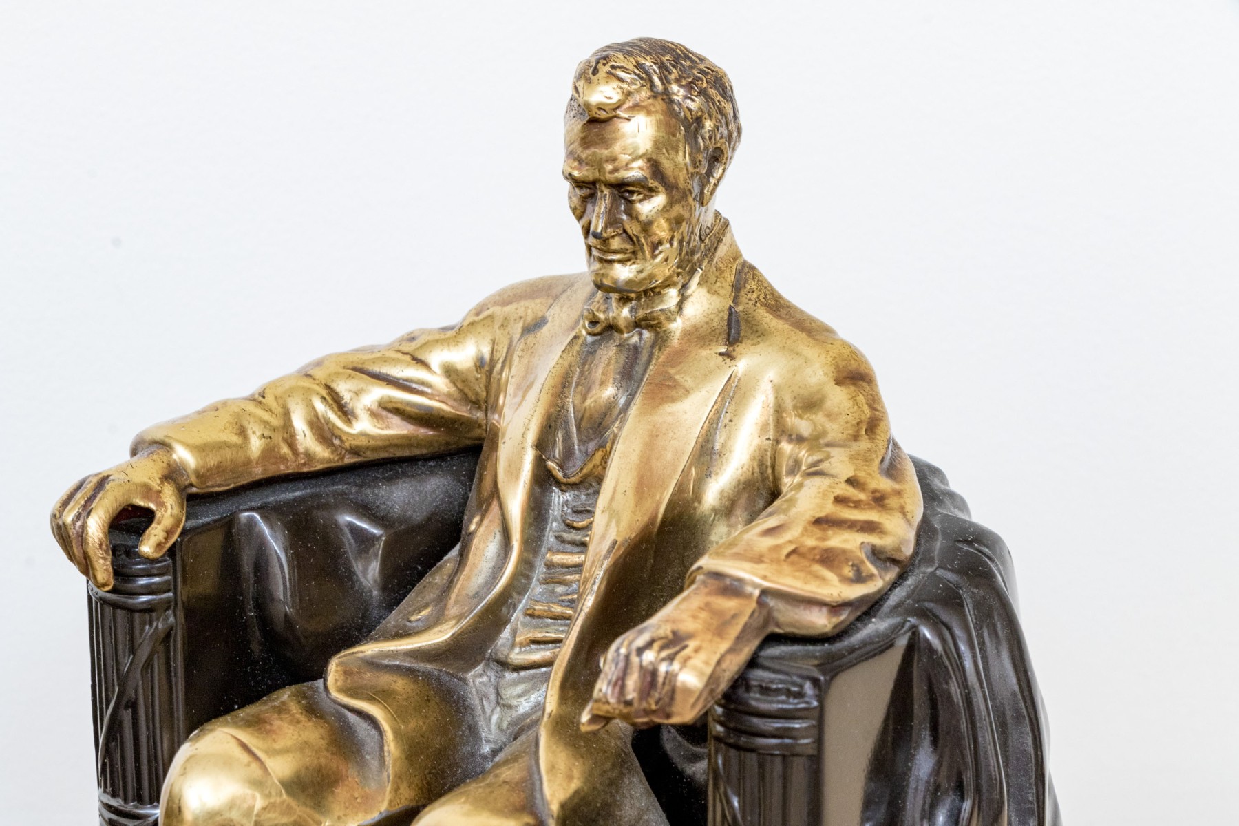 A wonderful pair of vintage Philadelphia Mfg. Co. reproduction statues or bookends of H. French "Lincoln in the Chair" depicting Abraham Lincoln sitting in a stately armchair draped along the back. Lincoln is finished in brass, while the chair is wonderfully finished in satin black. Manufacturer's label affixed to the underside.