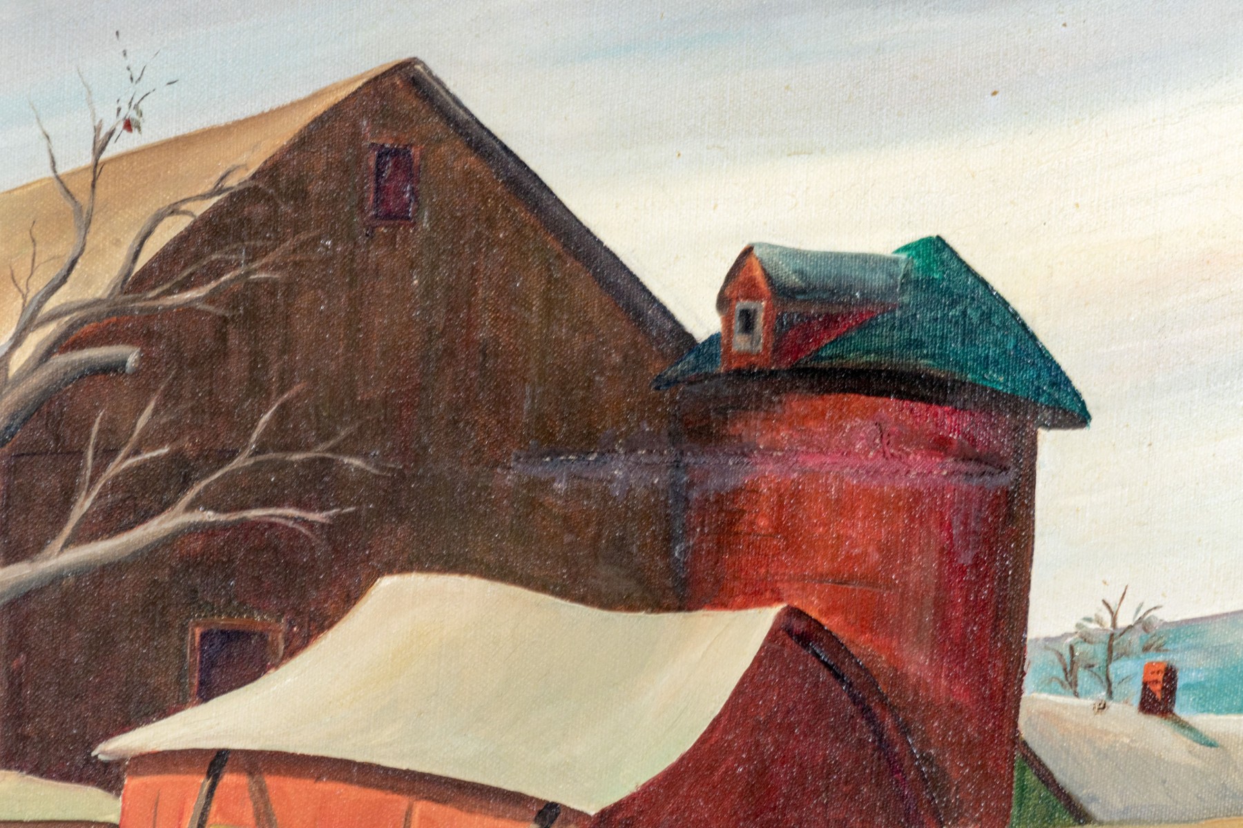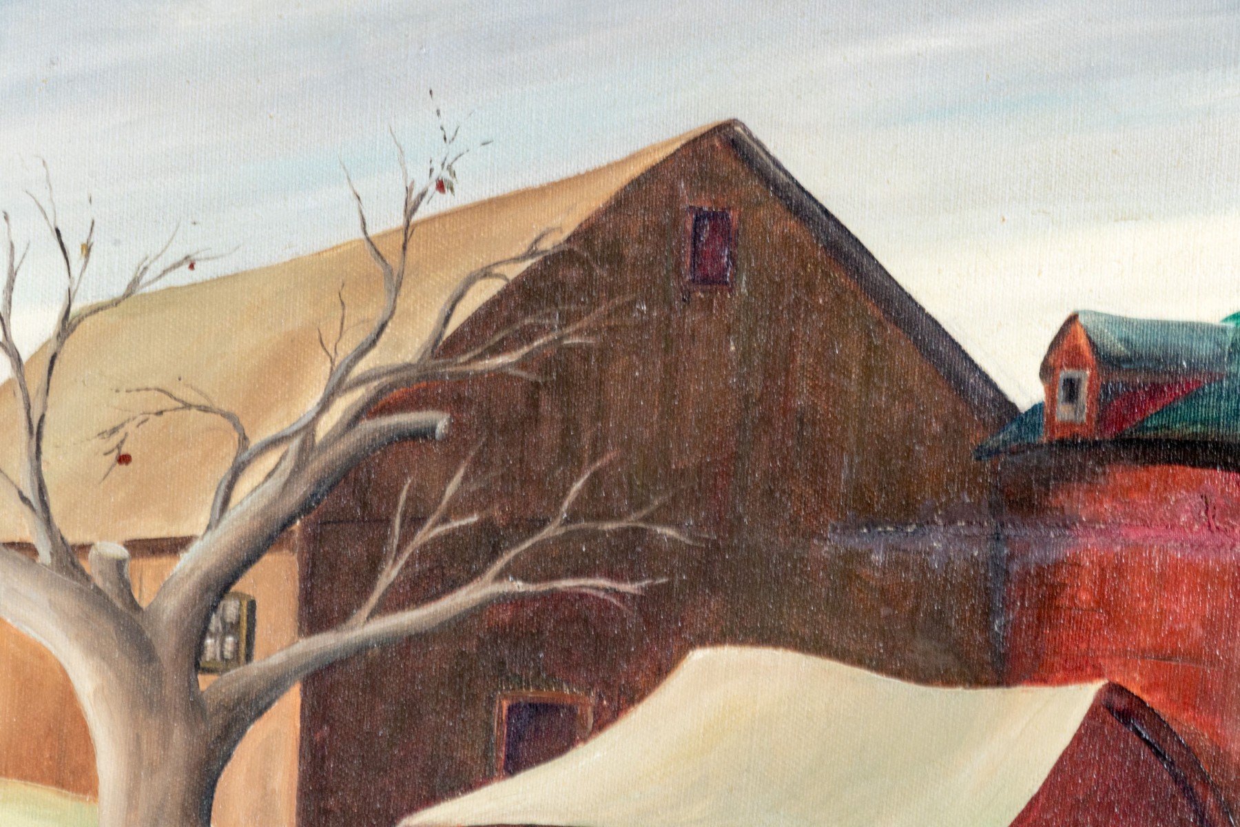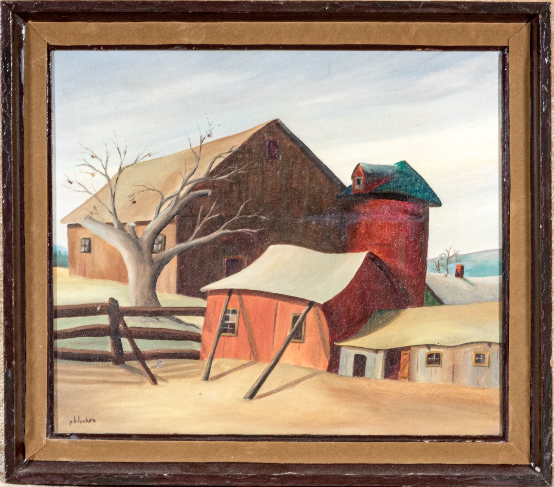 An oil on canvas depicting a barn scene signed lower left. Presented in a vintage wood frame with suede fillet.