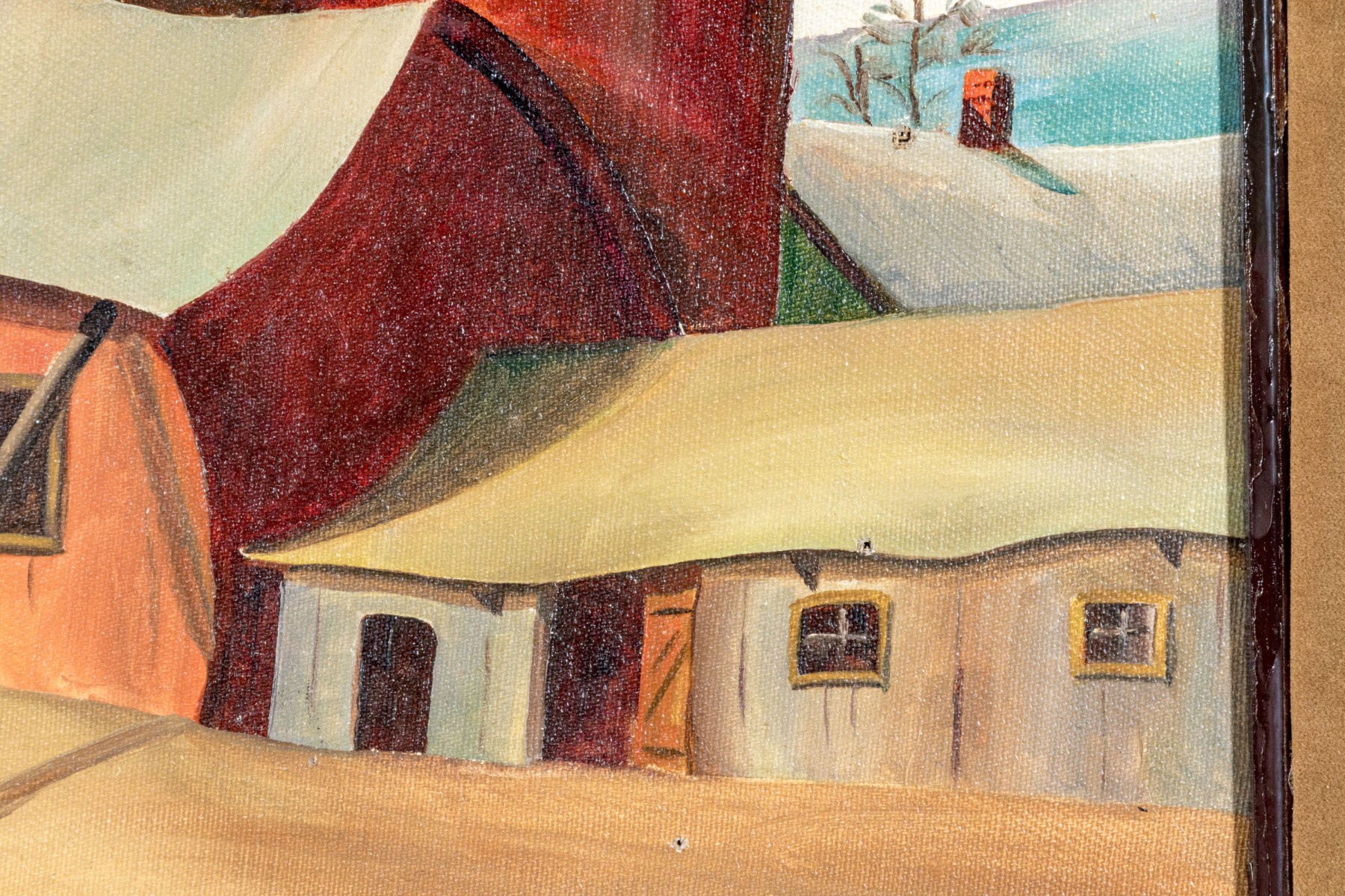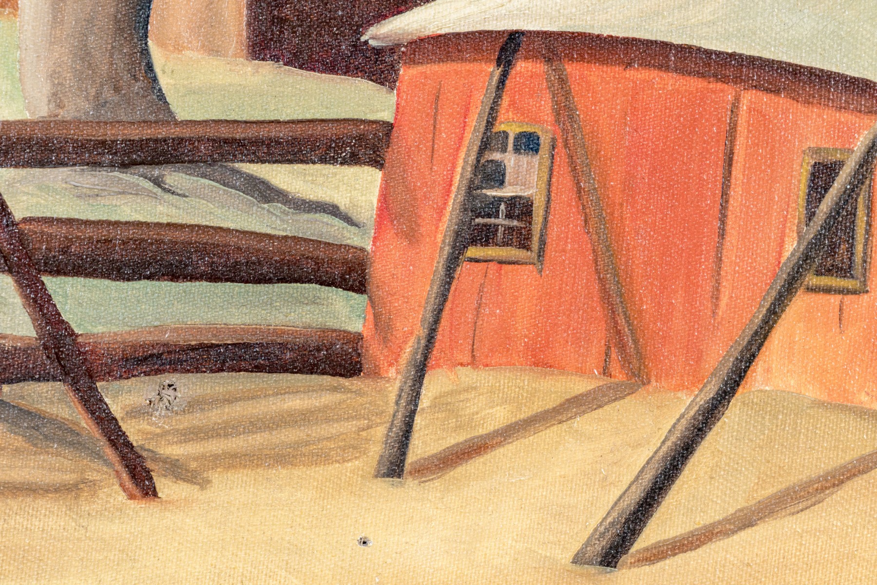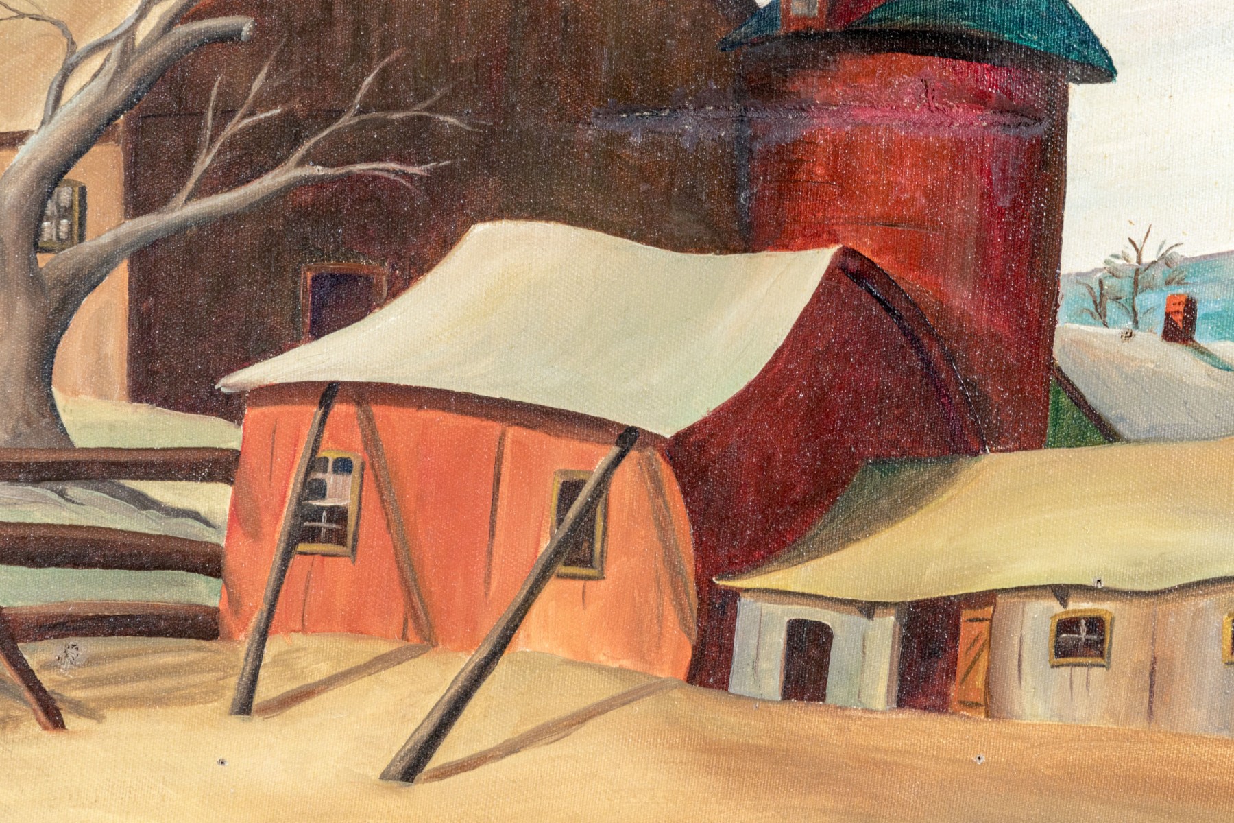 An oil on canvas depicting a barn scene signed lower left. Presented in a vintage wood frame with suede fillet.