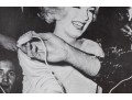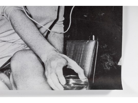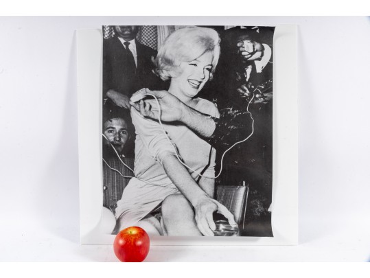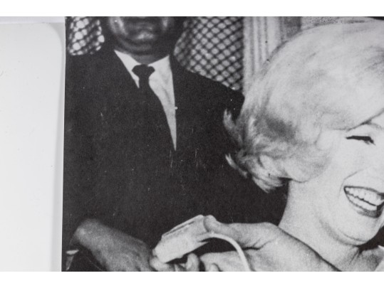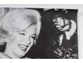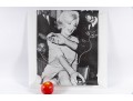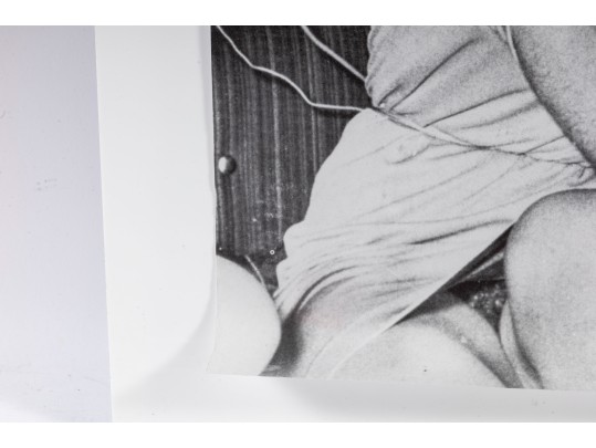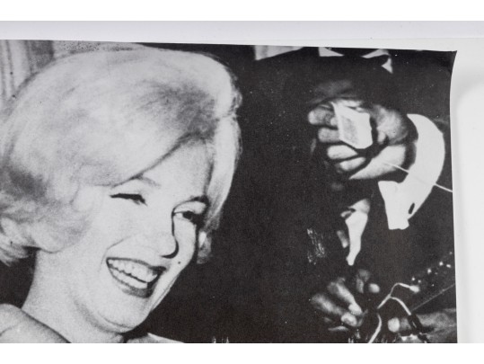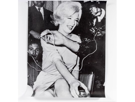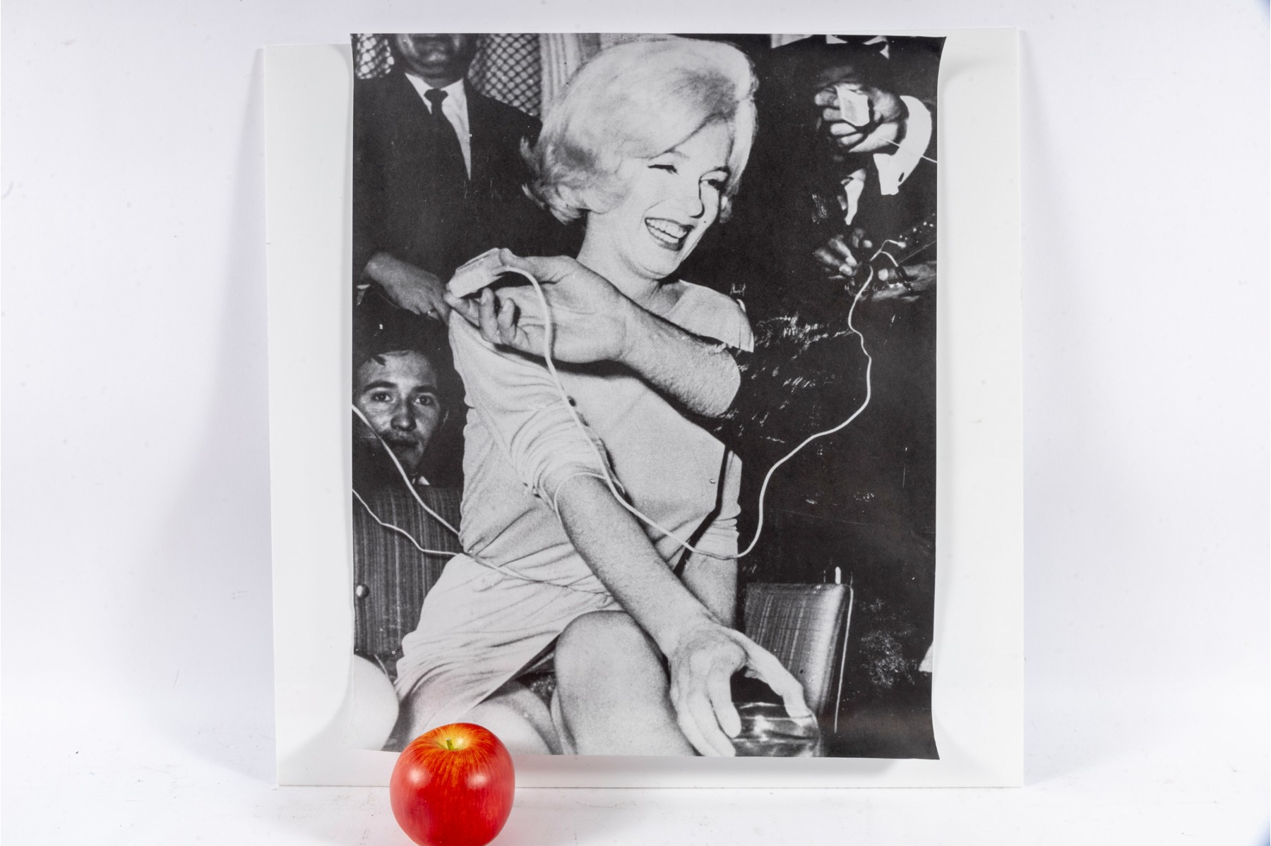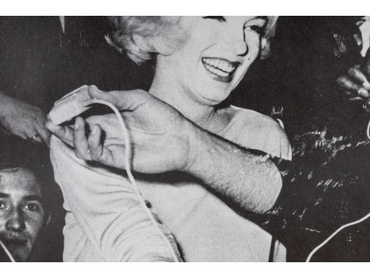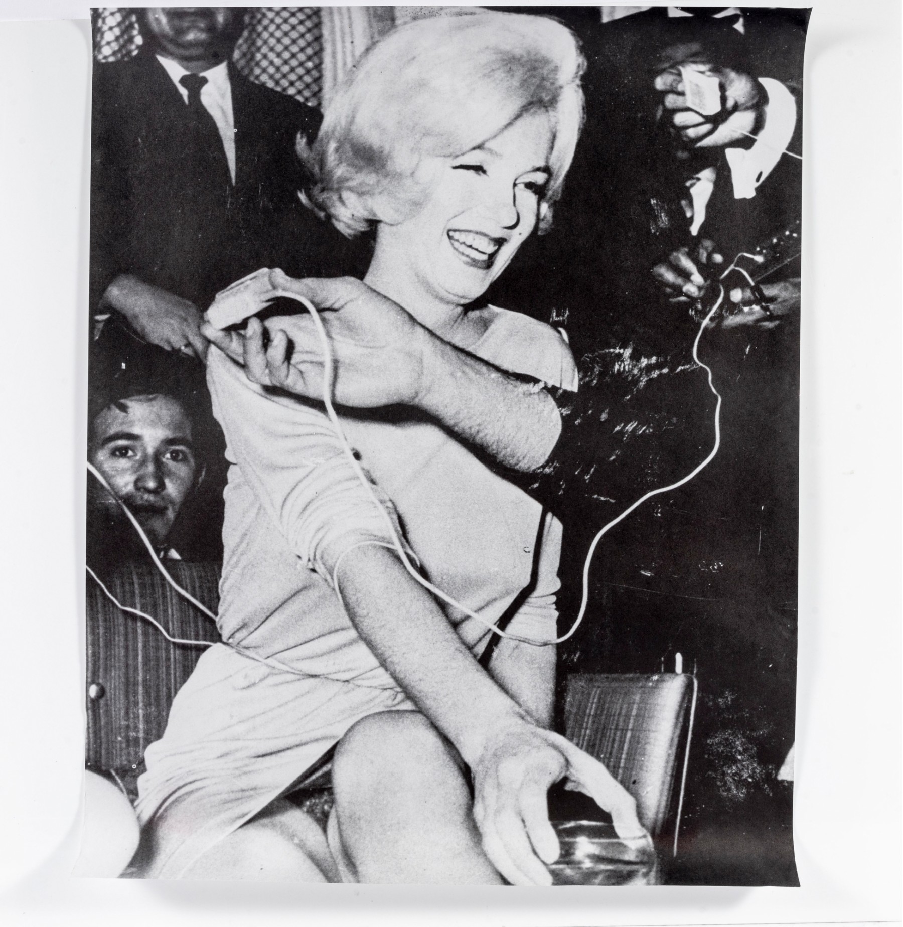 A black and white print depicting Marilyn Monroe as photographed by Antonio Caballero. Marilyn sits with a gleeful expression while surrounded by a group of men holding wired devices. Unframed.