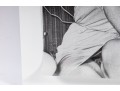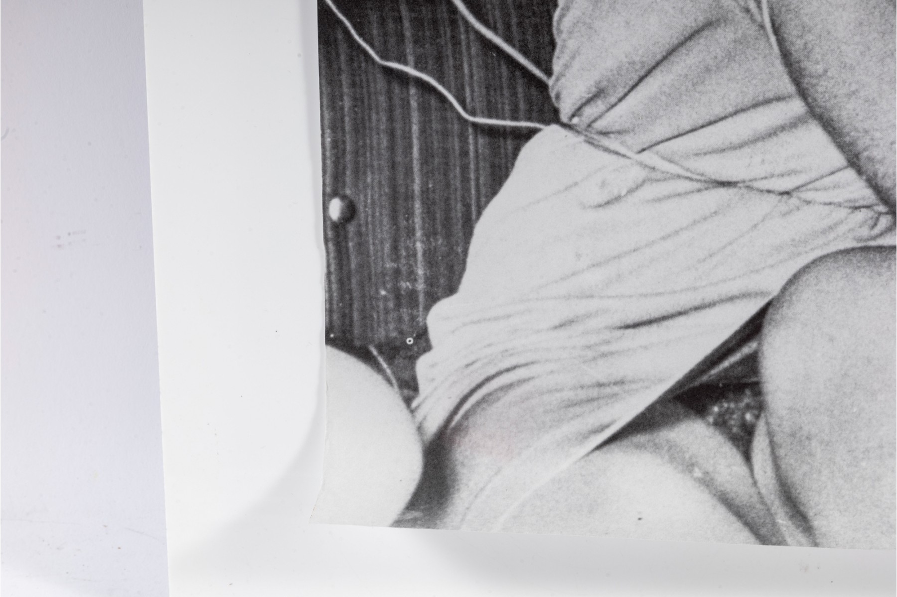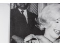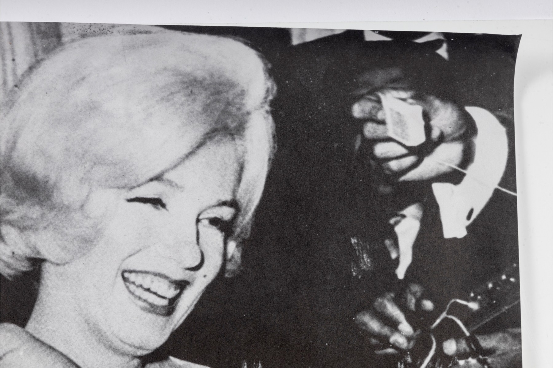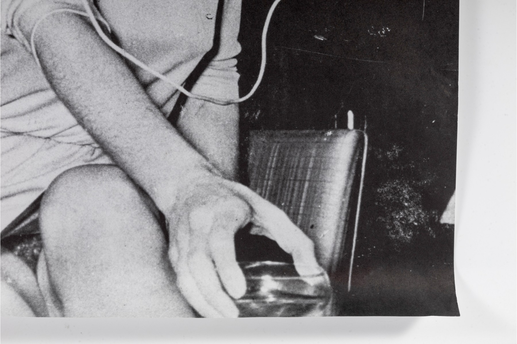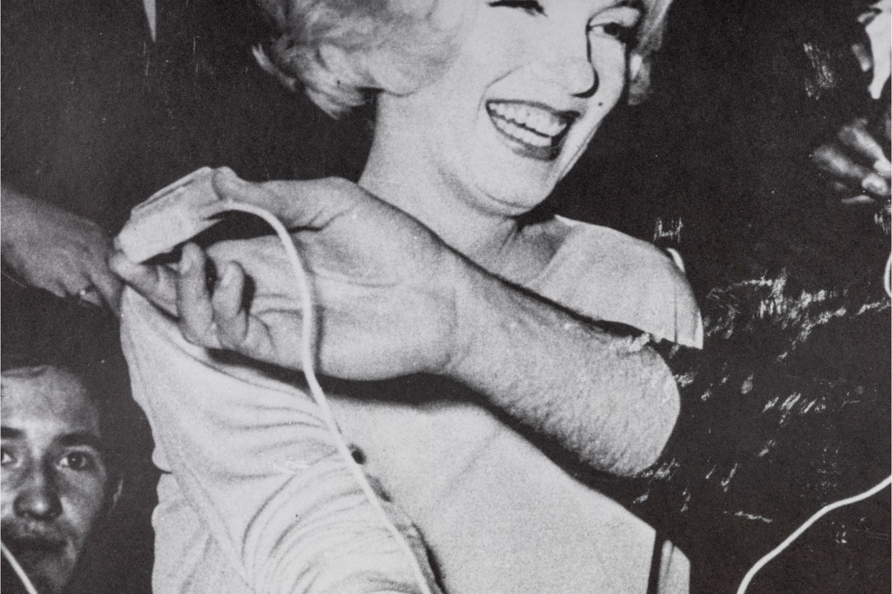 A black and white print depicting Marilyn Monroe as photographed by Antonio Caballero. Marilyn sits with a gleeful expression while surrounded by a group of men holding wired devices. Unframed.