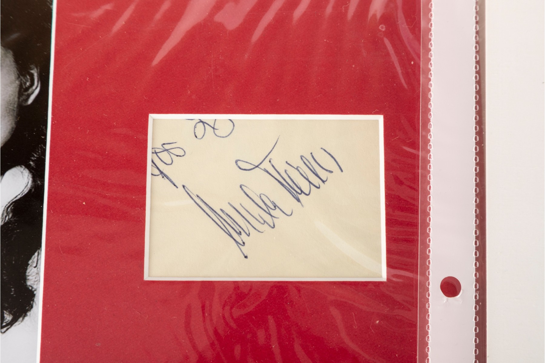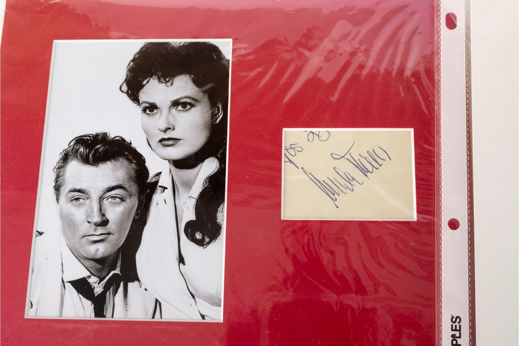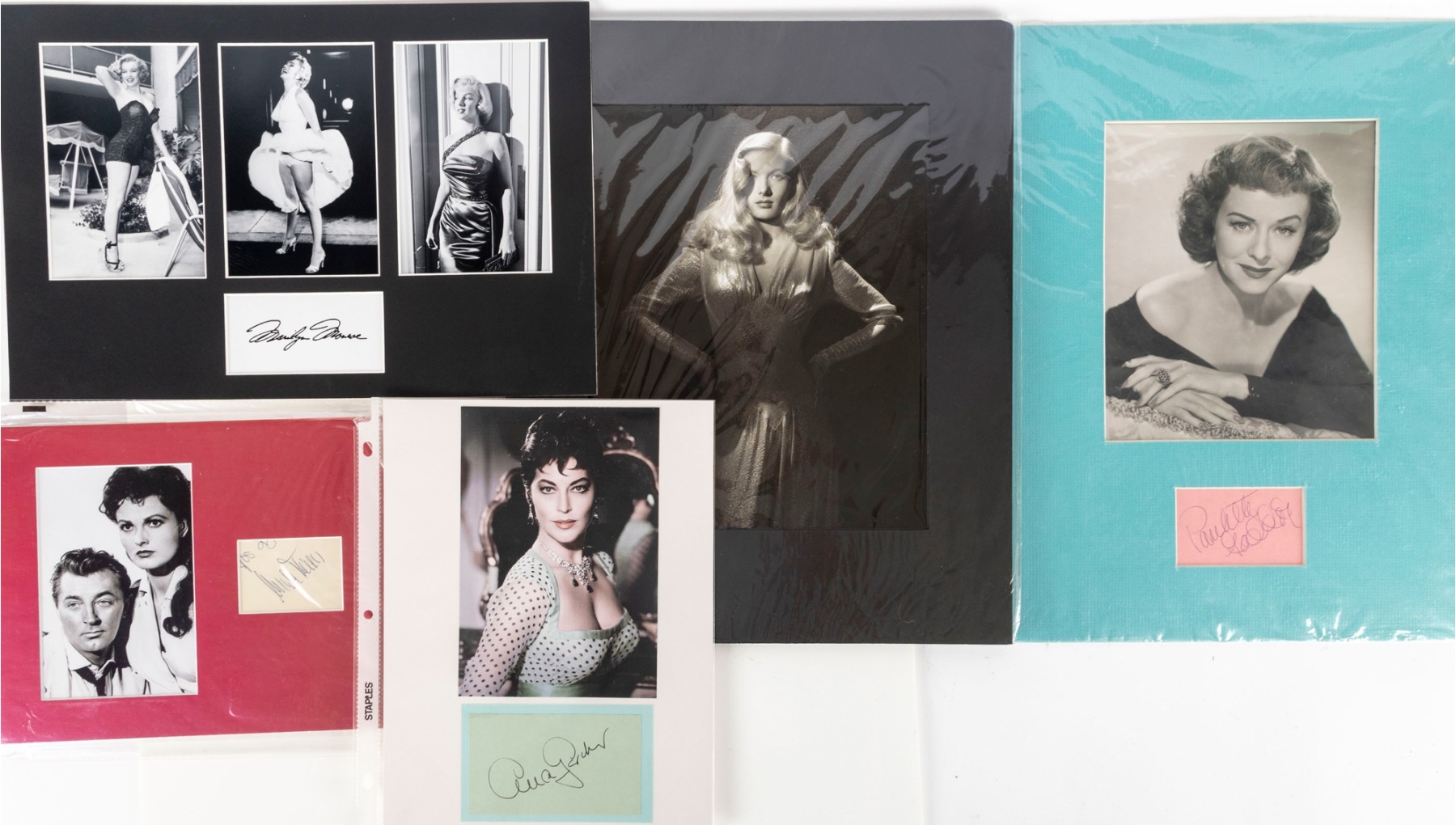 A fantastic collection of photographs of actresses with autographs including Marilyn Monroe, Ursula Thiess and Robert Mitchum, Paulette Goddard and Ava Gardner. Includes a photograph of Veronica Lake. Autographs have not been authenticated. All displayed matted, unframed.