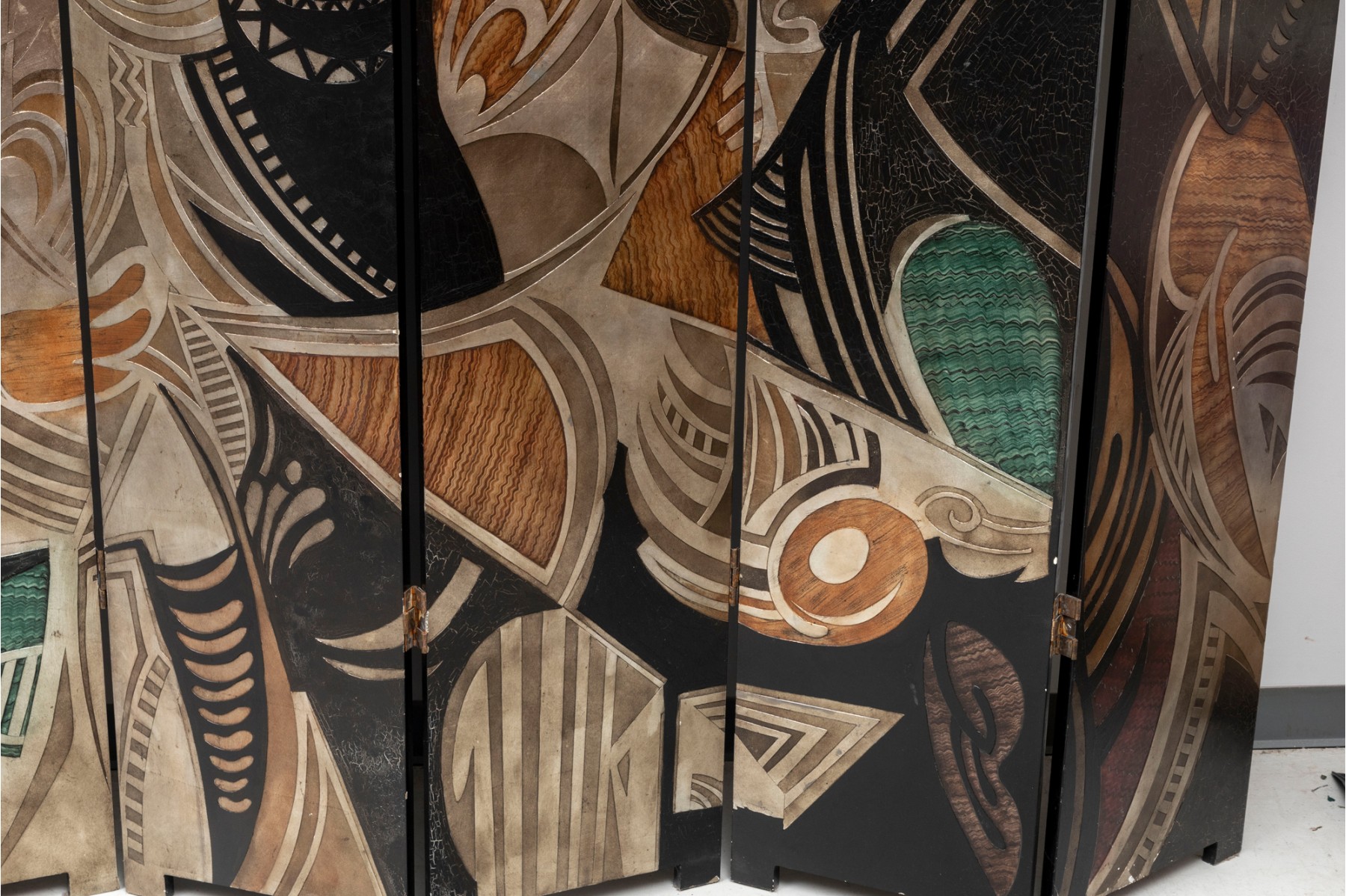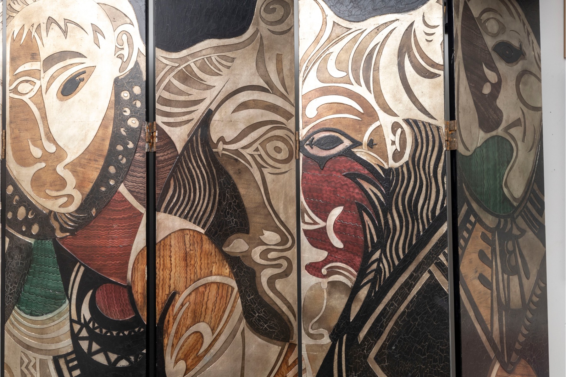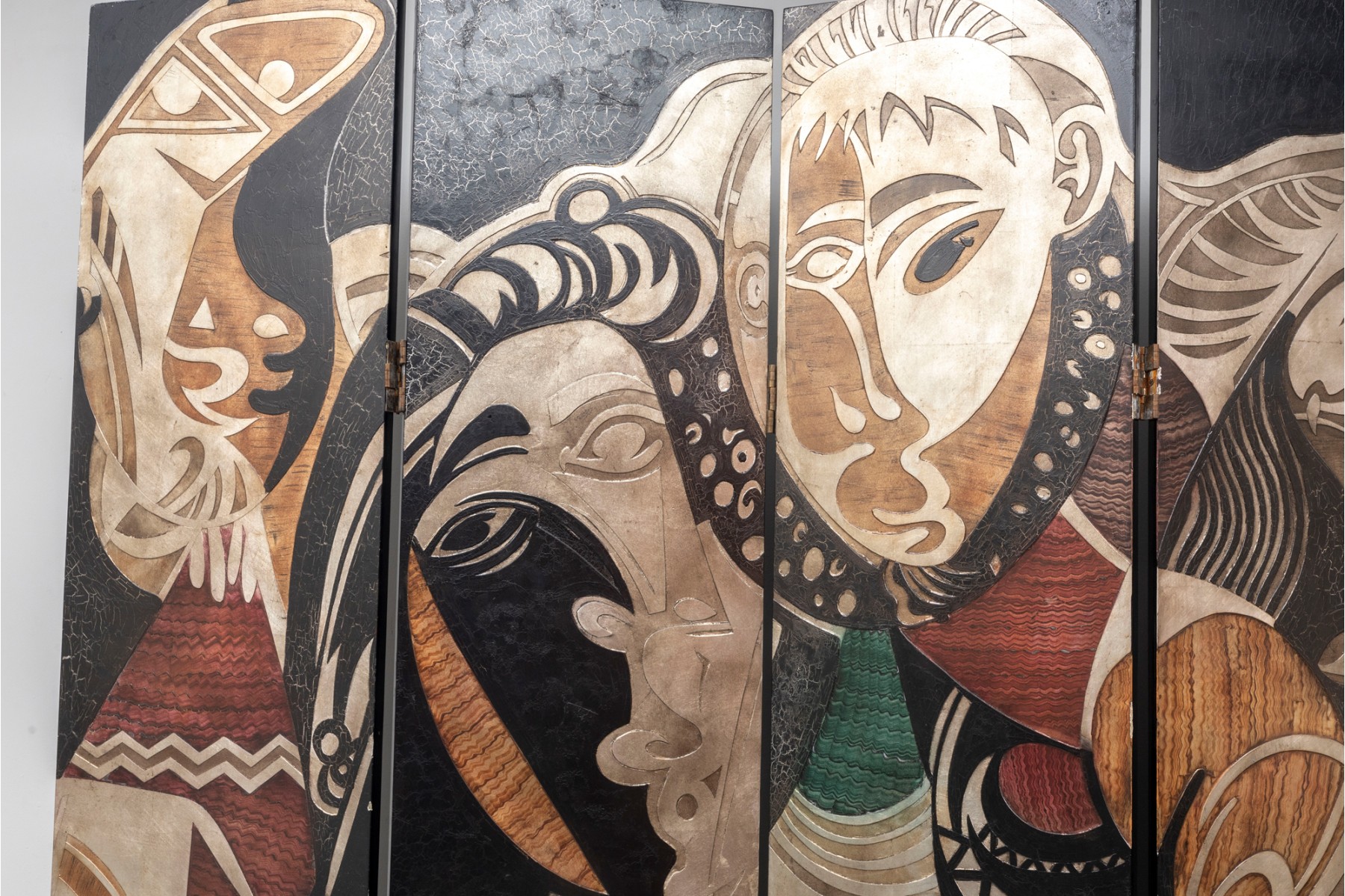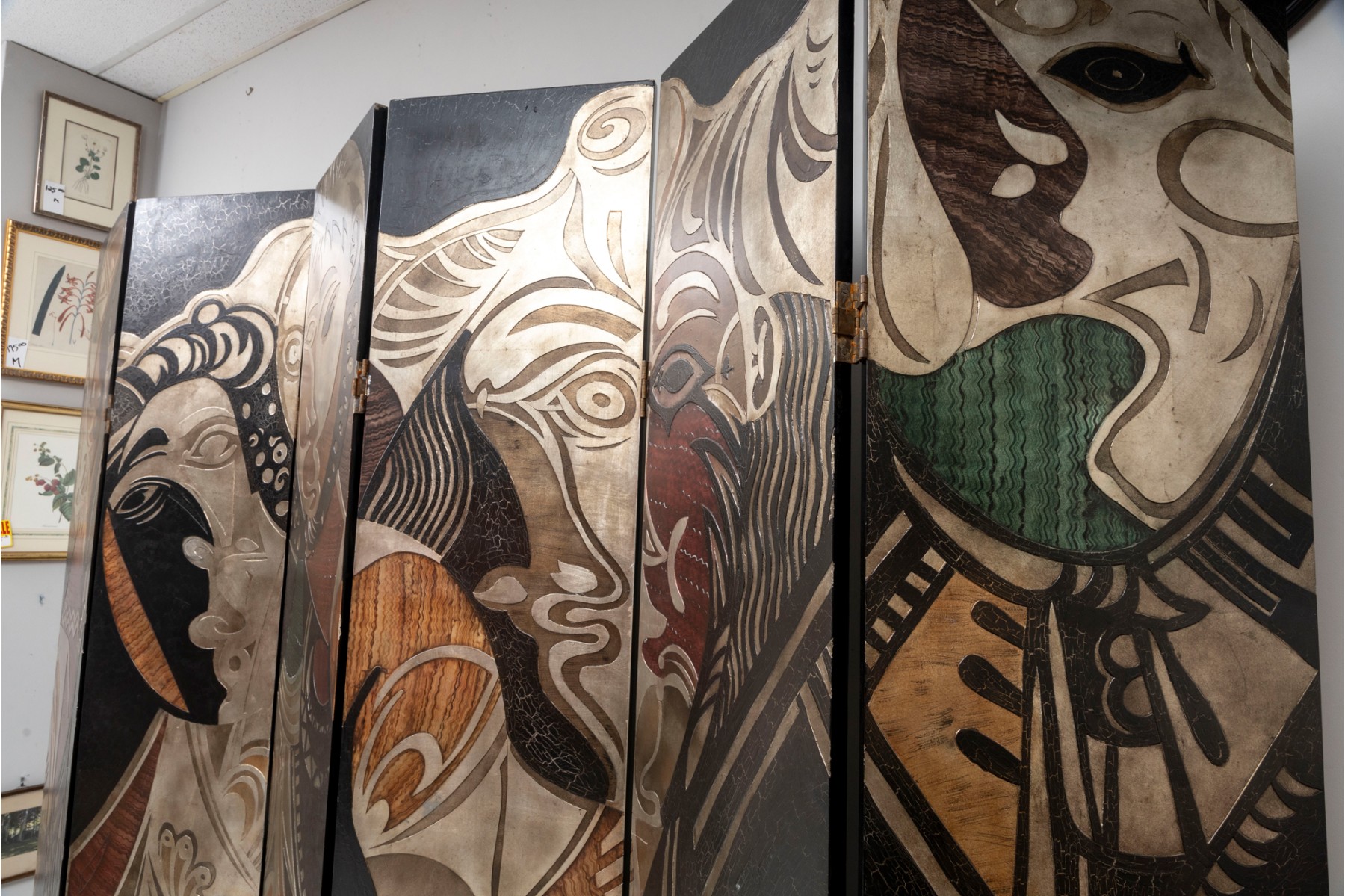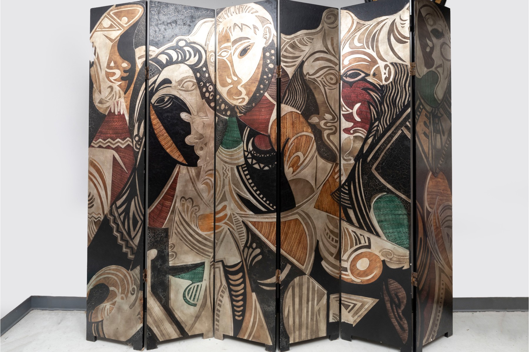 A large, 82" tall wood panel divider finely painted with Picasso-inspired designs and cubist methods -- fully abstract with vague forms and expressions throughout. Six hinged panels in total.