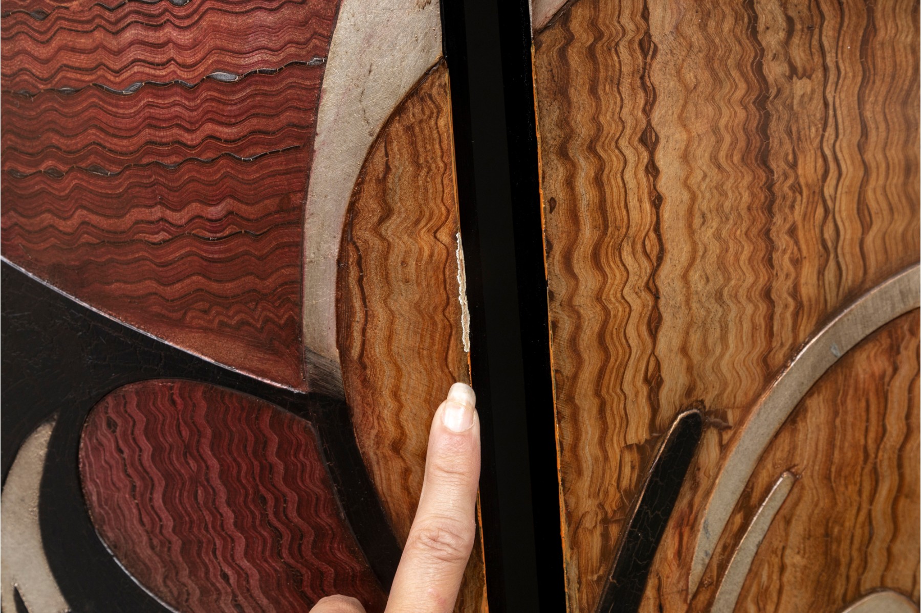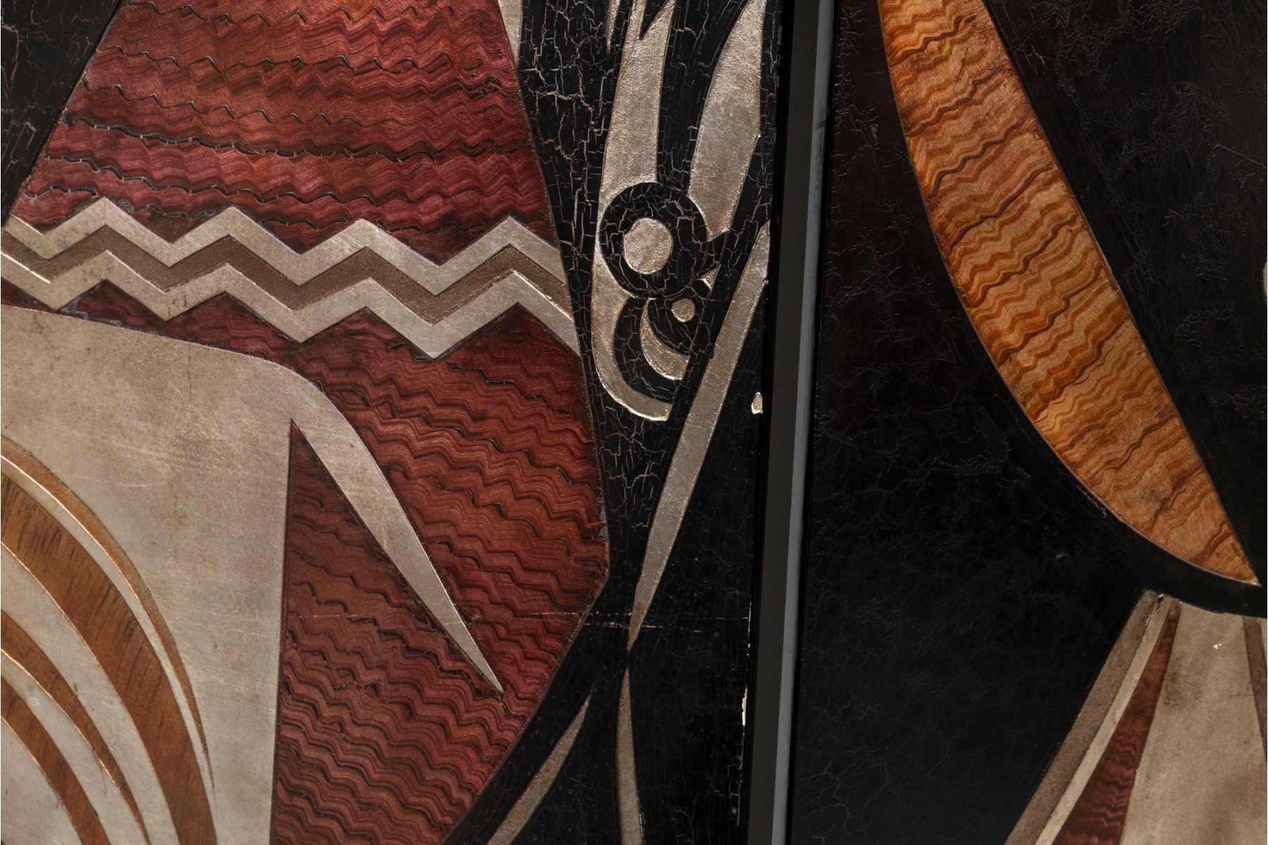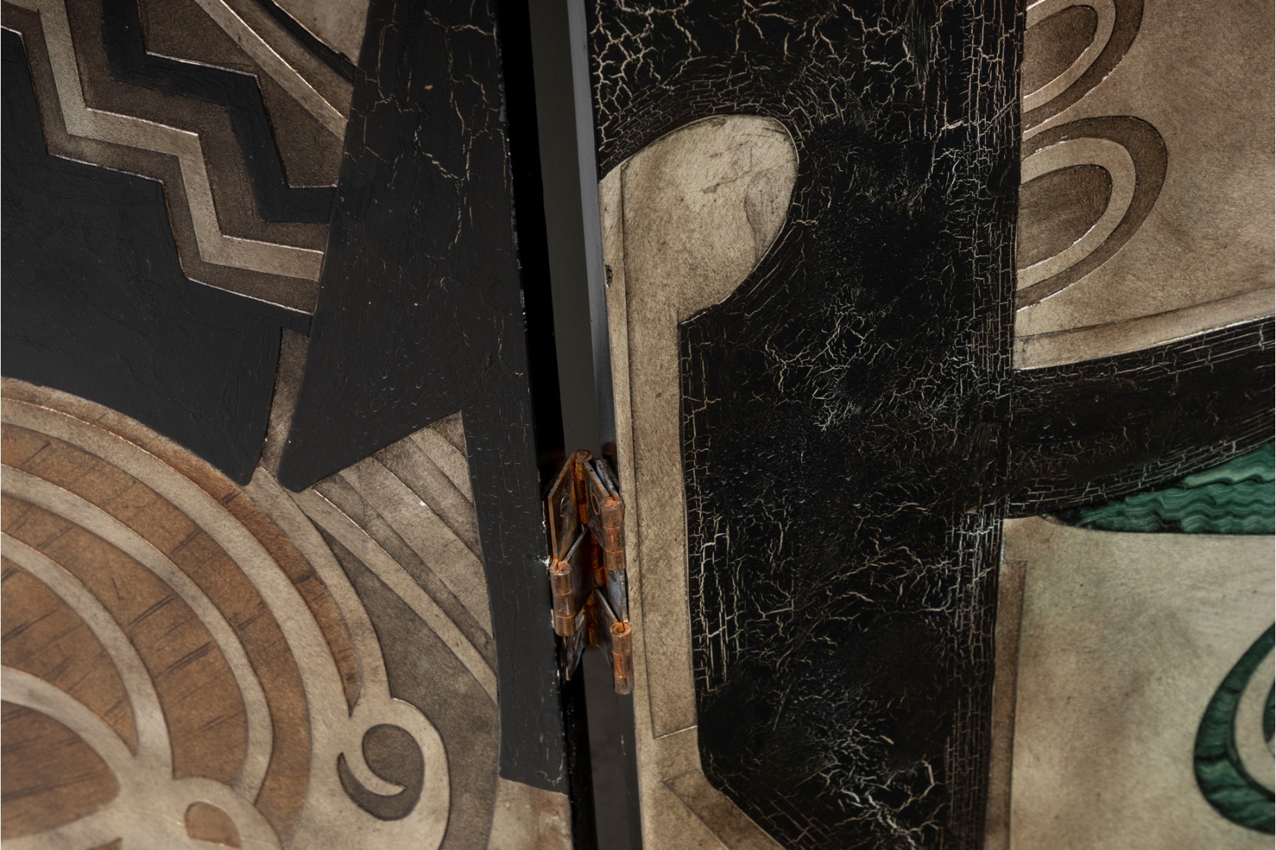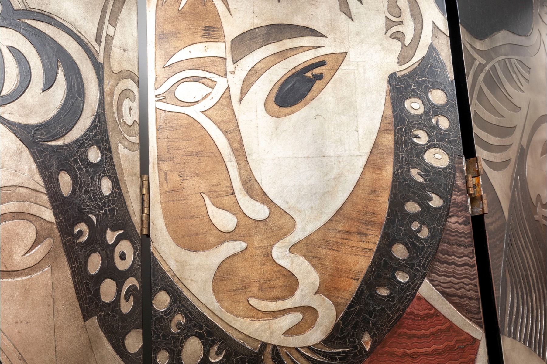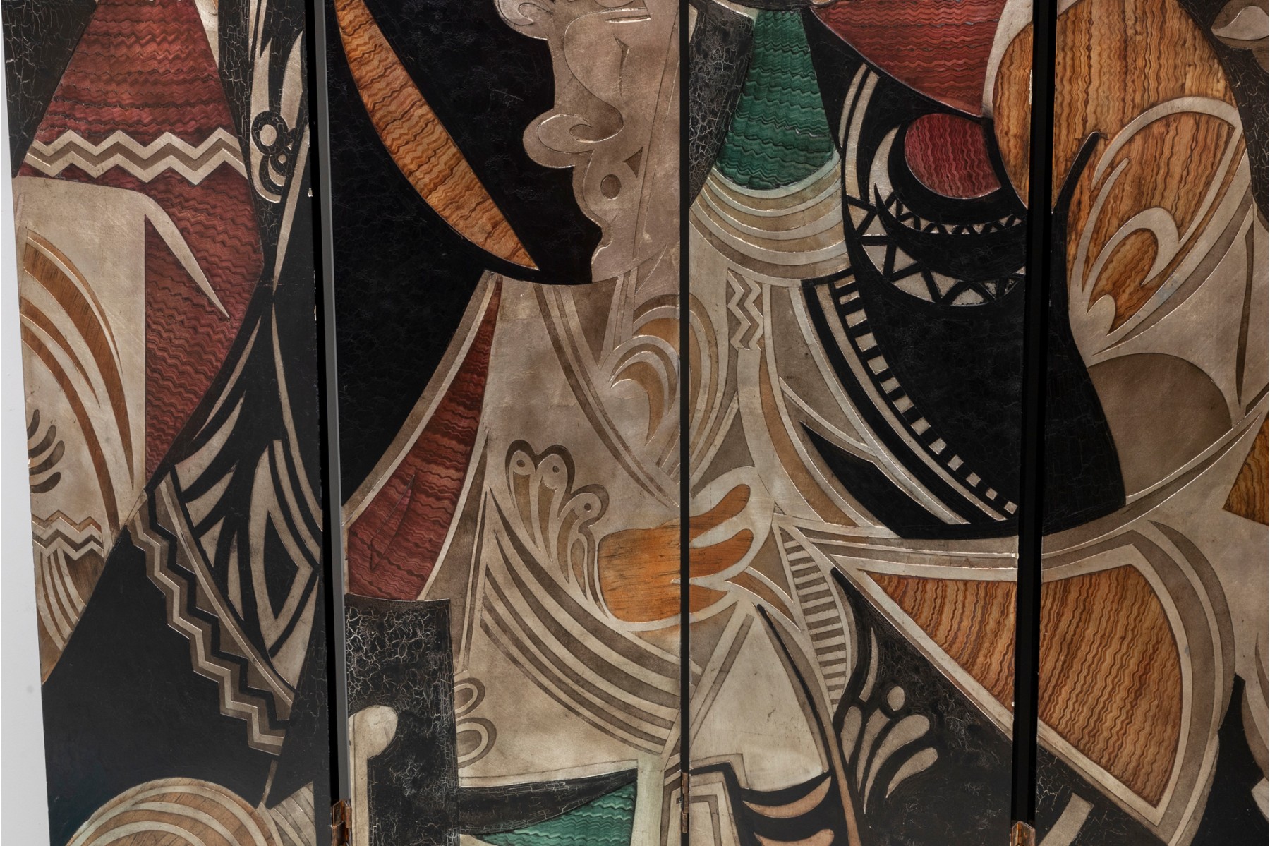 A large, 82" tall wood panel divider finely painted with Picasso-inspired designs and cubist methods -- fully abstract with vague forms and expressions throughout. Six hinged panels in total.