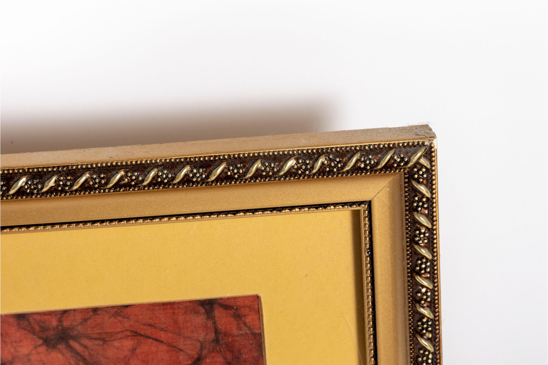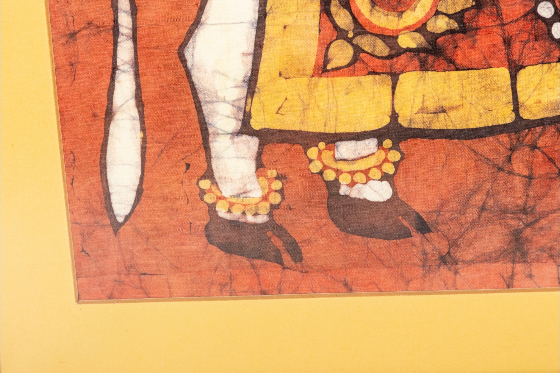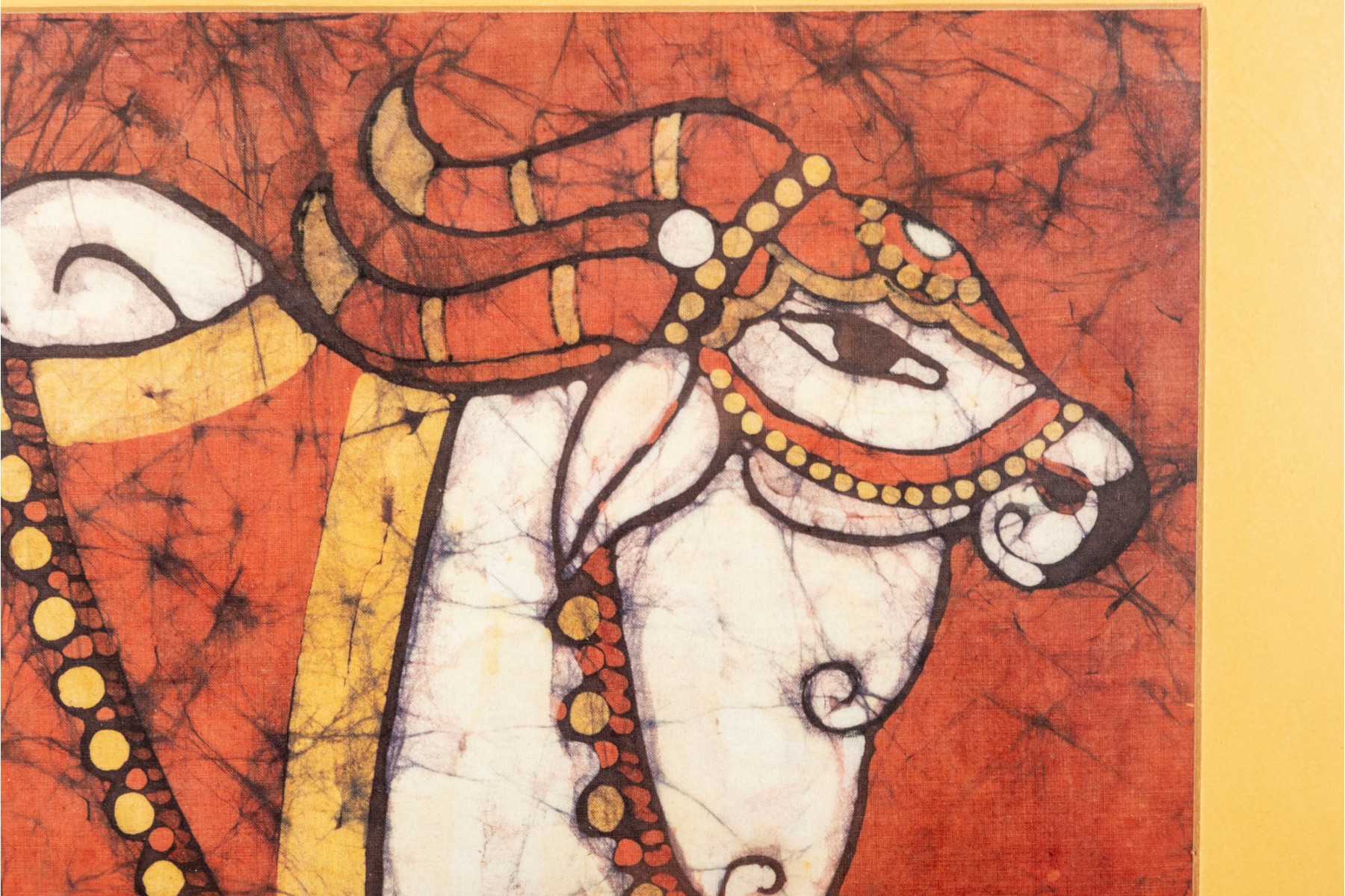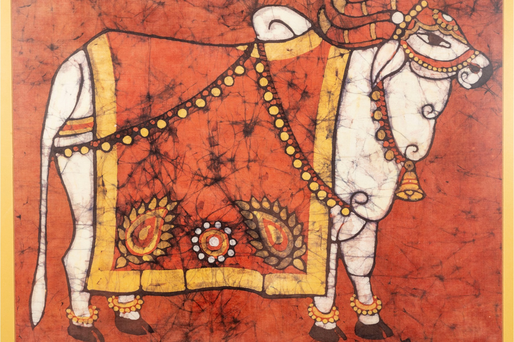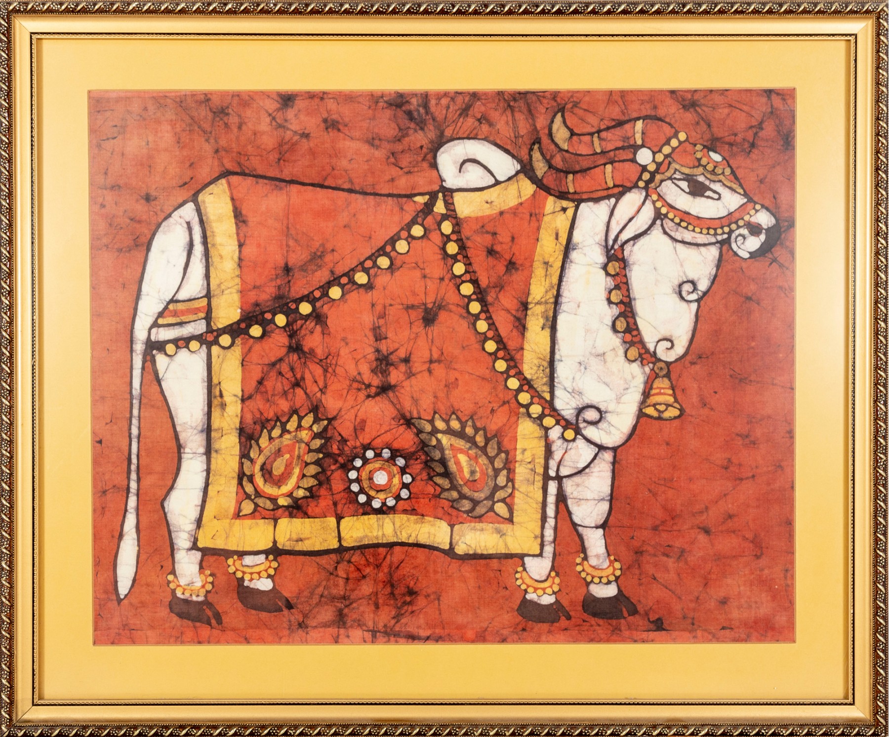 A traditional cloth Pichwai painting. The highly decorated depiction of a cow in Pichwai paintings represents the prosperity that comes from a life devoted to Lord Krishna; the Hindu god of love, compassion, and protection. The piece is presented in a gold-tone wood frame with a glass facing, and accented by a single matte border.
