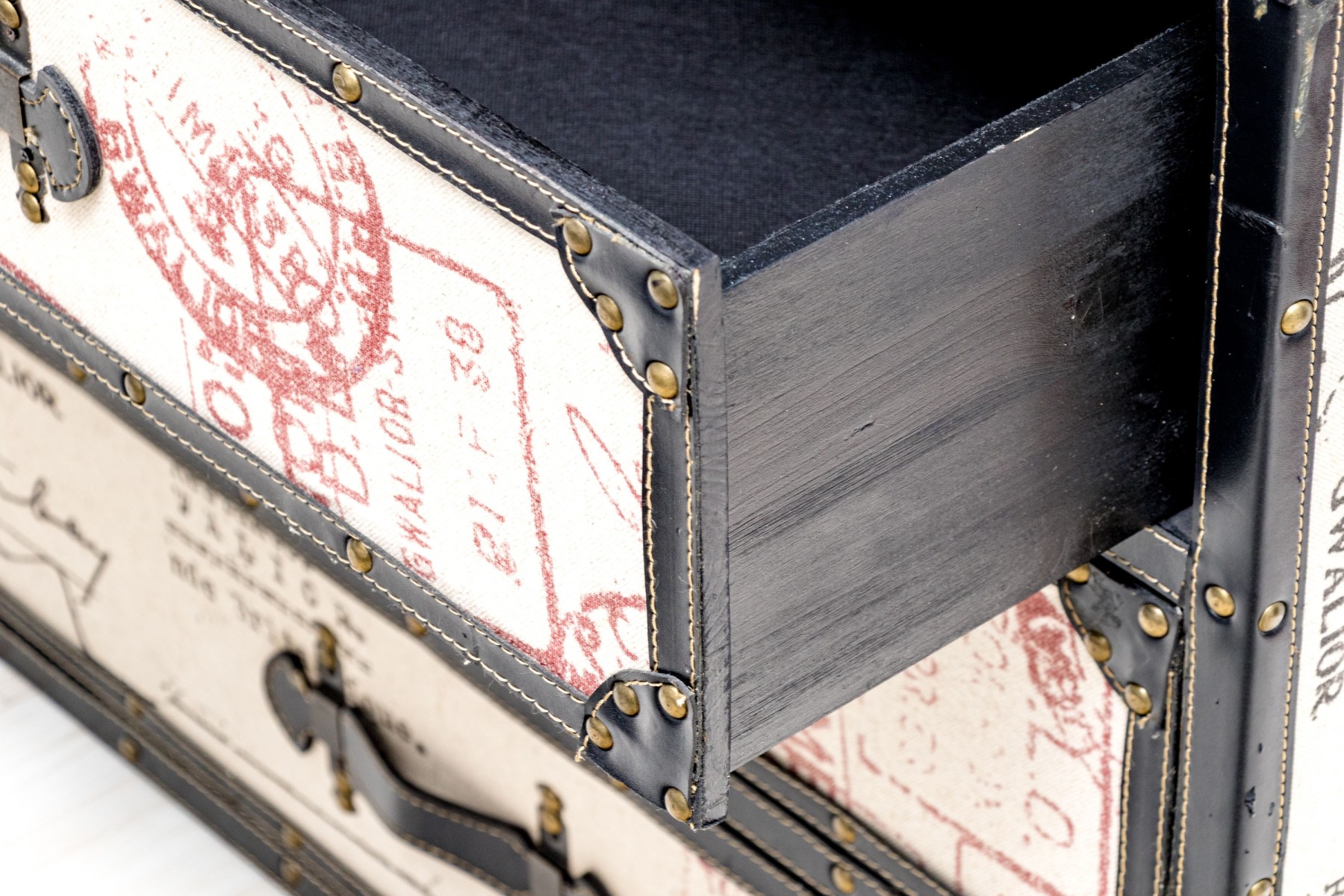 A delightfully decorative Pier 1 Imports "Rhodes" chest of drawers drawing inspiration from a classic travel trunk design. The chest features three drawers with black leatherette handles matching twin handles on the sides and wrapped edges with corner bracket sporting brass tacks throughout. The chest is finished in antiqued off-white with fun stamp motifs adding to the traveller aesthetic.