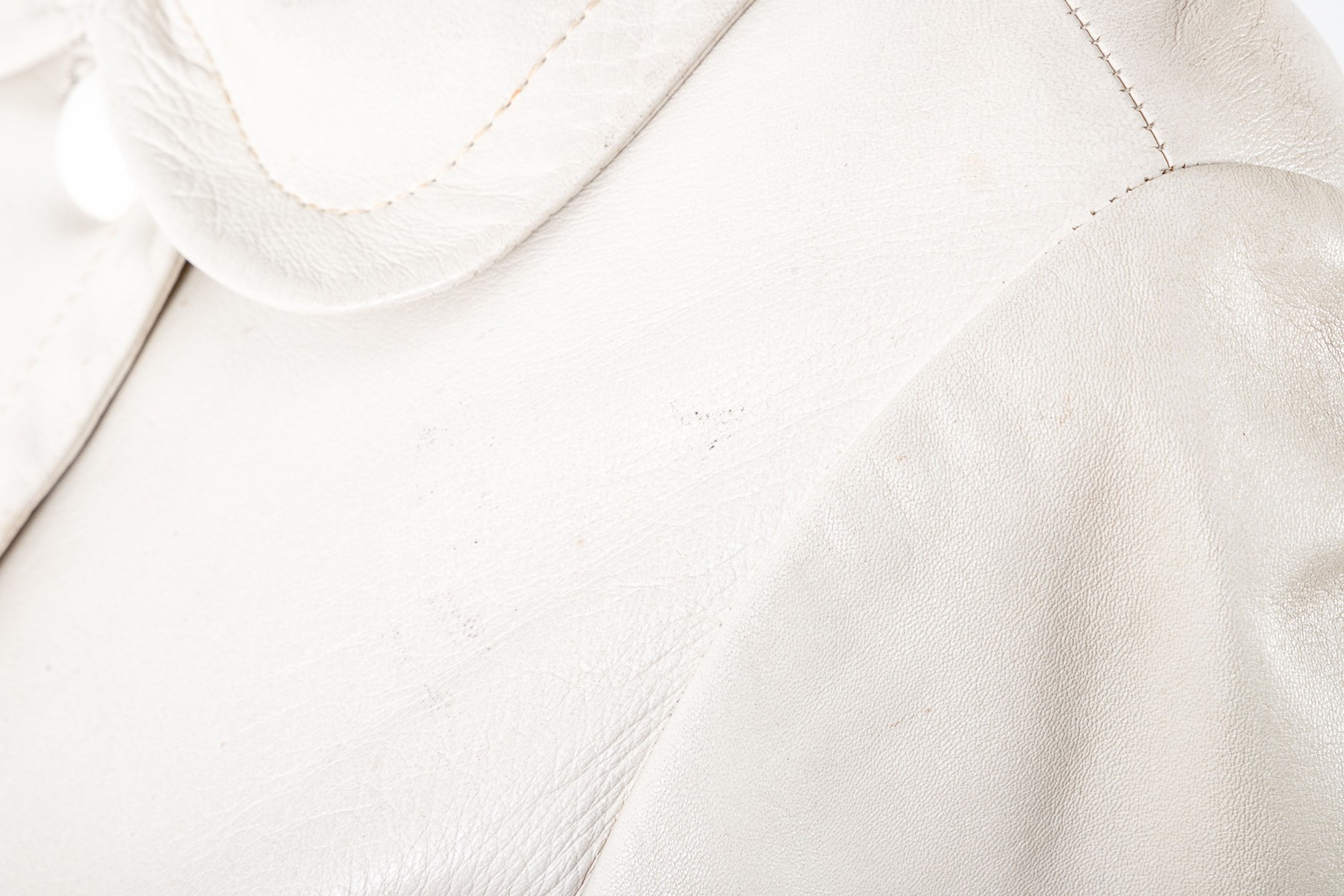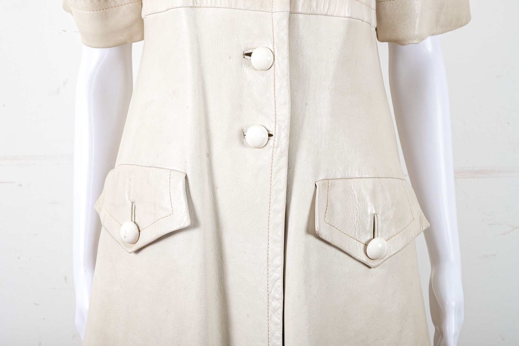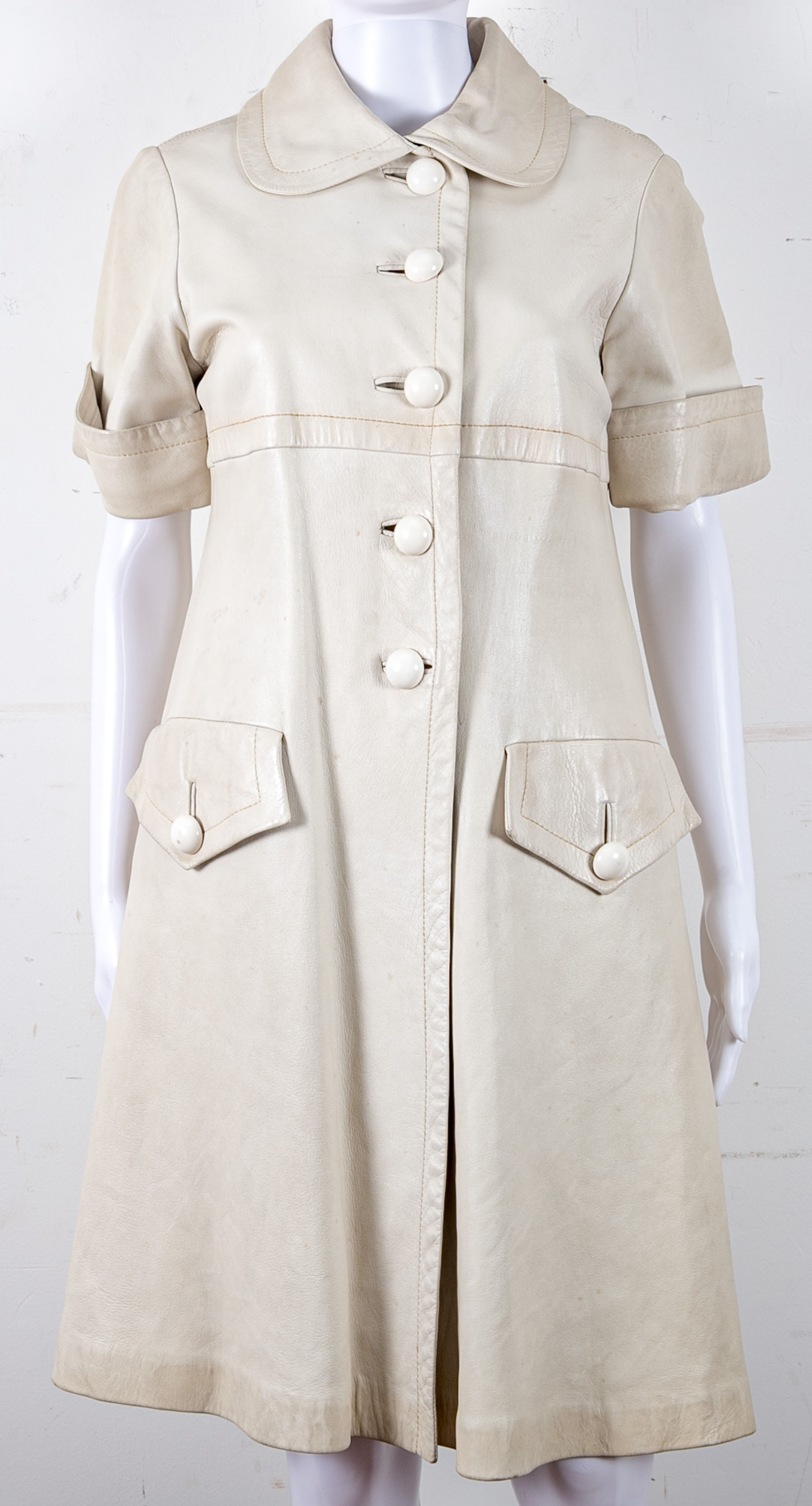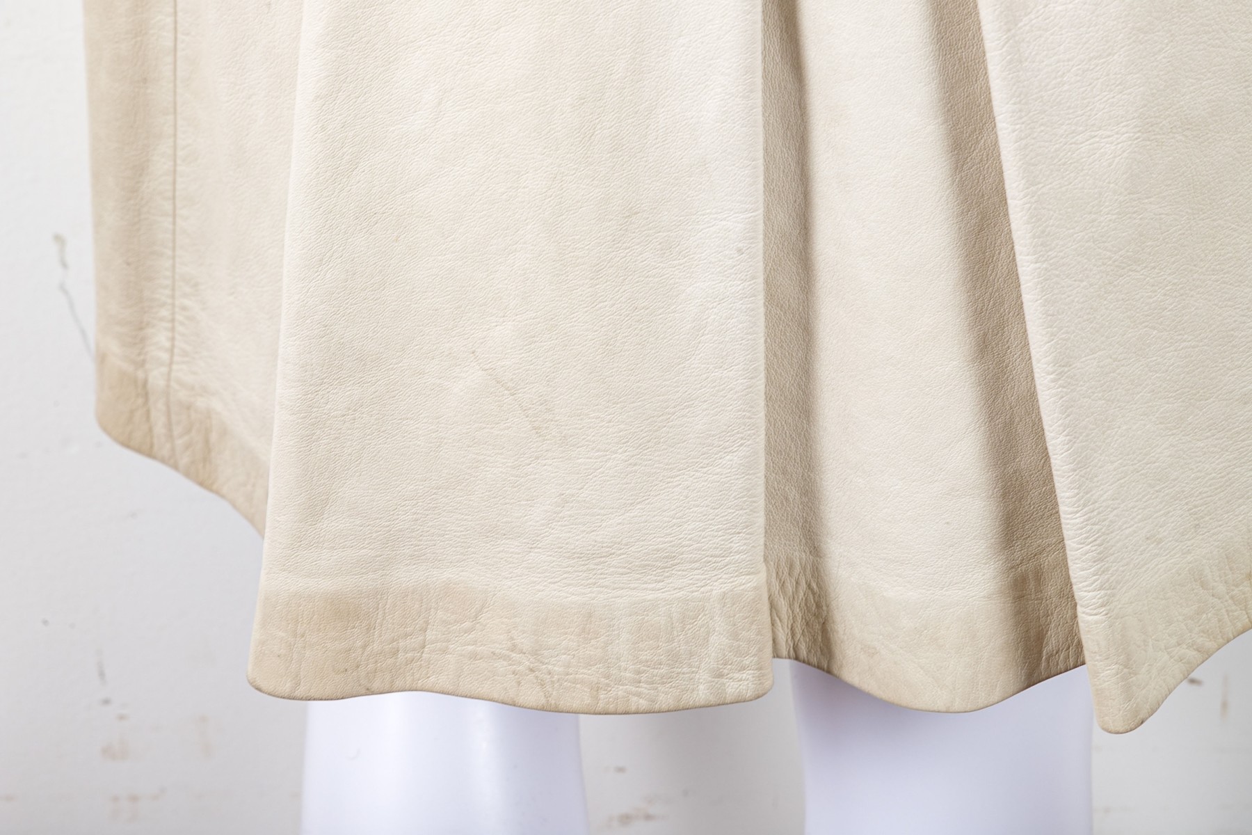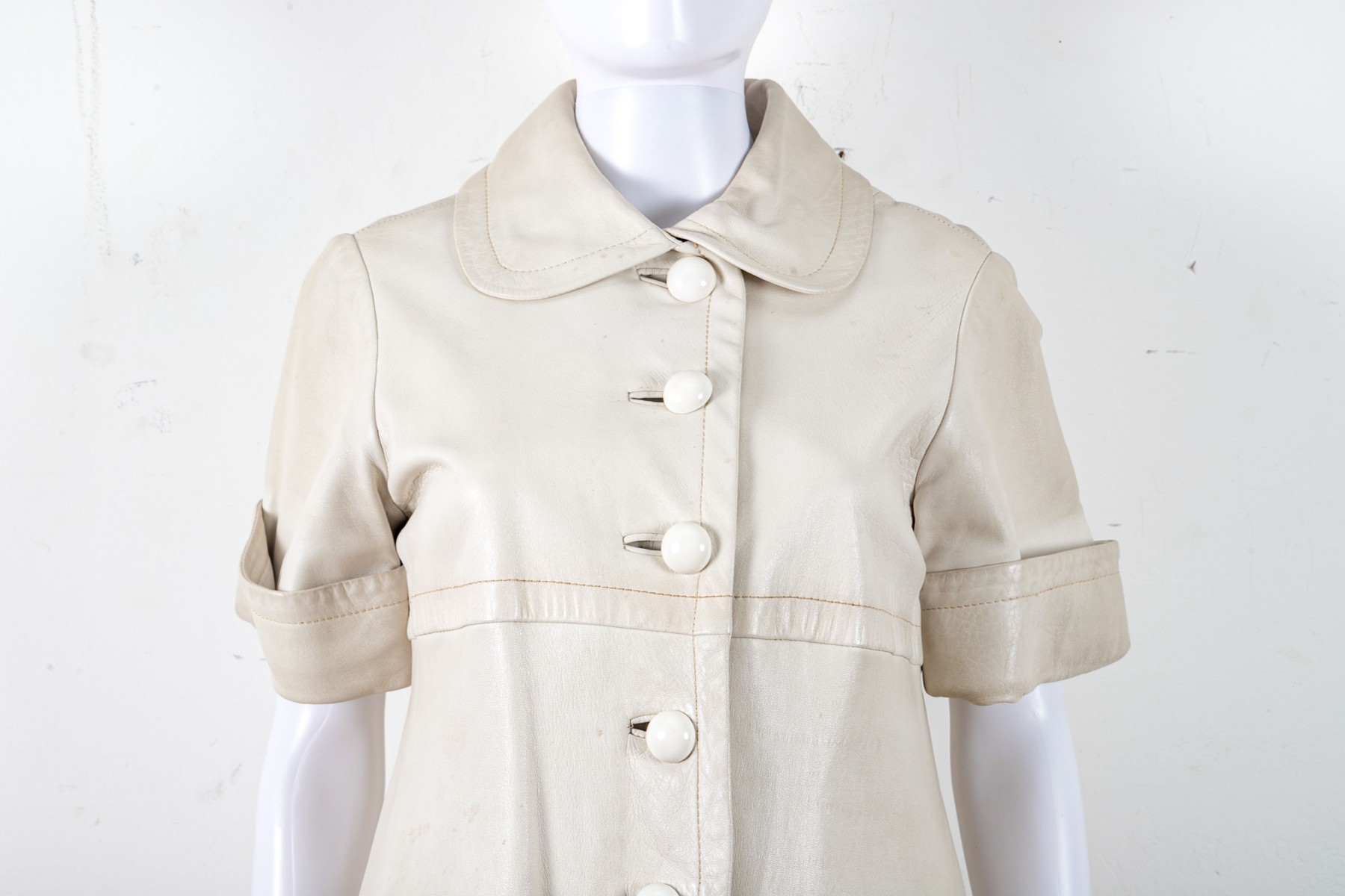 Pierre Cardin vintage trench coat in cream-white leather, featuring short rolled sleeves and a rounded collar for fun and feminine flare. Features a stitched empire-styled waist and large, domed buttons along the center front that compliment two flap pockets. The back is pleated for a flattering, stylish fit.