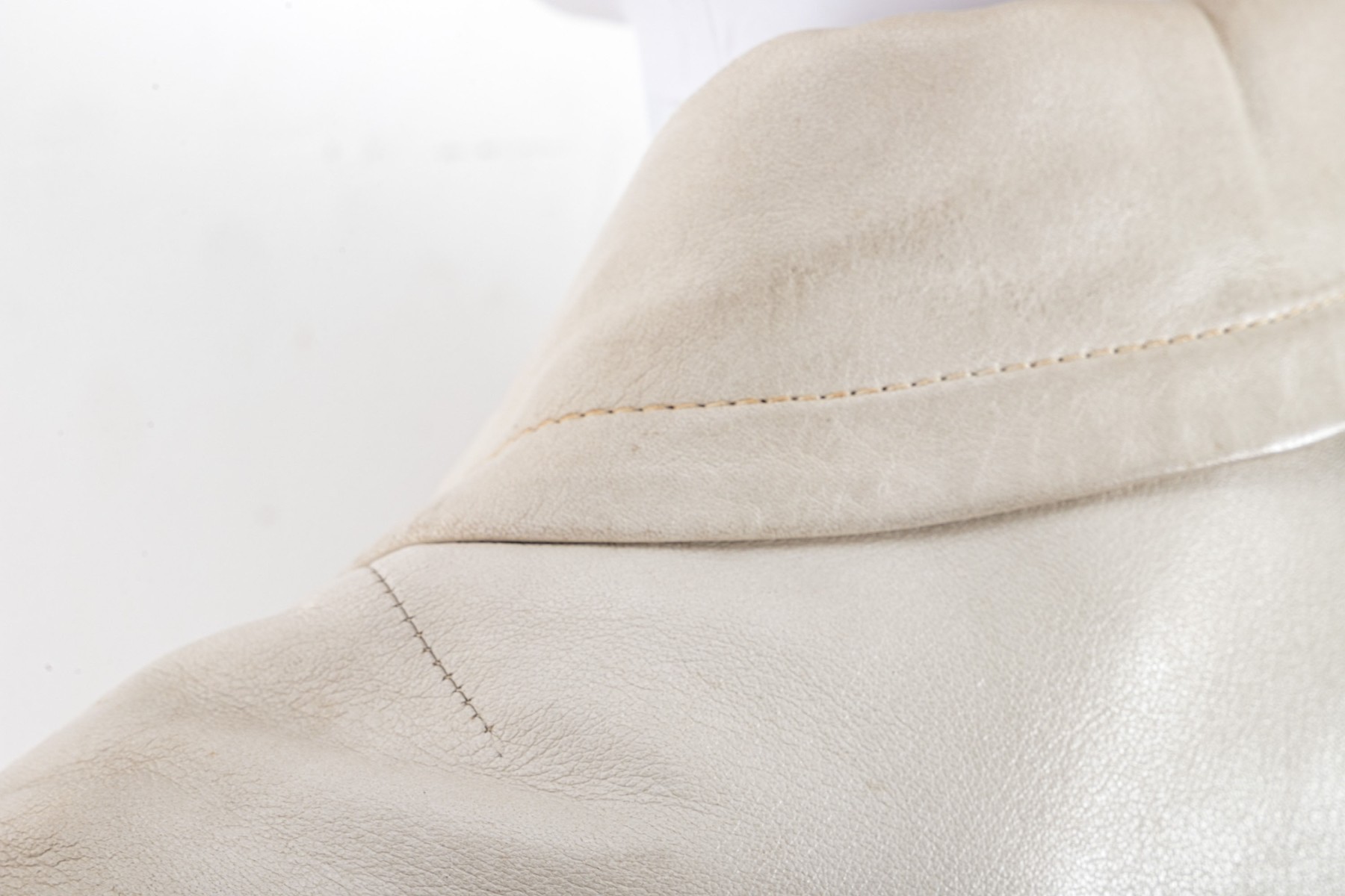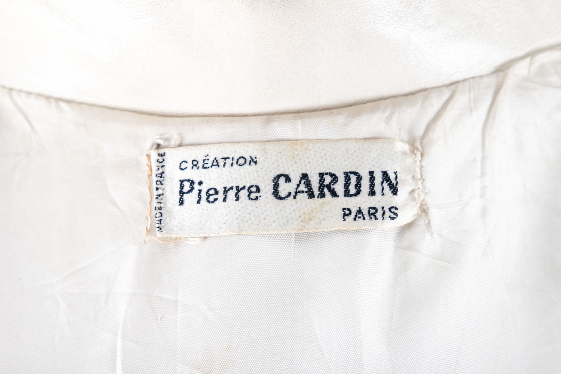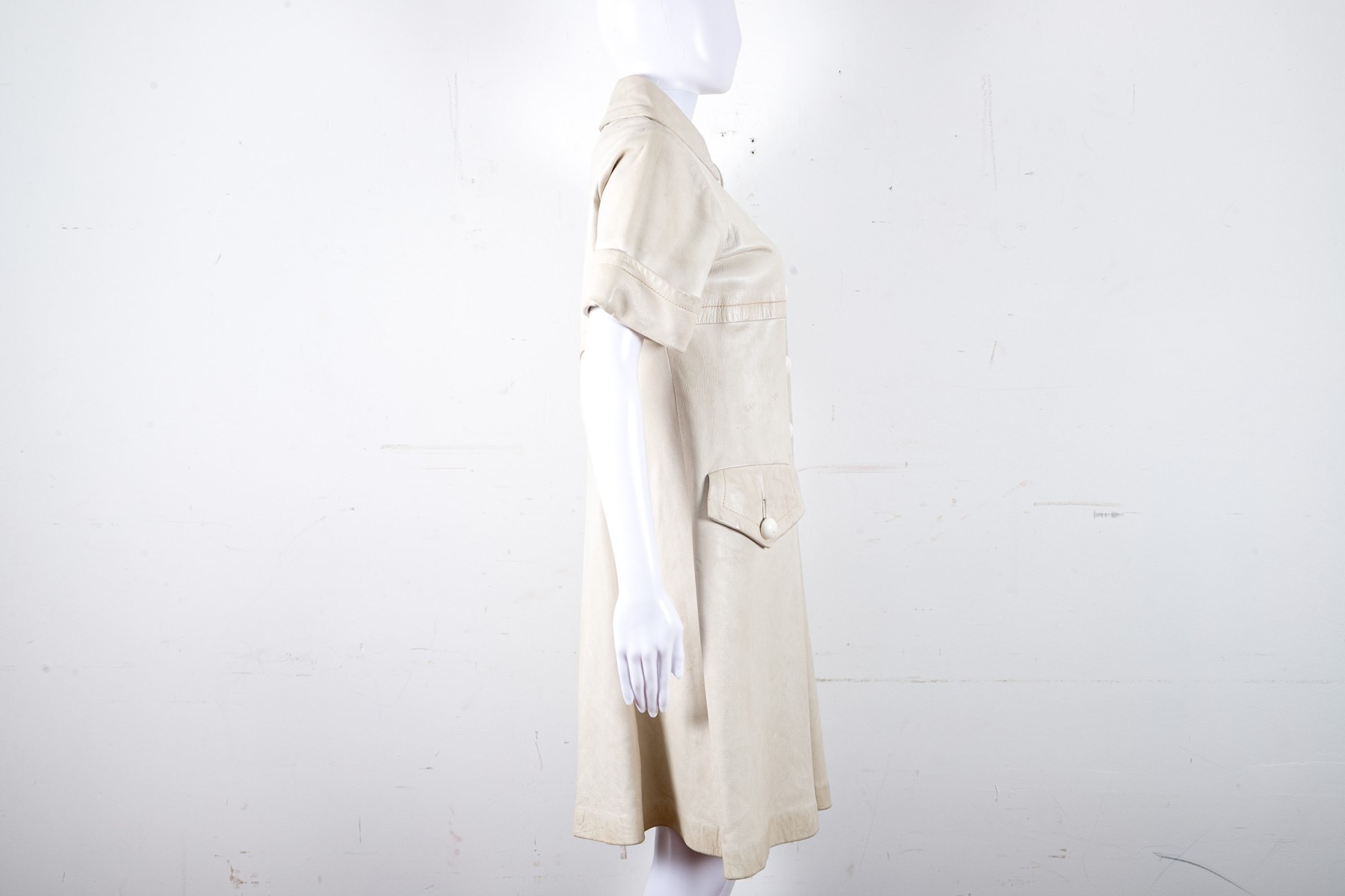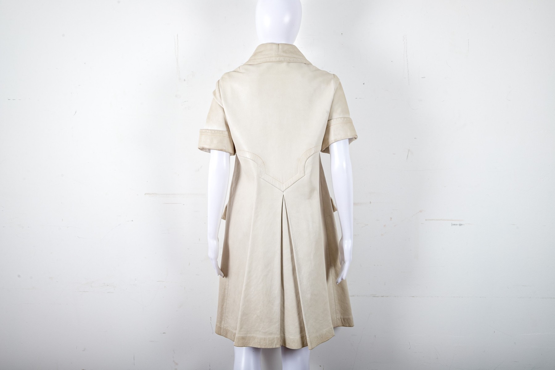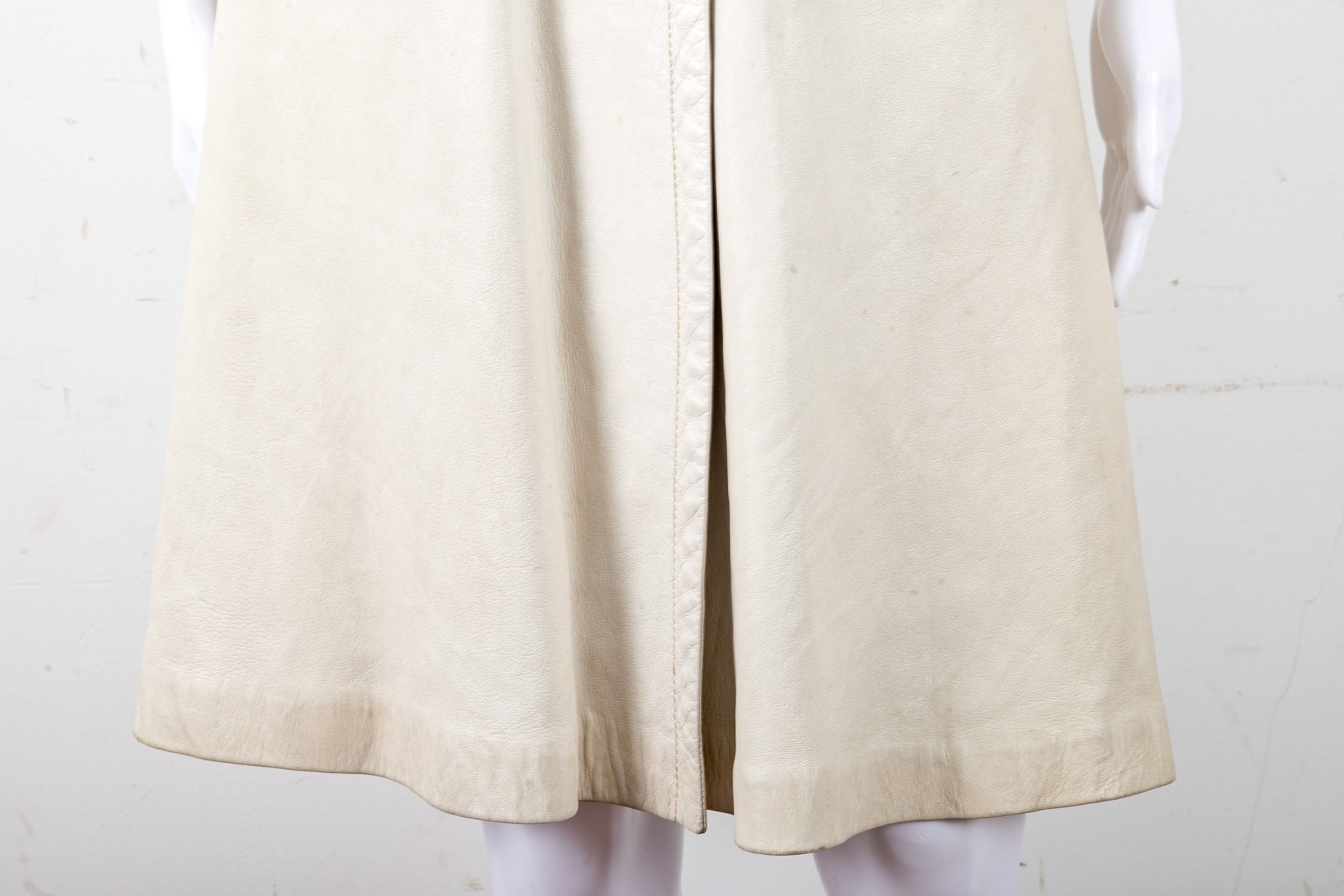 Pierre Cardin vintage trench coat in cream-white leather, featuring short rolled sleeves and a rounded collar for fun and feminine flare. Features a stitched empire-styled waist and large, domed buttons along the center front that compliment two flap pockets. The back is pleated for a flattering, stylish fit.