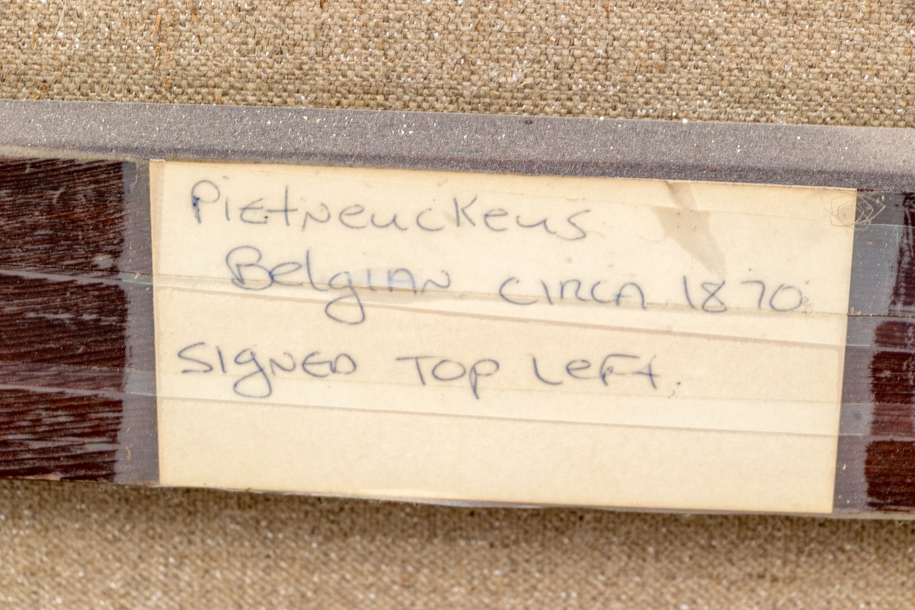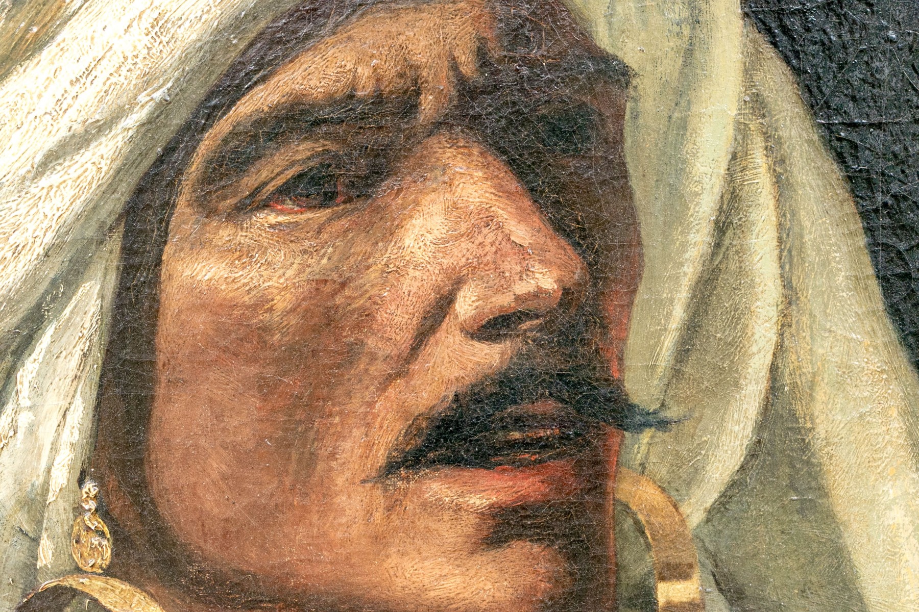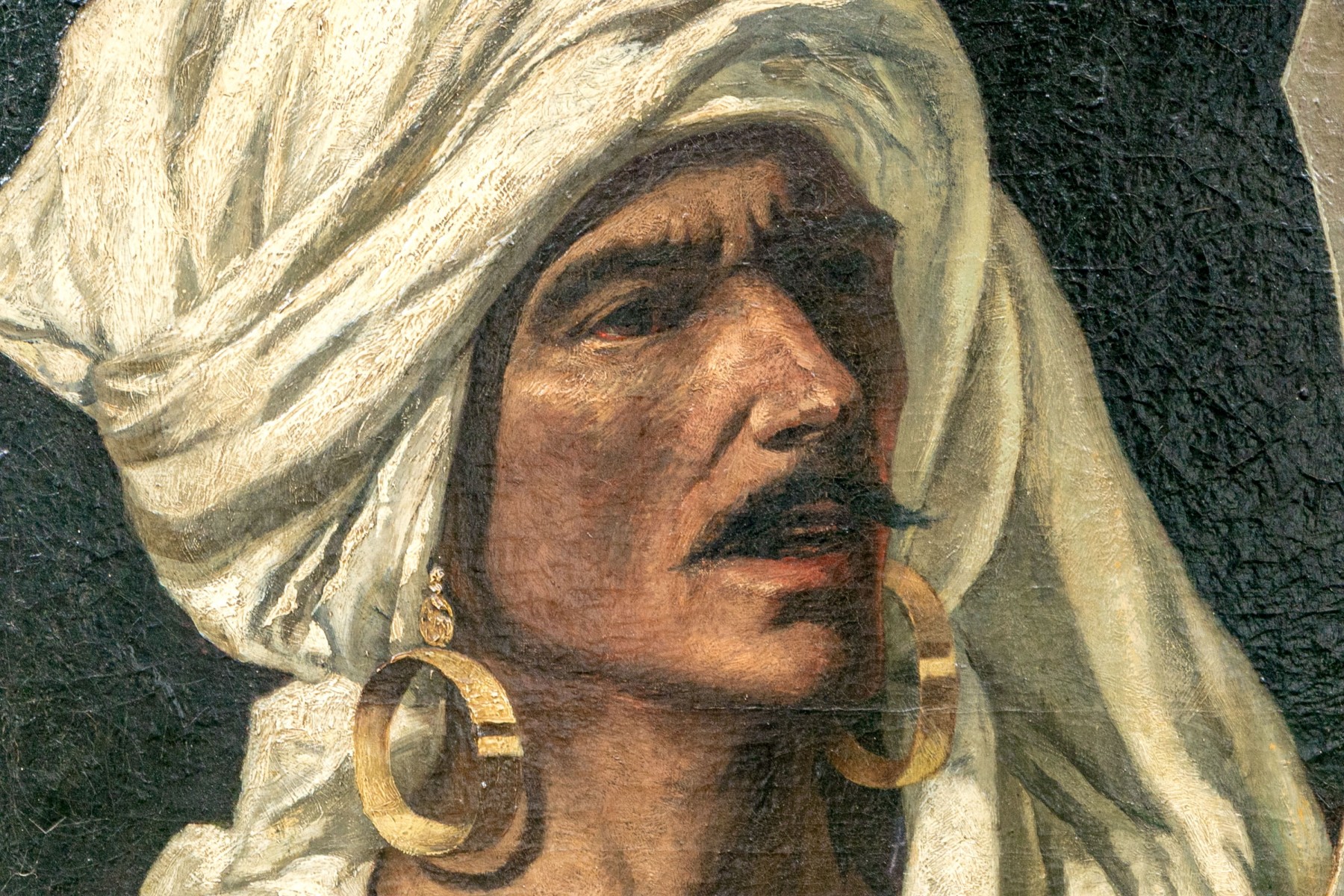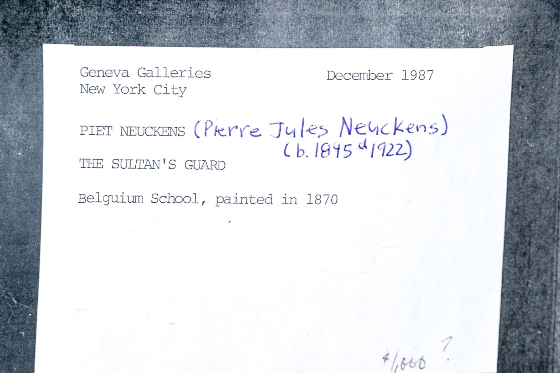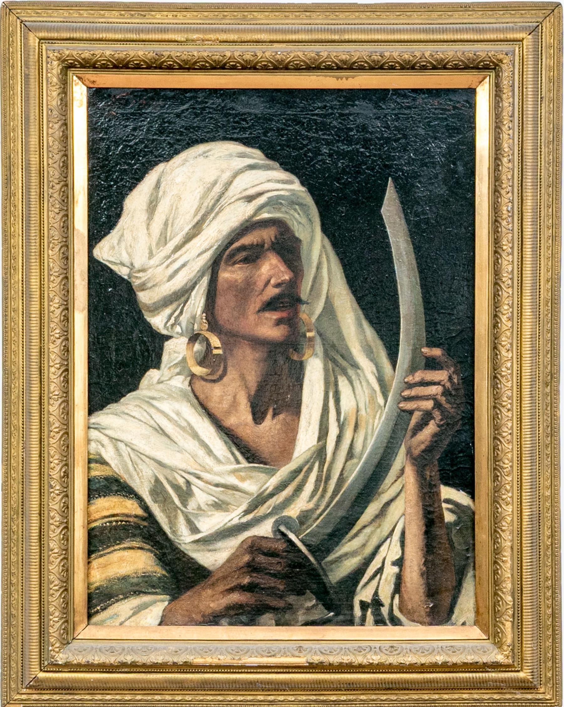 Pierre/Piet Jules Neuckens (Belgian, 1845-1922) "The Sultan's Guard" oil painting on canvas depicting a man with a dark moustache wearing a white turban and large gold hoop earrings inspecting a curved sword against a black background. Signed top left.