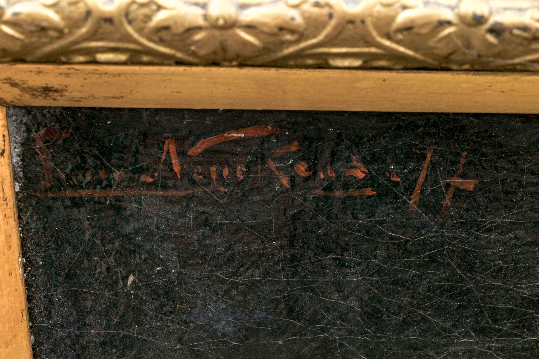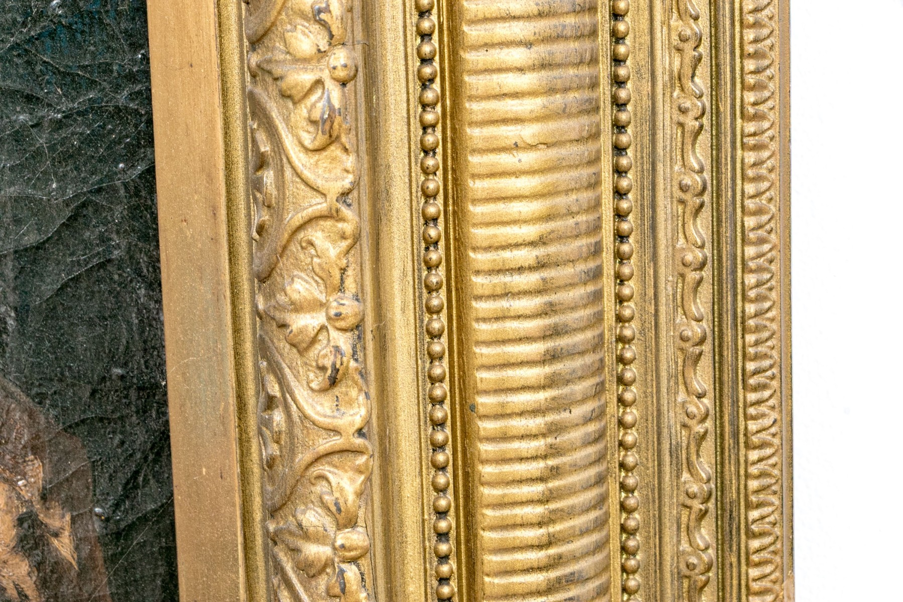 Displayed in a beautifully detailed gilt frame with borders of geometric relief.