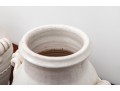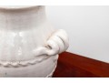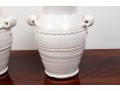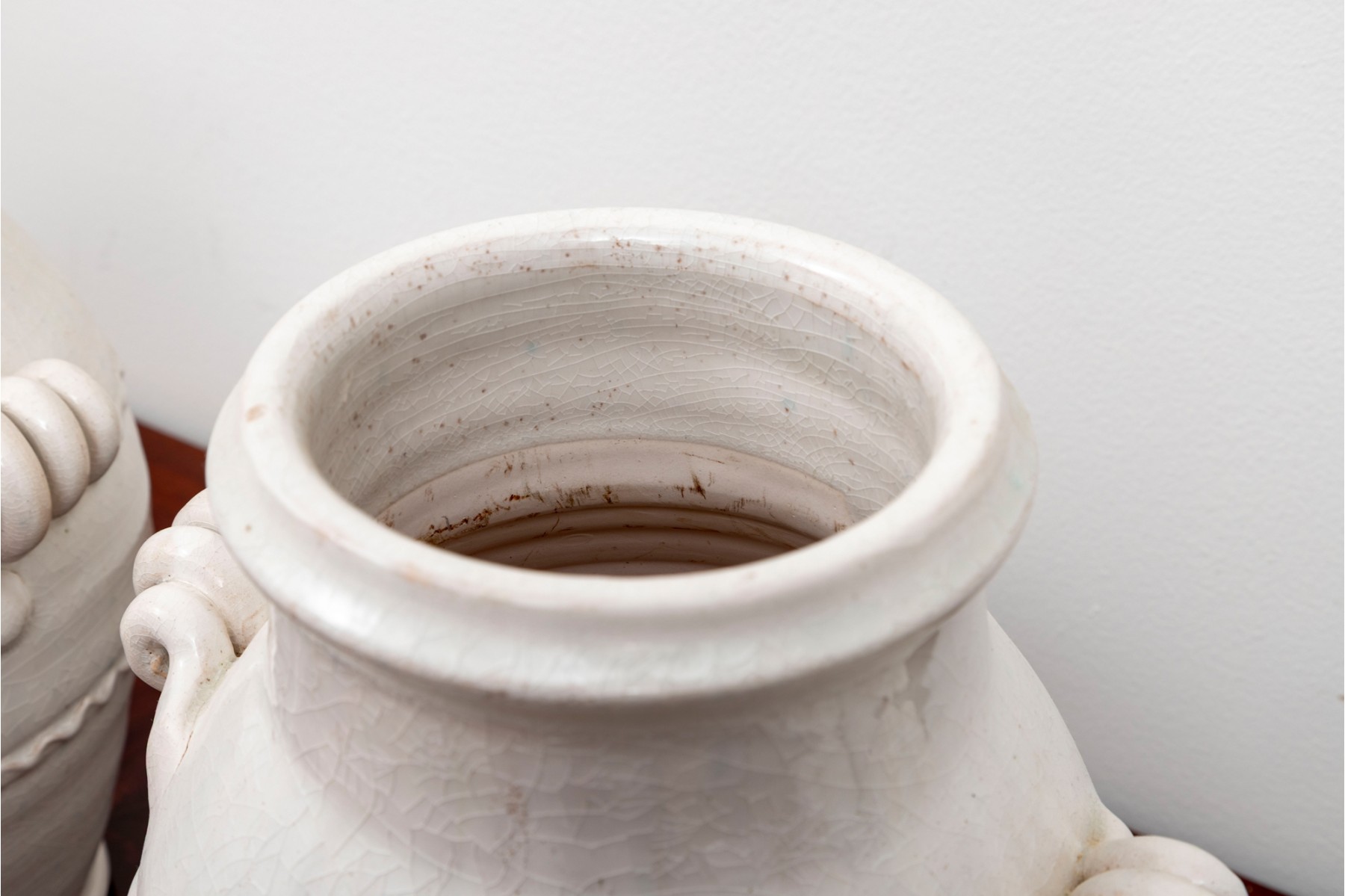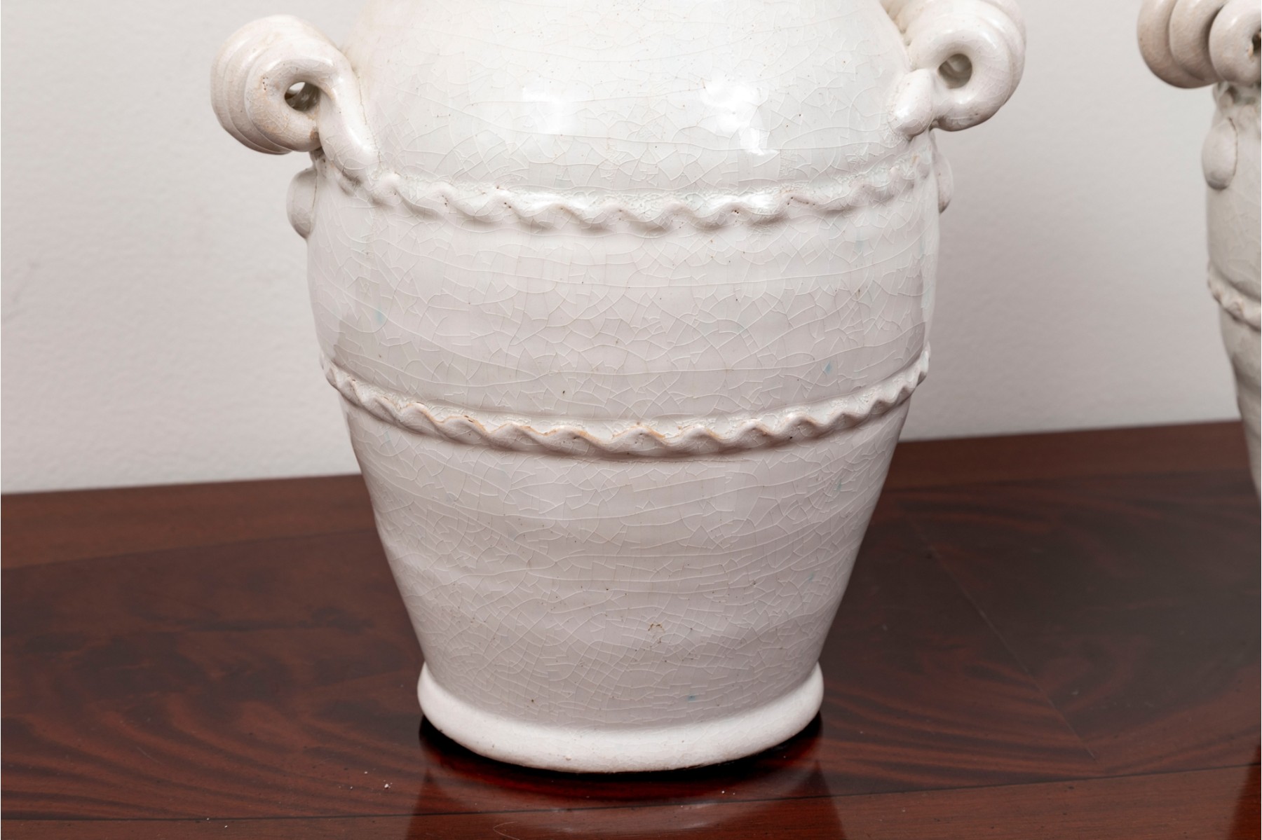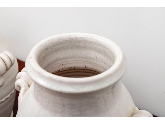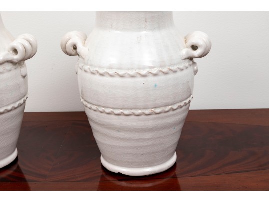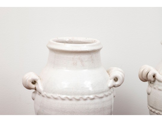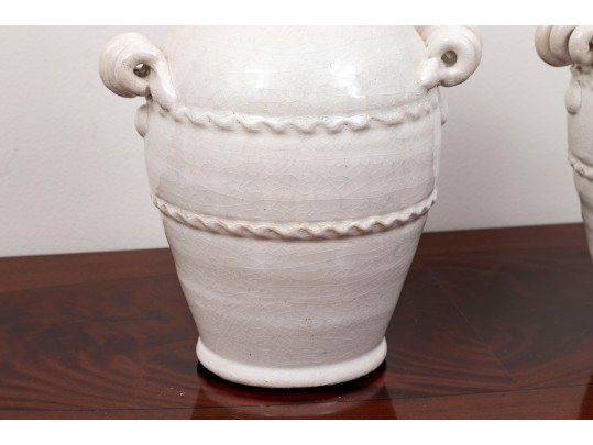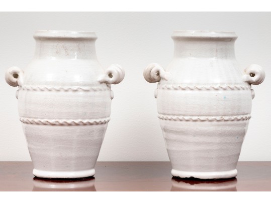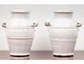 A pair of contemporary ceramic hand-sculpted off-white glazed vases distinguished by unusual pig tail style handles.