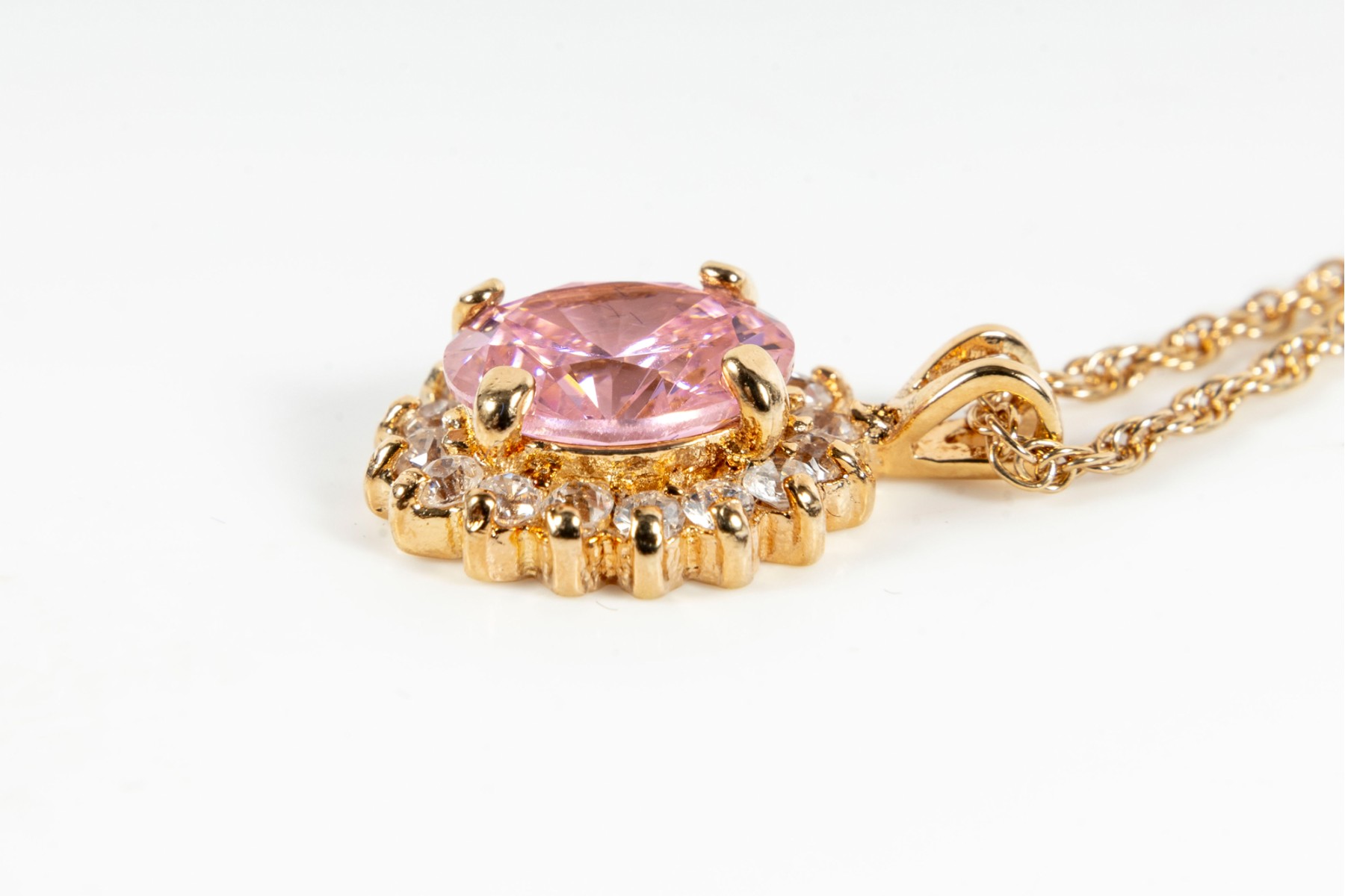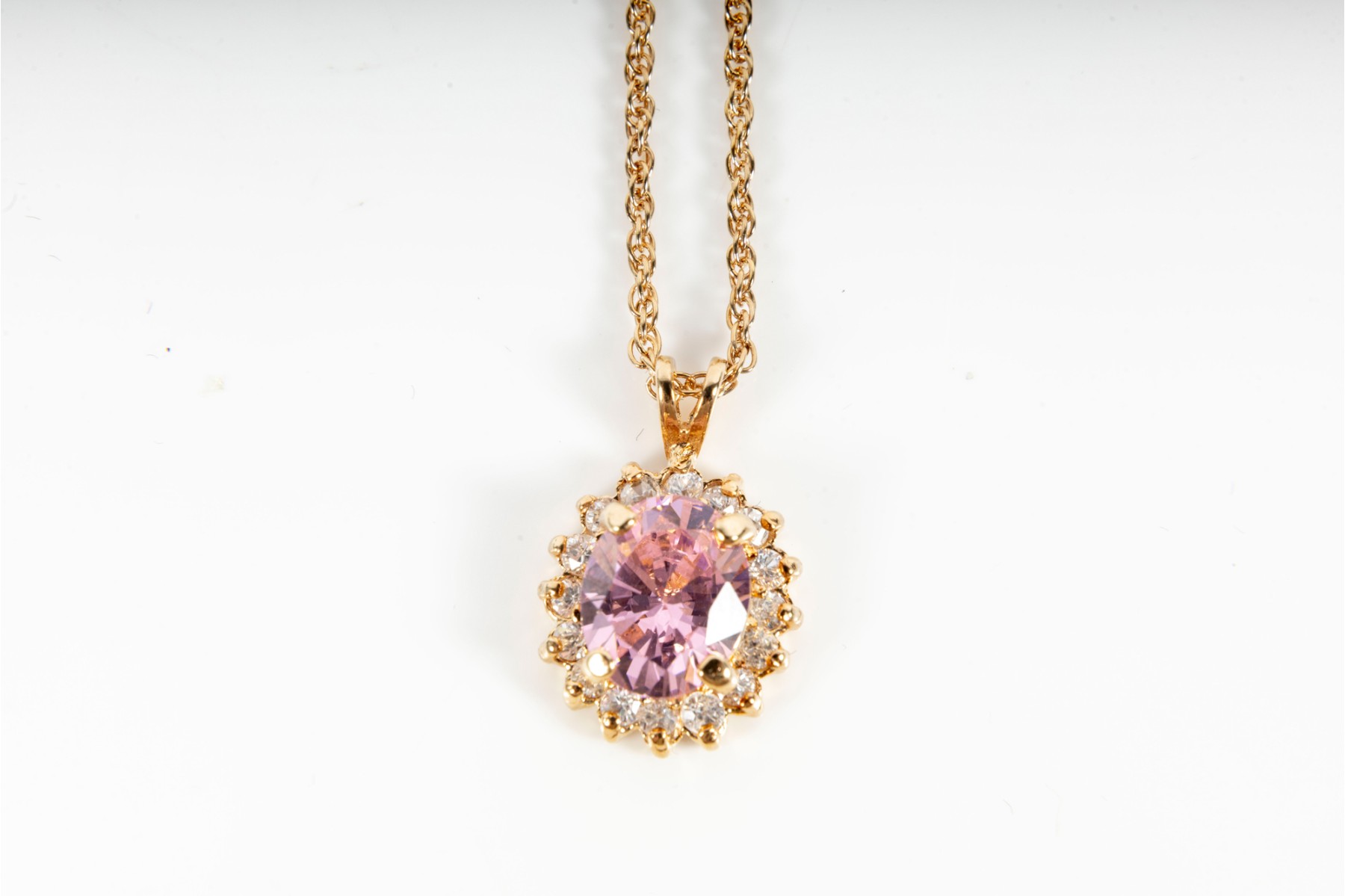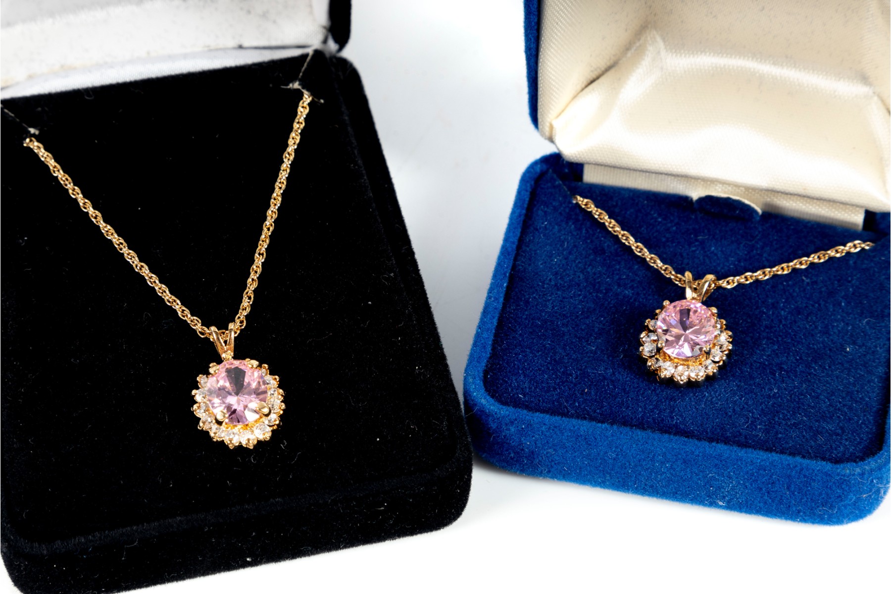 This elegant pair of pendant necklaces showcase the allure of fine gemstones, with each pendant featuring a vibrant, oval-cut pink tourmaline at its center. The gemstones are encircled by sparkling glass diamonds, creating a radiant halo. See photos for details.