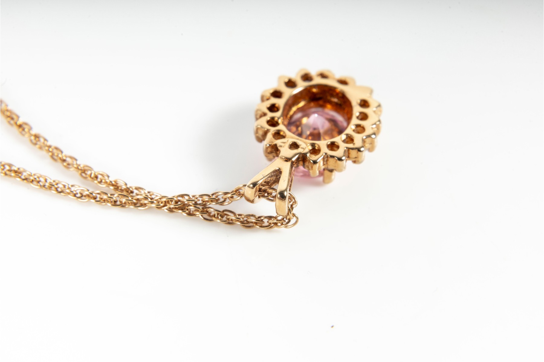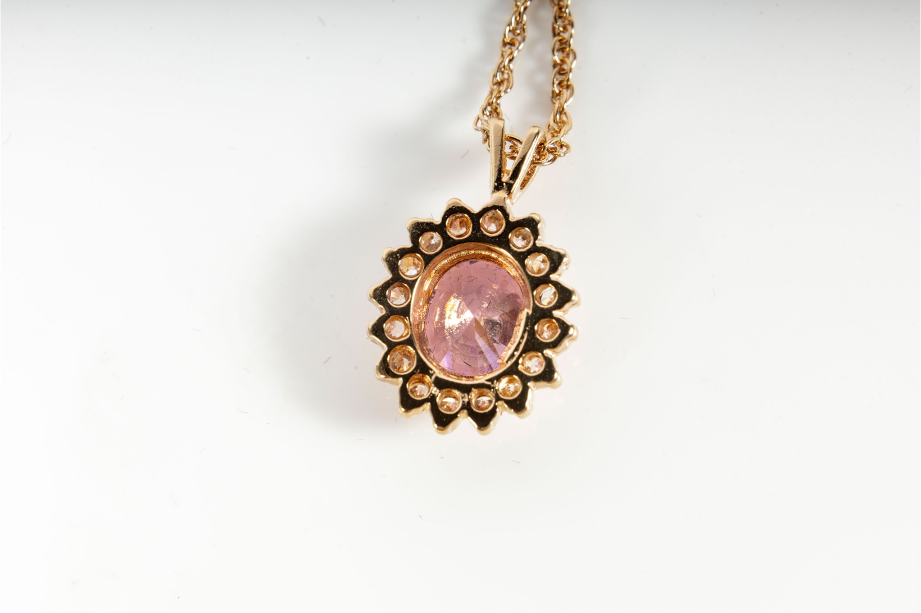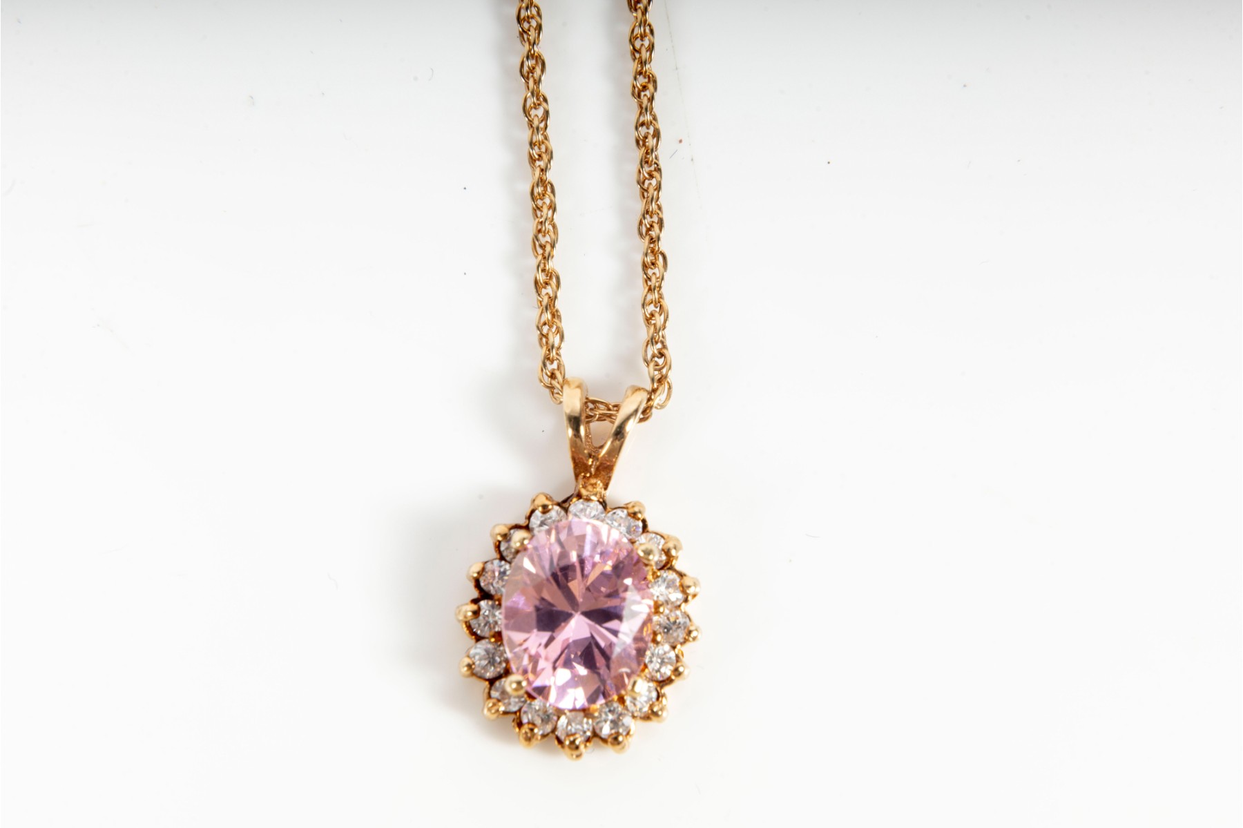 This elegant pair of pendant necklaces showcase the allure of fine gemstones, with each pendant featuring a vibrant, oval-cut pink tourmaline at its center. The gemstones are encircled by sparkling glass diamonds, creating a radiant halo. See photos for details.