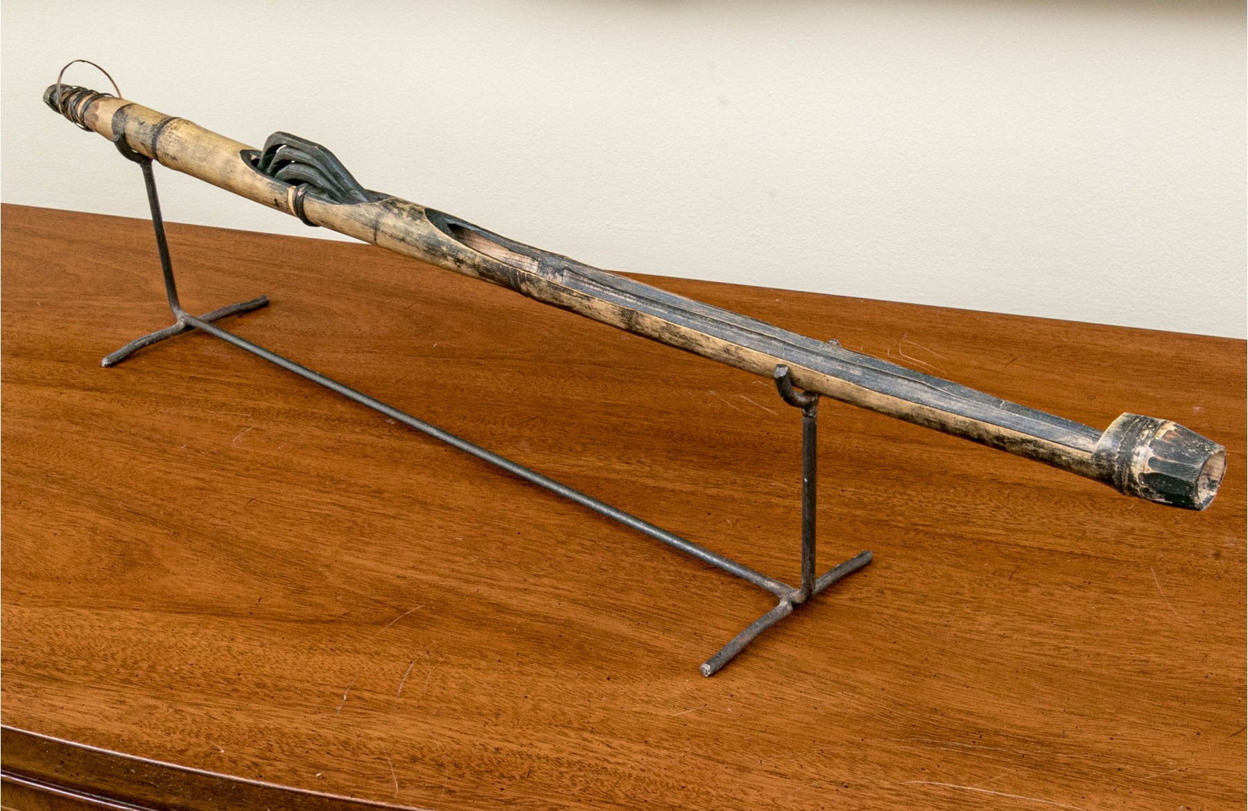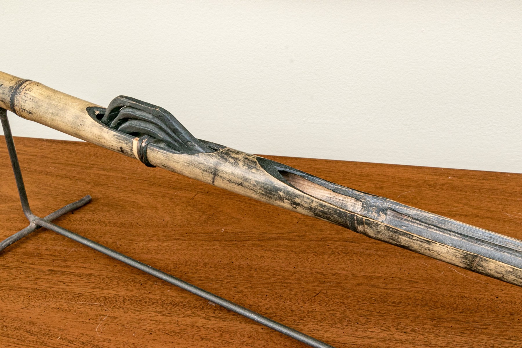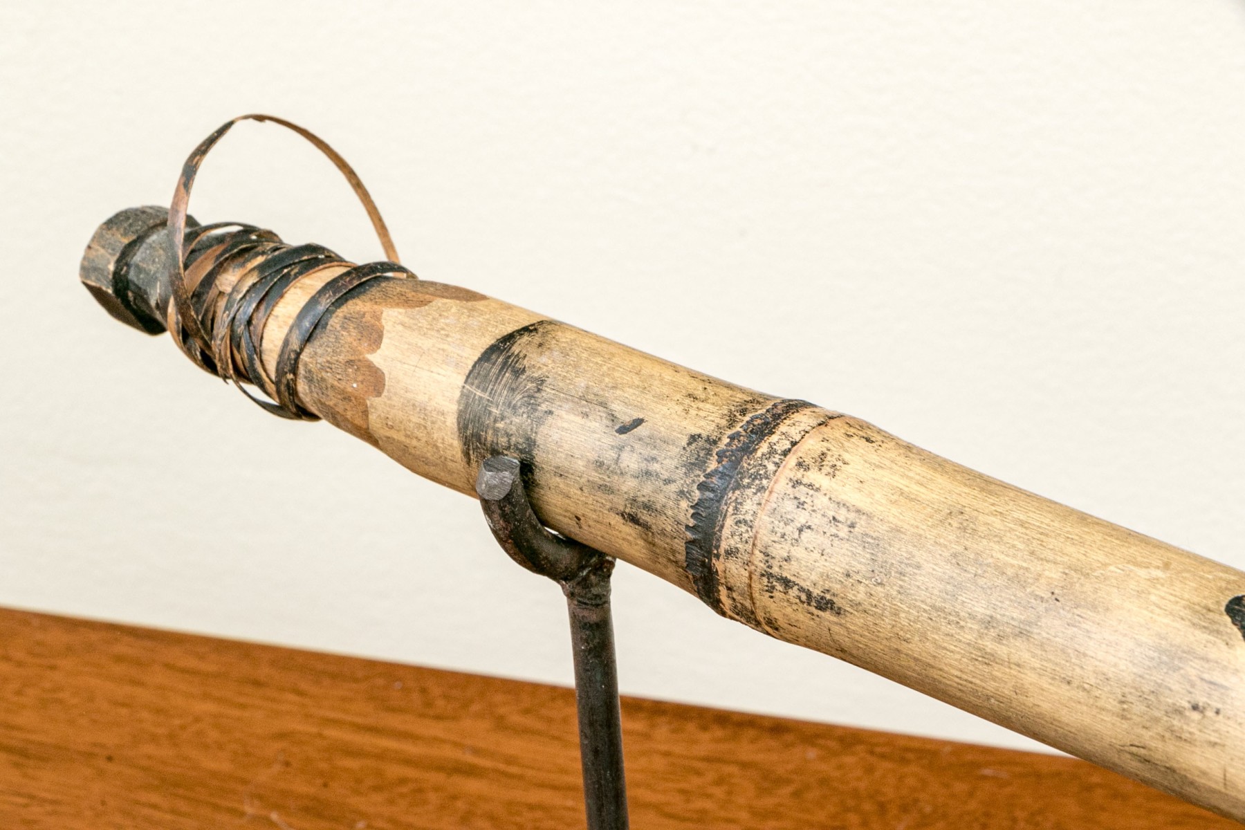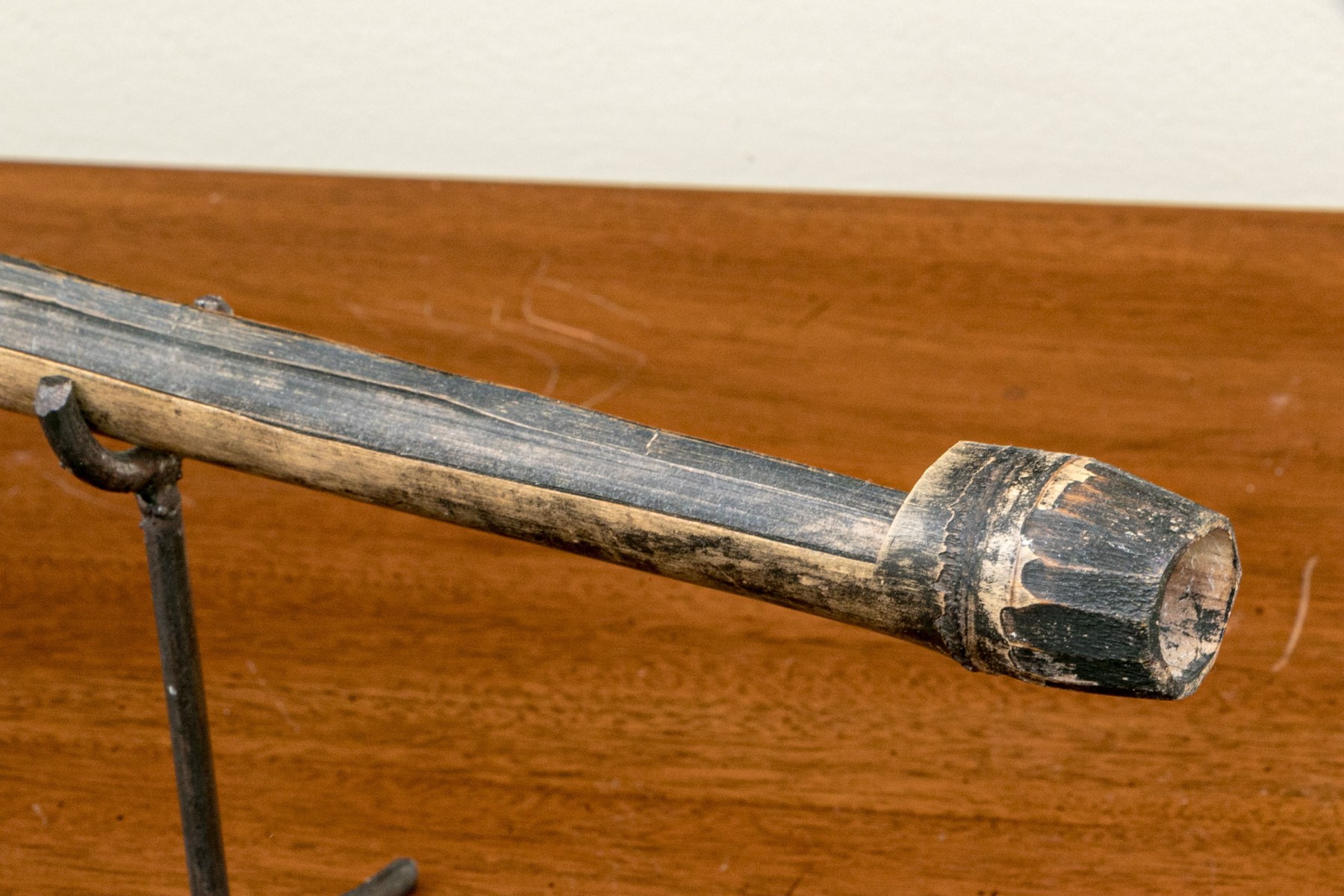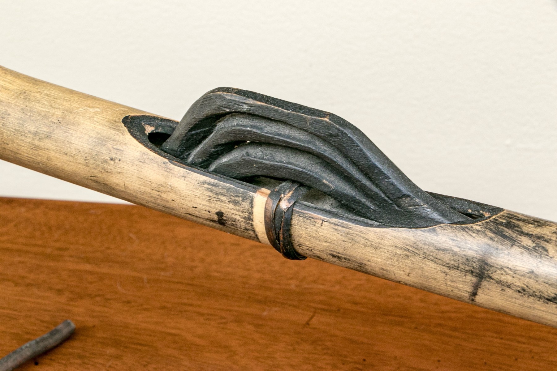 Hand carved with iron coiled section in the center. Presented on an Iron display stand.