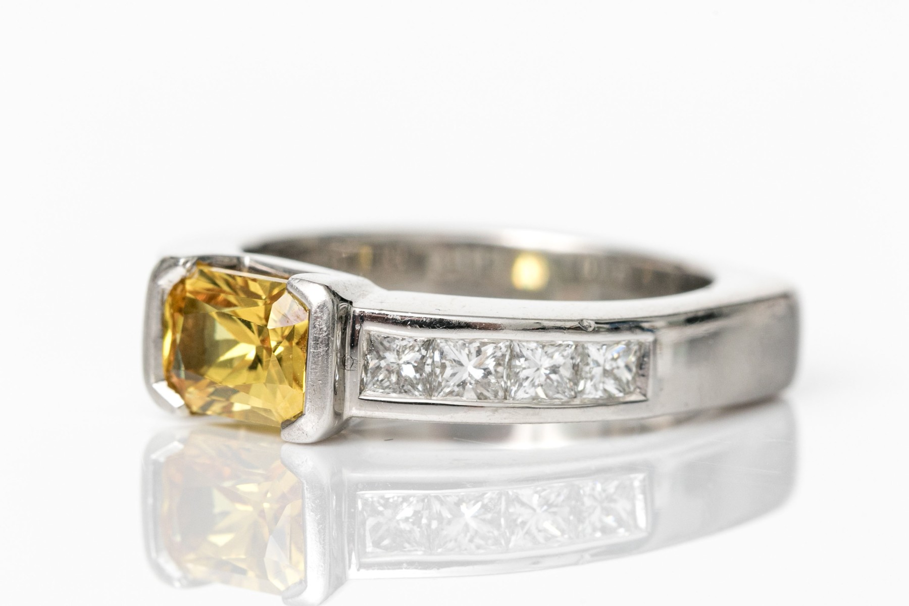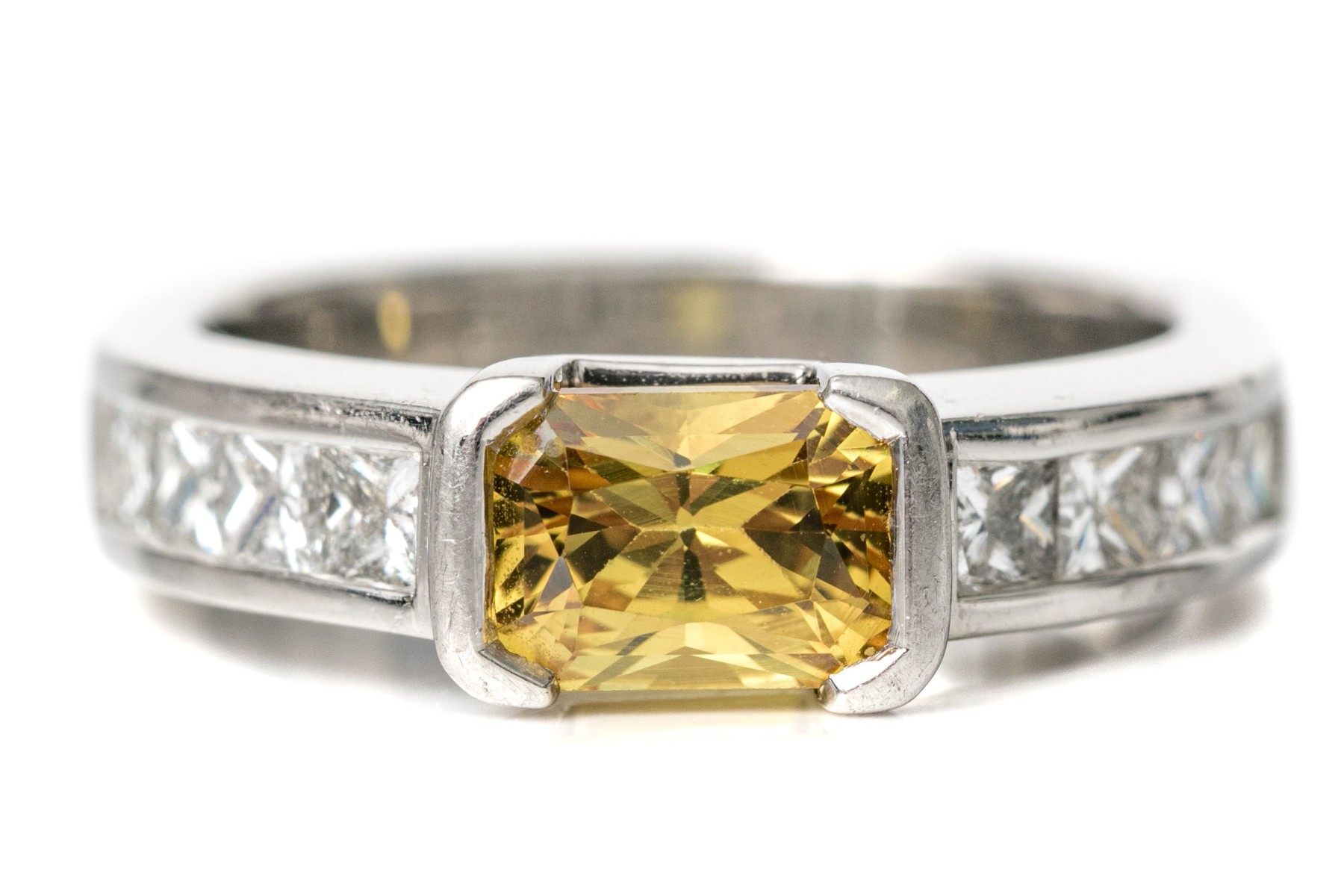 Platinum beautiful horizontal profile yellow sapphire and princess cut diamond ring, size 5+, diamonds app. 0.64 TCW, sapphire app. 1.21 CTS