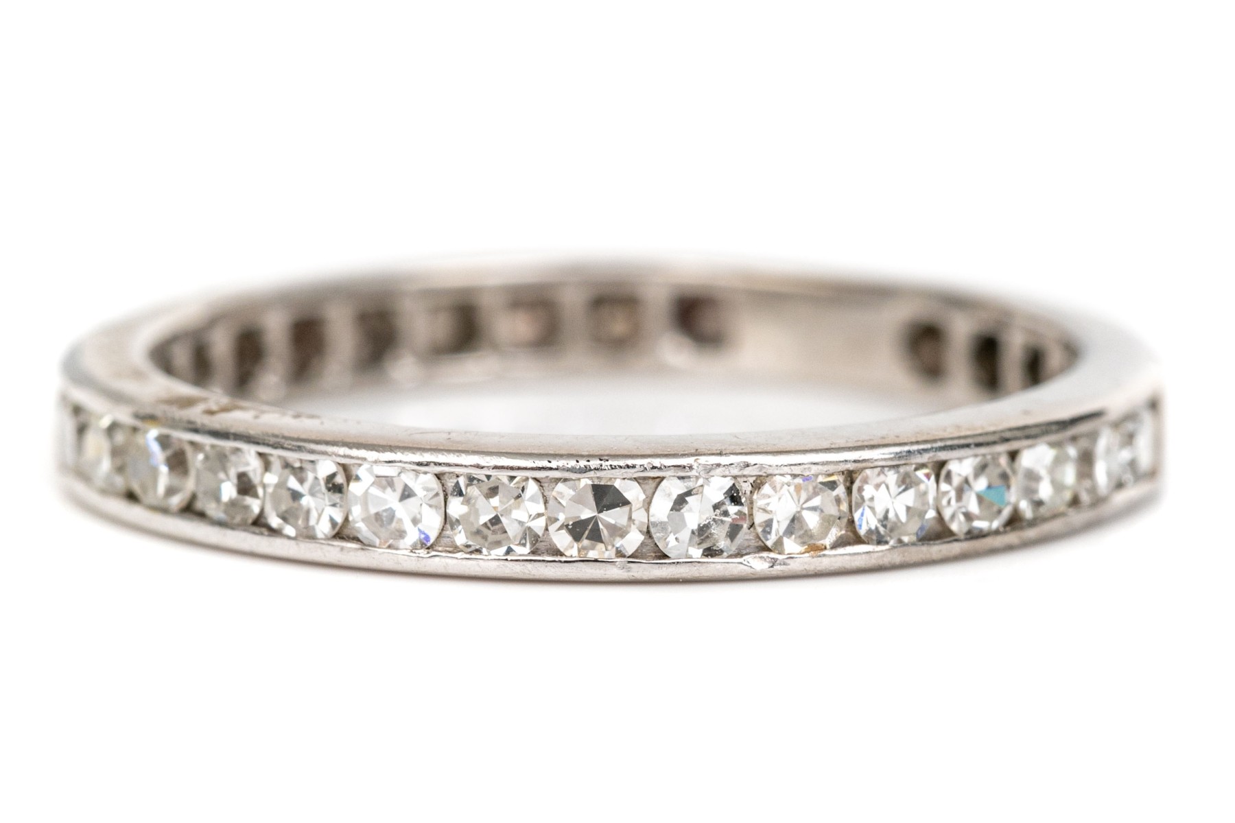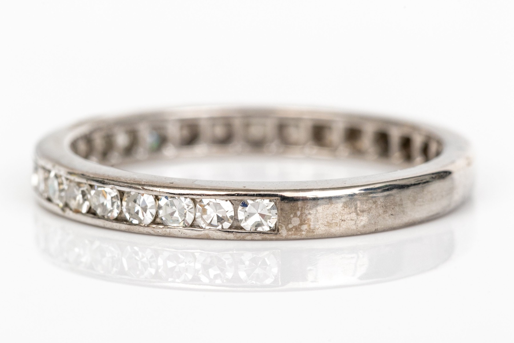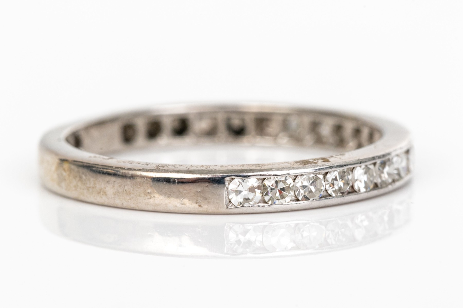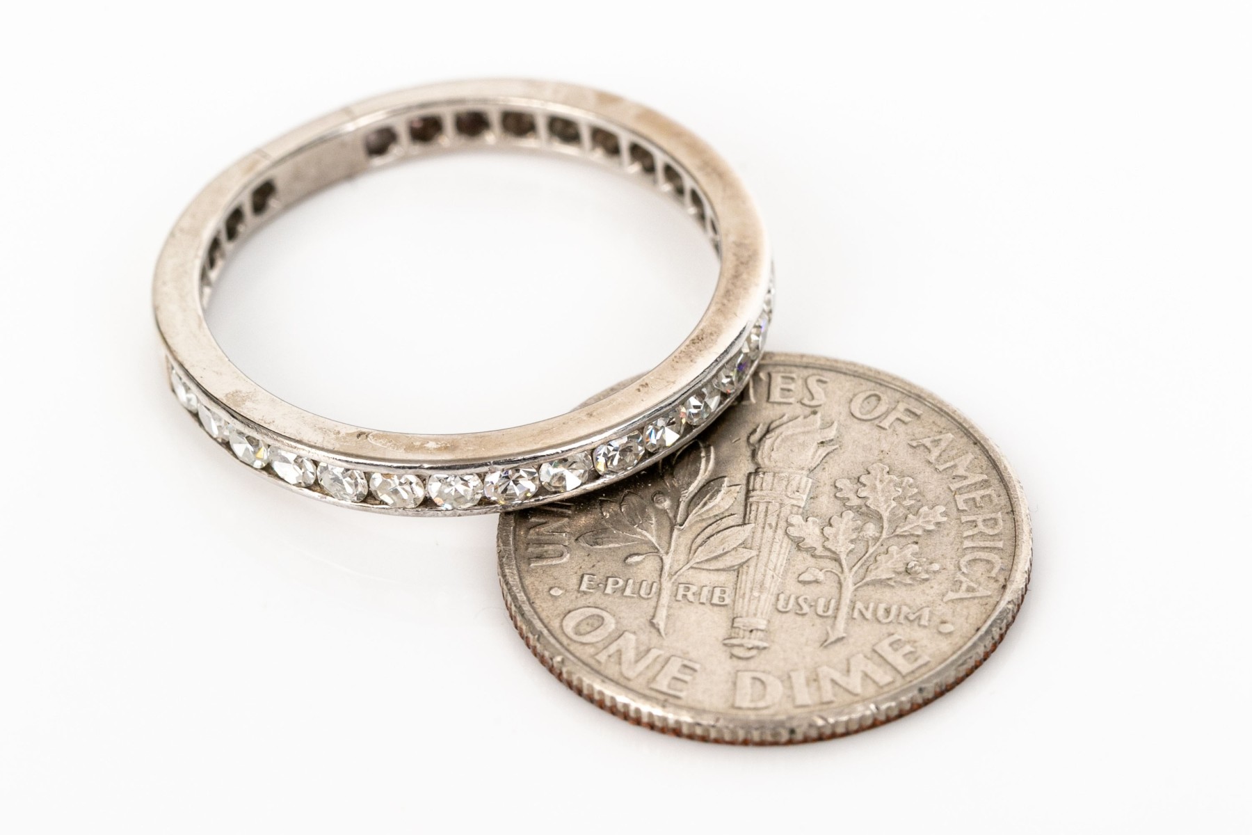 Platinum chic channel set round faceted diamond band ring, app. 0.22 TCW, size 7.25. The diamonds are SI2, J color