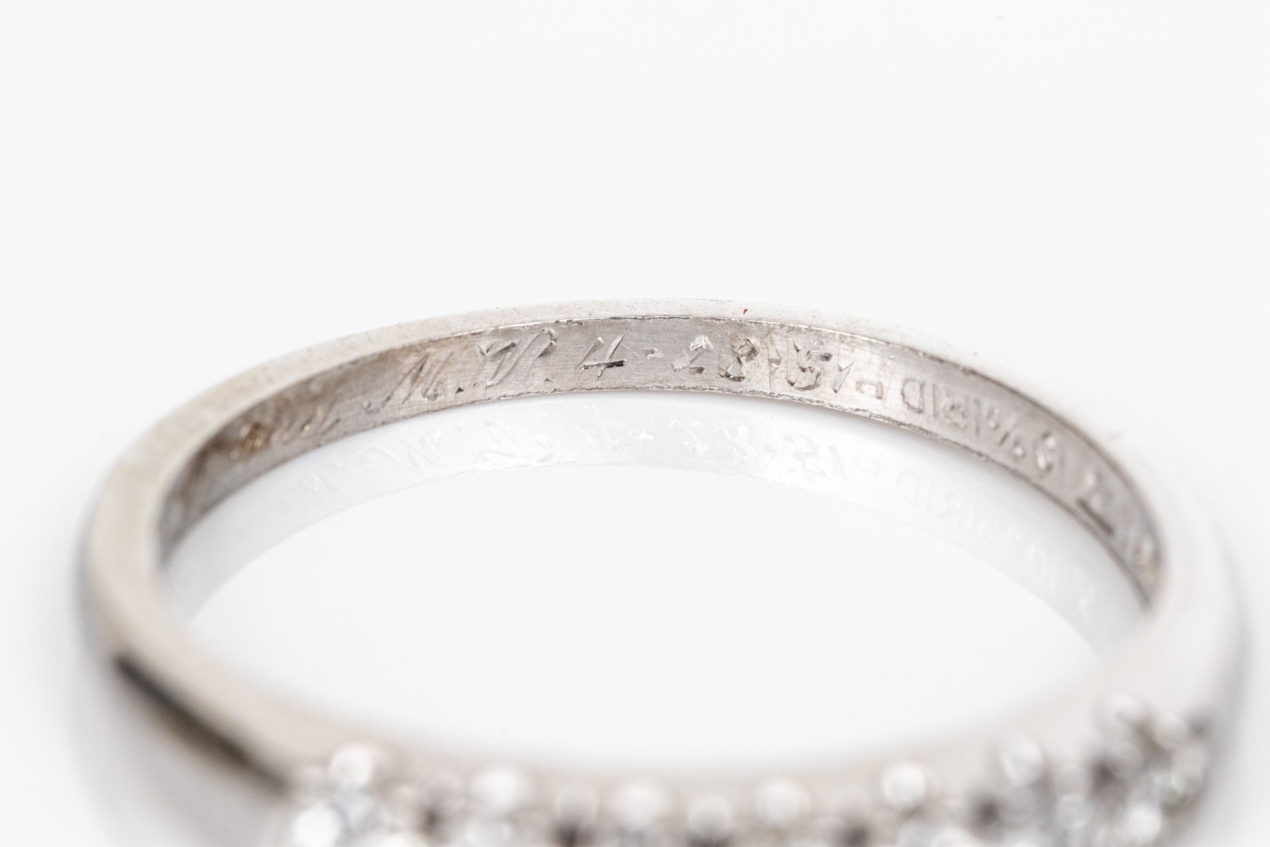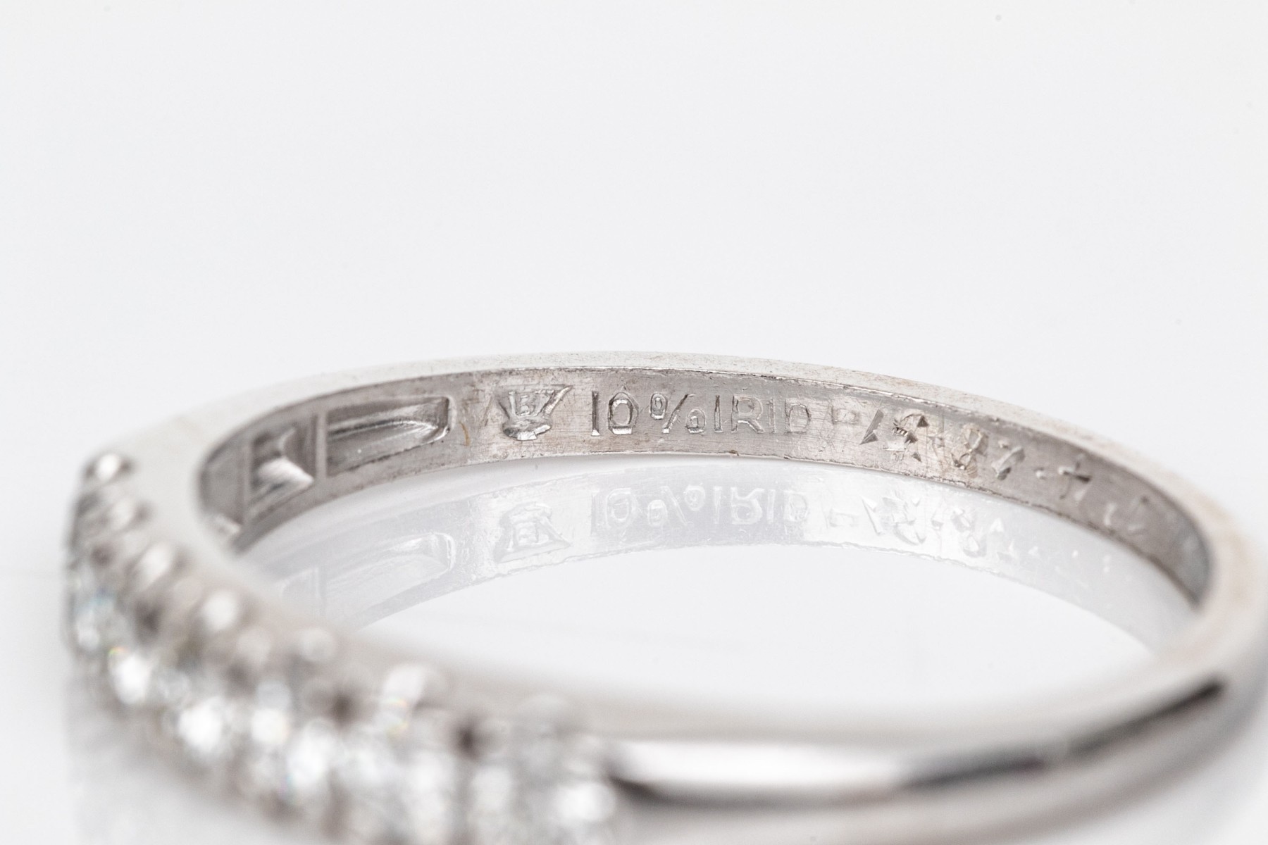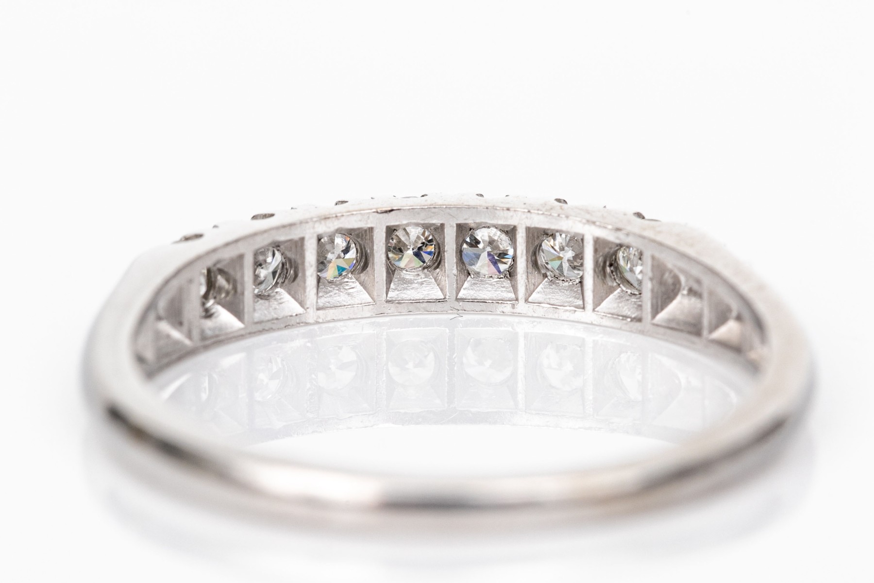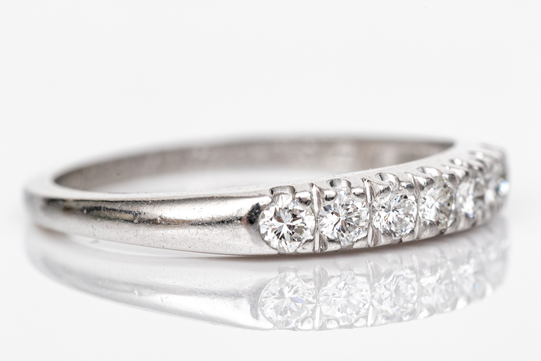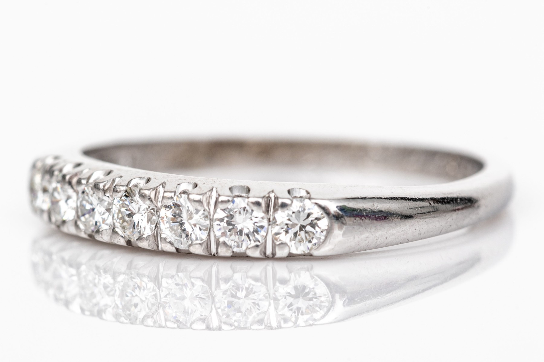 Platinum classic seven diamond prong set band ring, app. 0.14 TCW, size 6.75. The diamonds are VS2 to SI1 clarity, I color