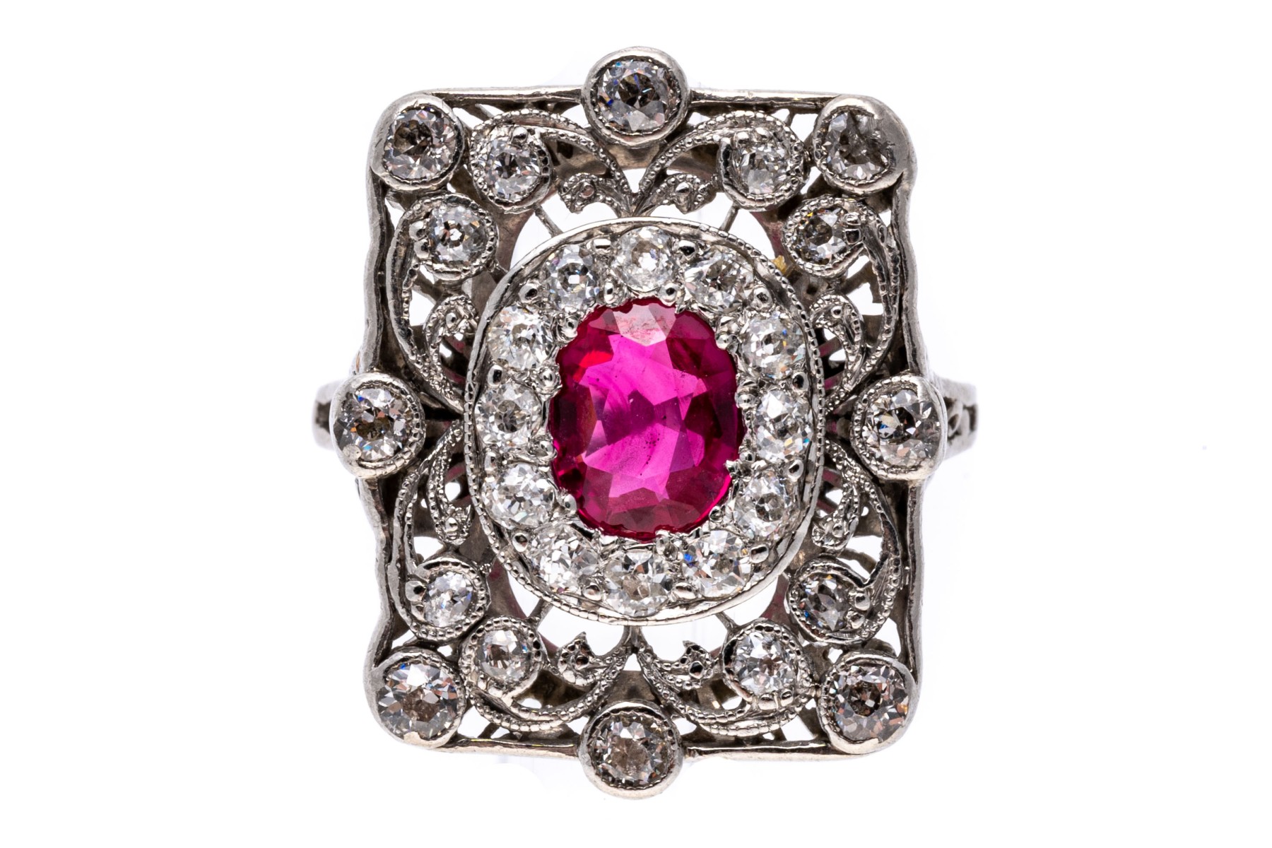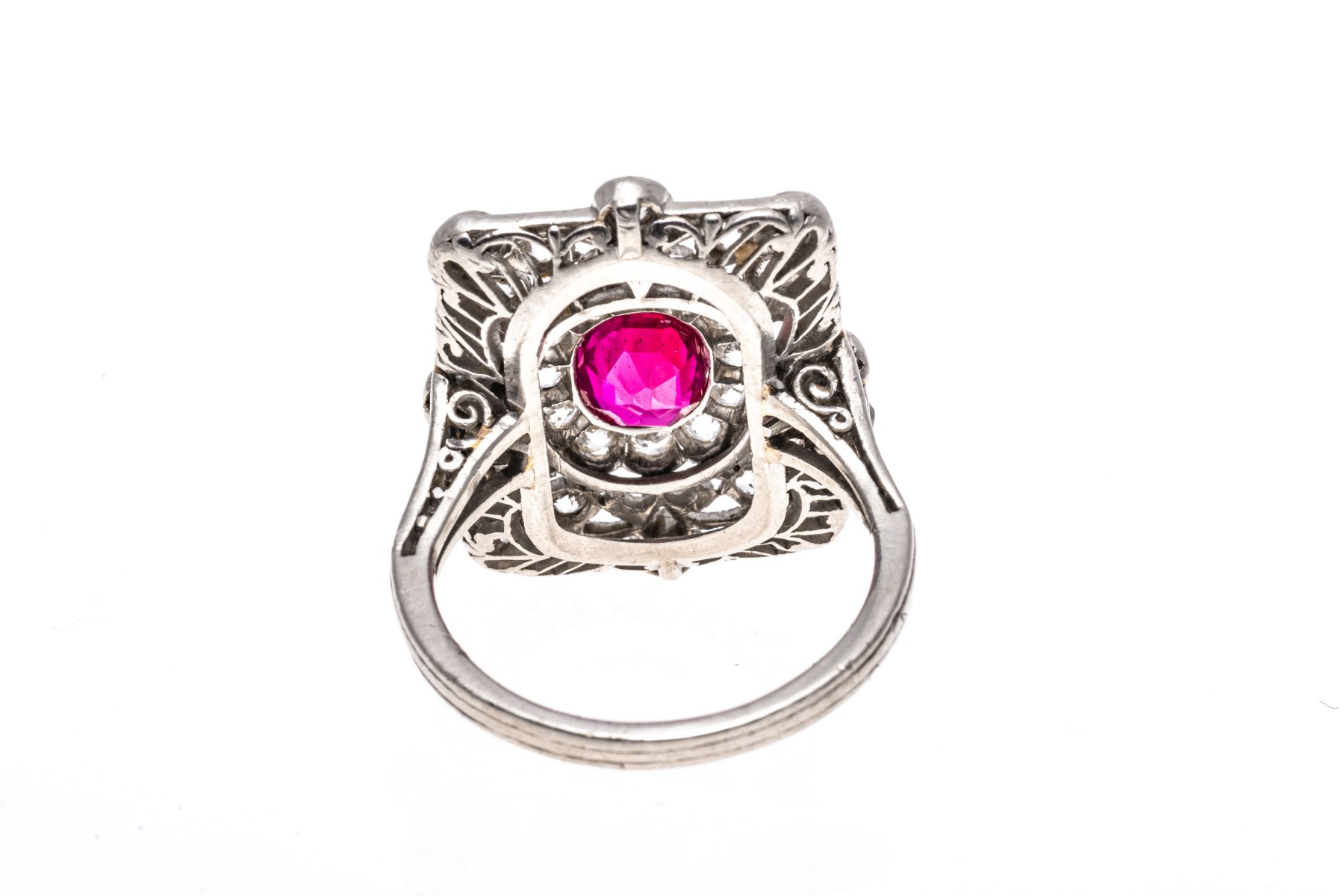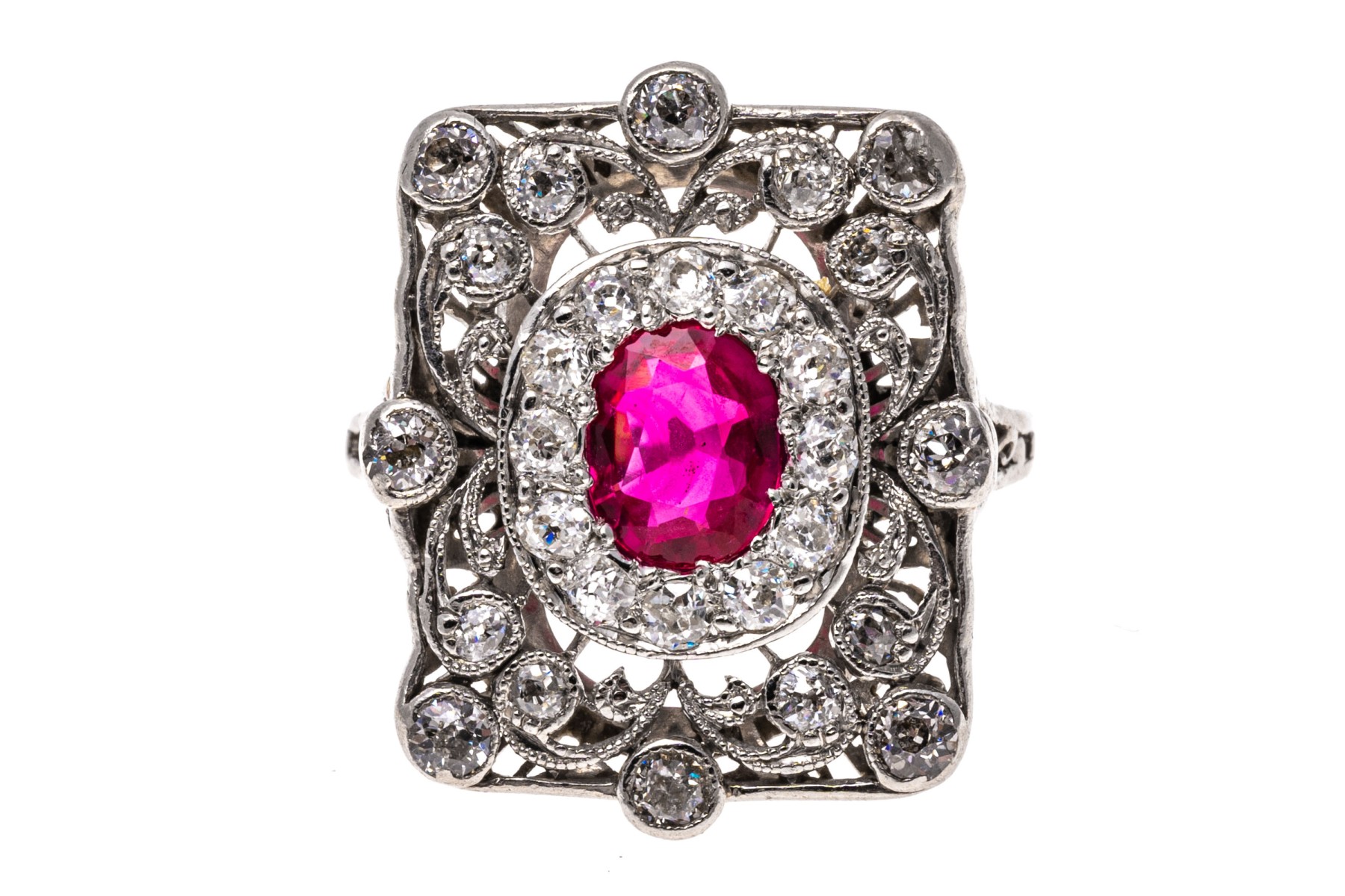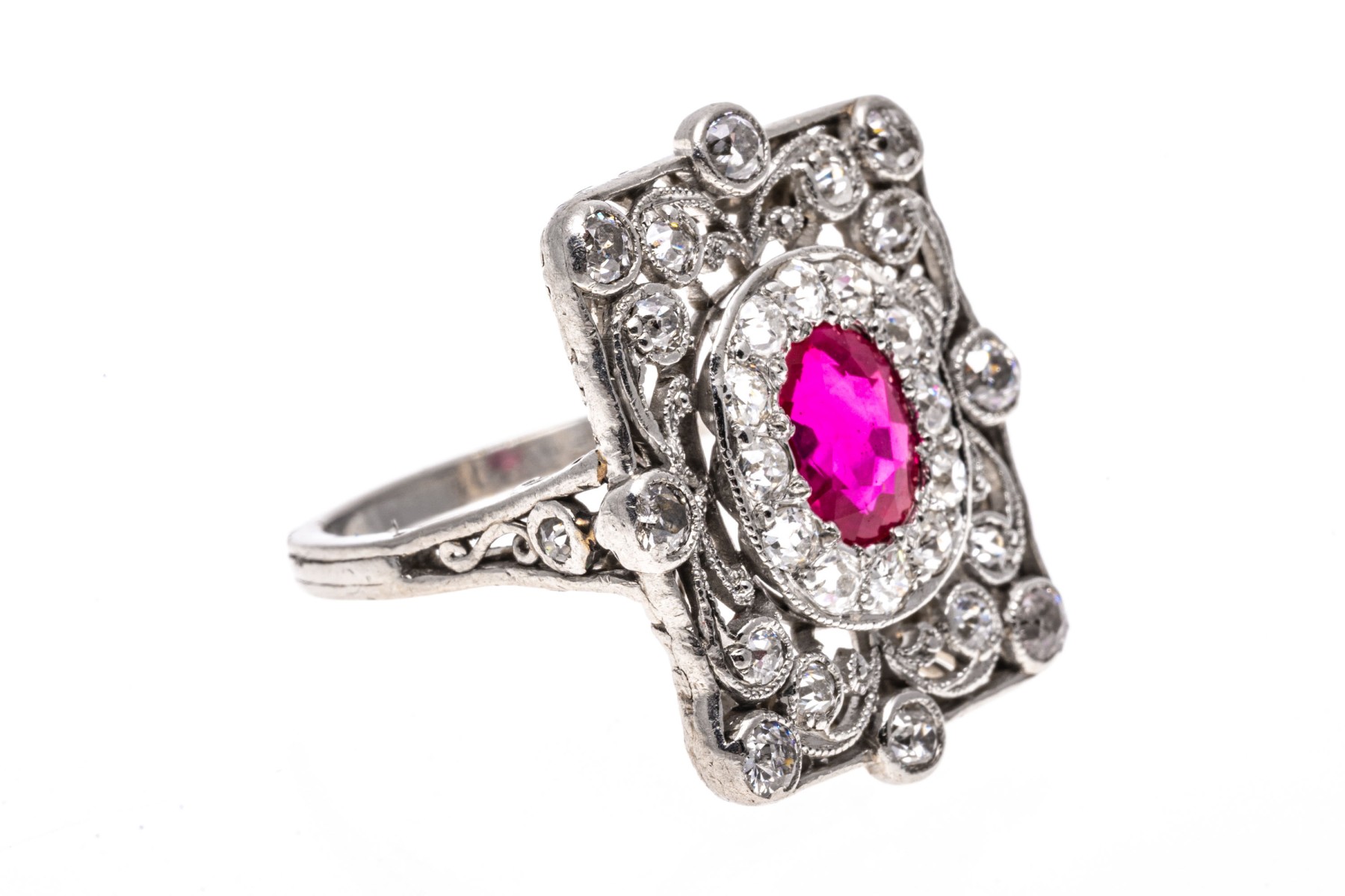 Platinum ring. This beautiful vintage platinum ring has a rectangular filigree top, bezel set with old European cut diamonds. The rings center is an oval, dark pink faceted synthetic pink sapphire, is surrounded by a halo of prong set old European cut diamonds. The total diamond weight for the ring is approximately 0.60 TCW.