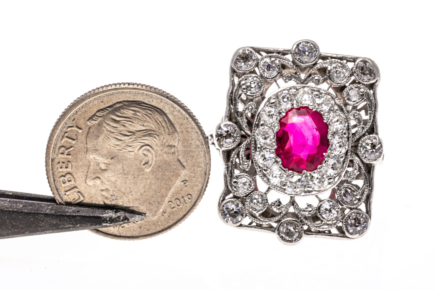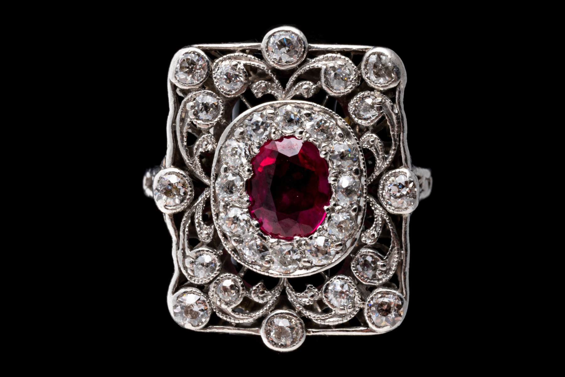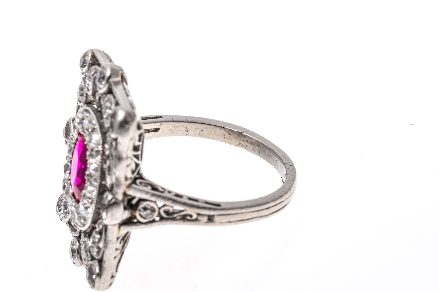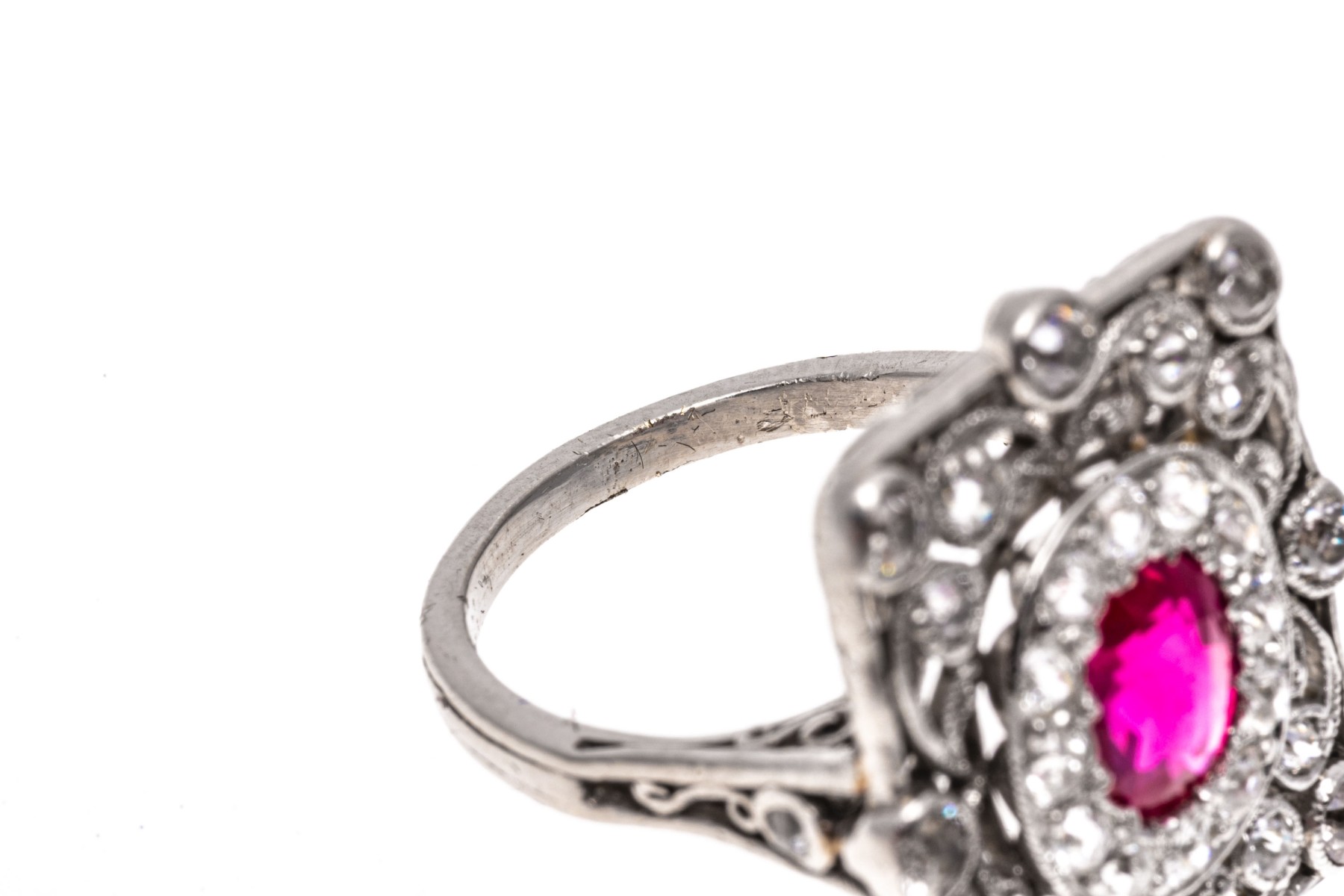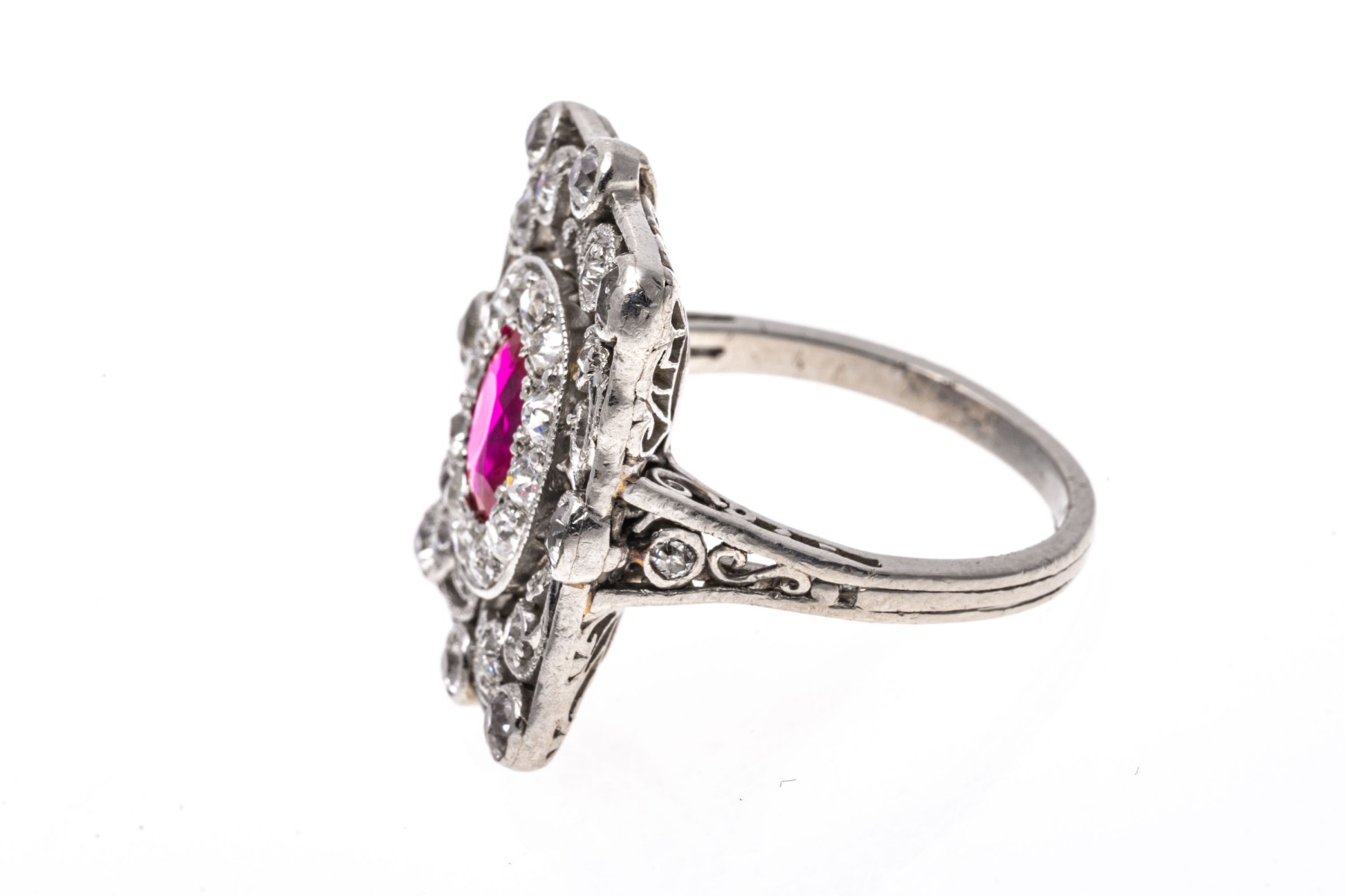 Platinum ring. This beautiful vintage platinum ring has a rectangular filigree top, bezel set with old European cut diamonds. The rings center is an oval, dark pink faceted synthetic pink sapphire, is surrounded by a halo of prong set old European cut diamonds. The total diamond weight for the ring is approximately 0.60 TCW.