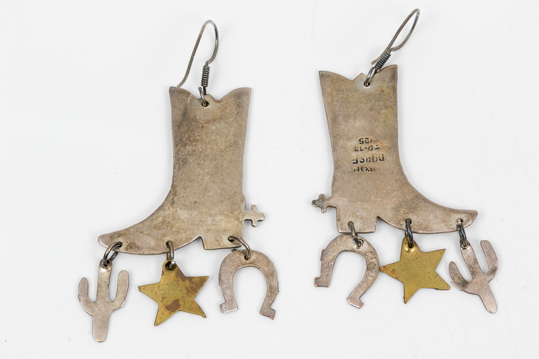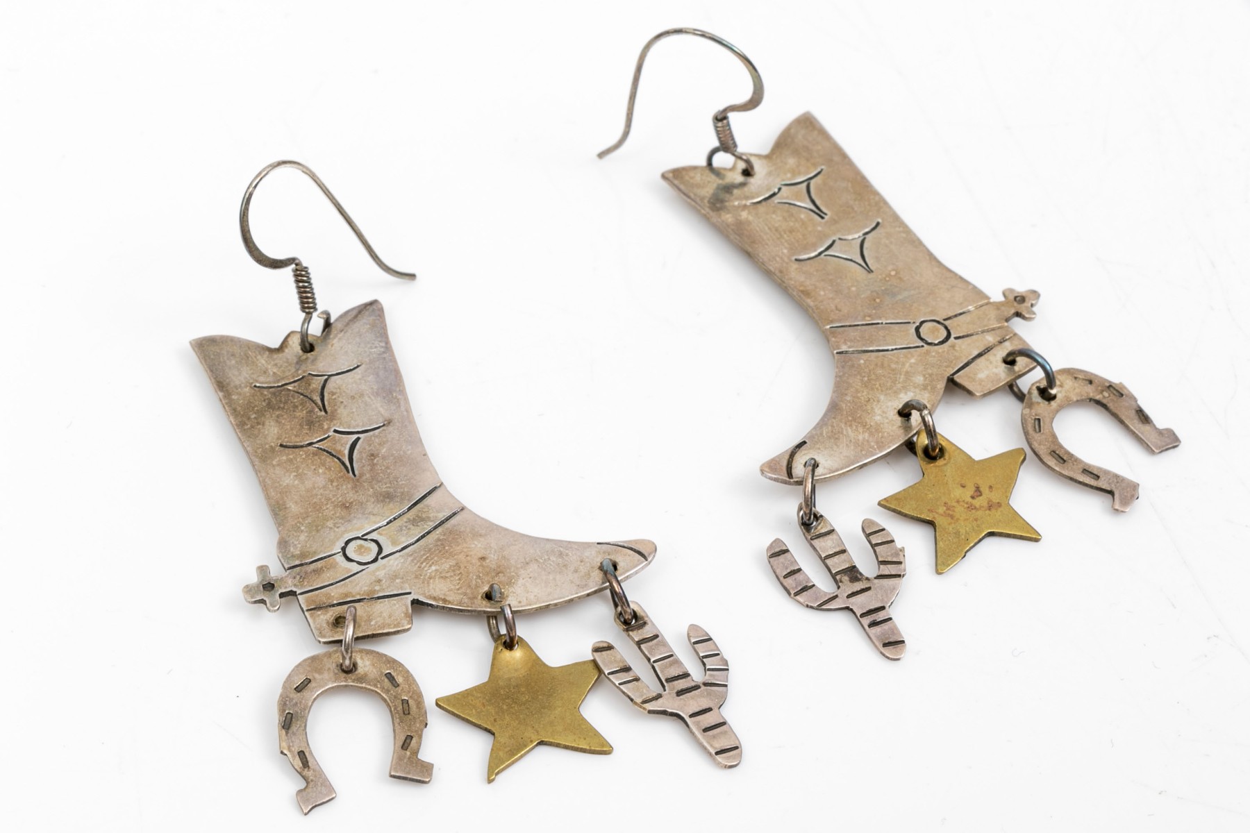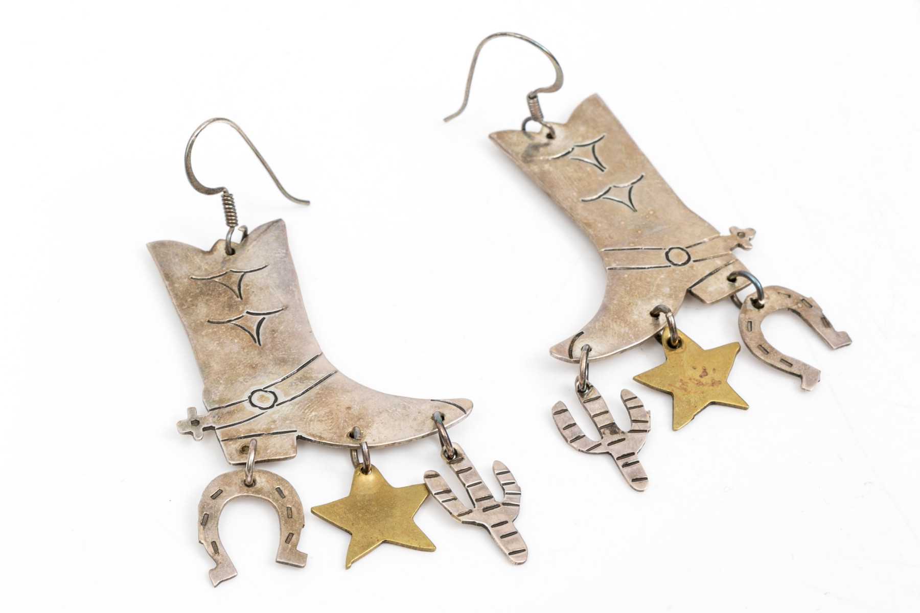 A pair of sterling silver pendant style earrings. Opposing cowboy boots with suspended horseshoe, vermeil star and cactus charms. Hook style backings.