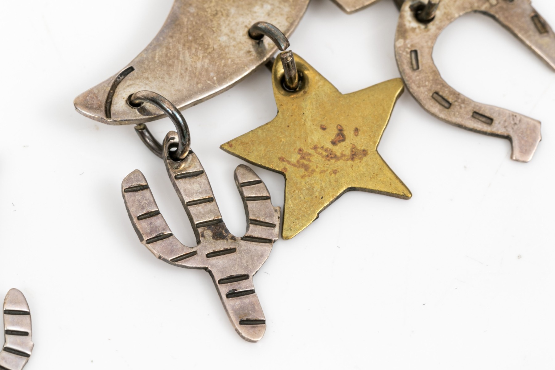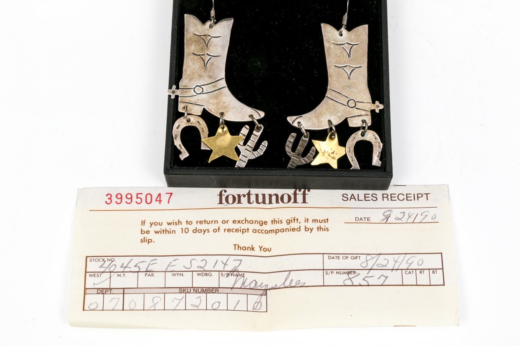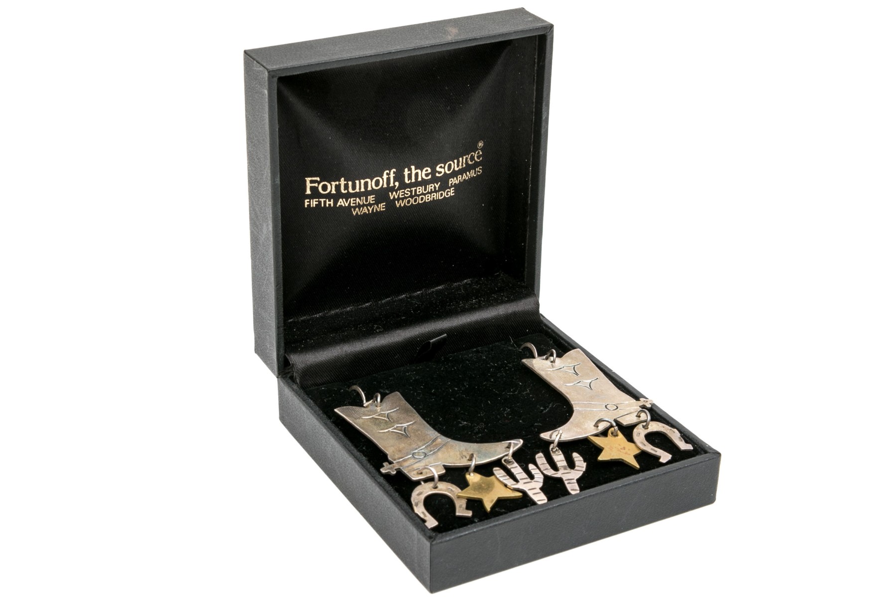 A pair of sterling silver pendant style earrings. Opposing cowboy boots with suspended horseshoe, vermeil star and cactus charms. Hook style backings.