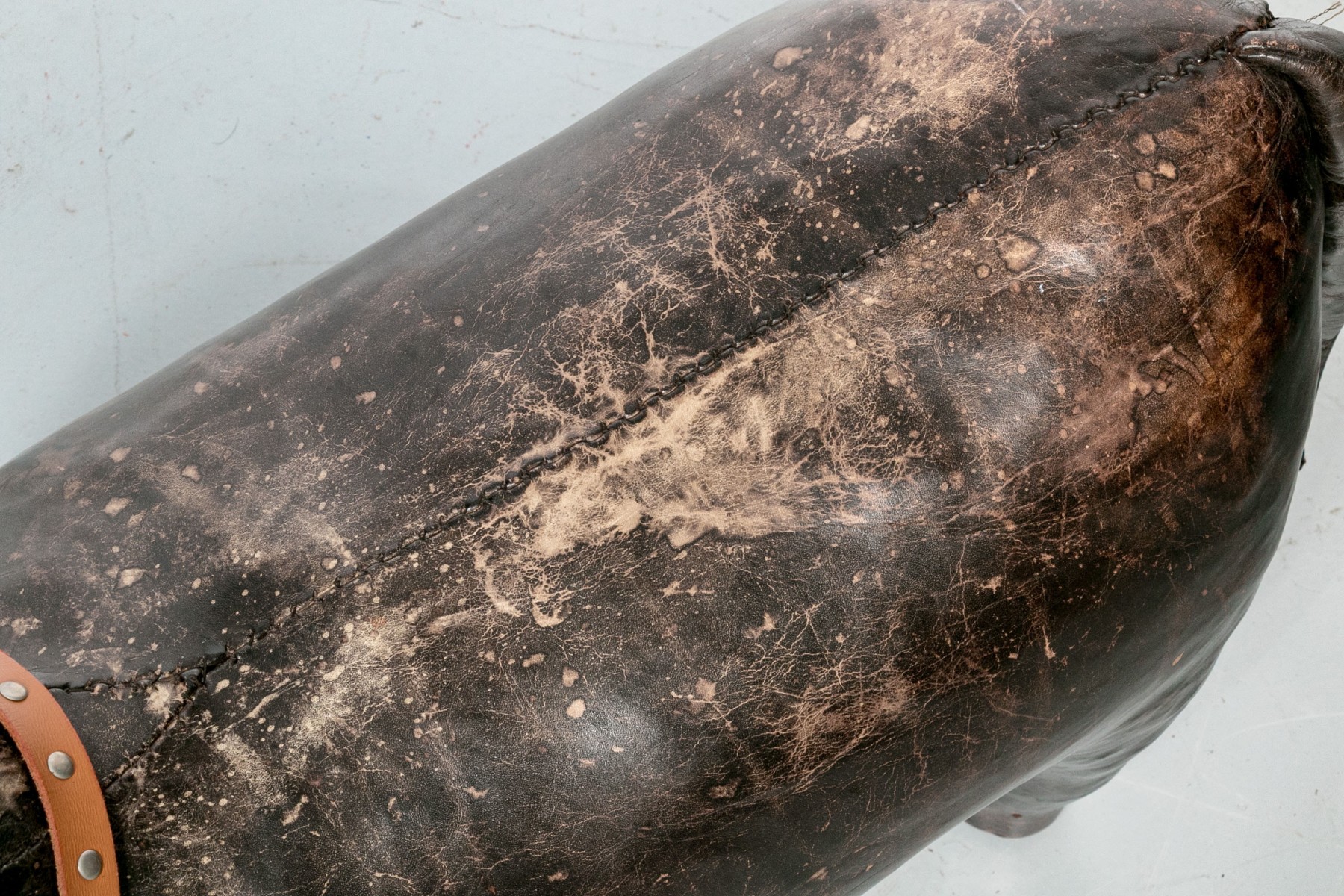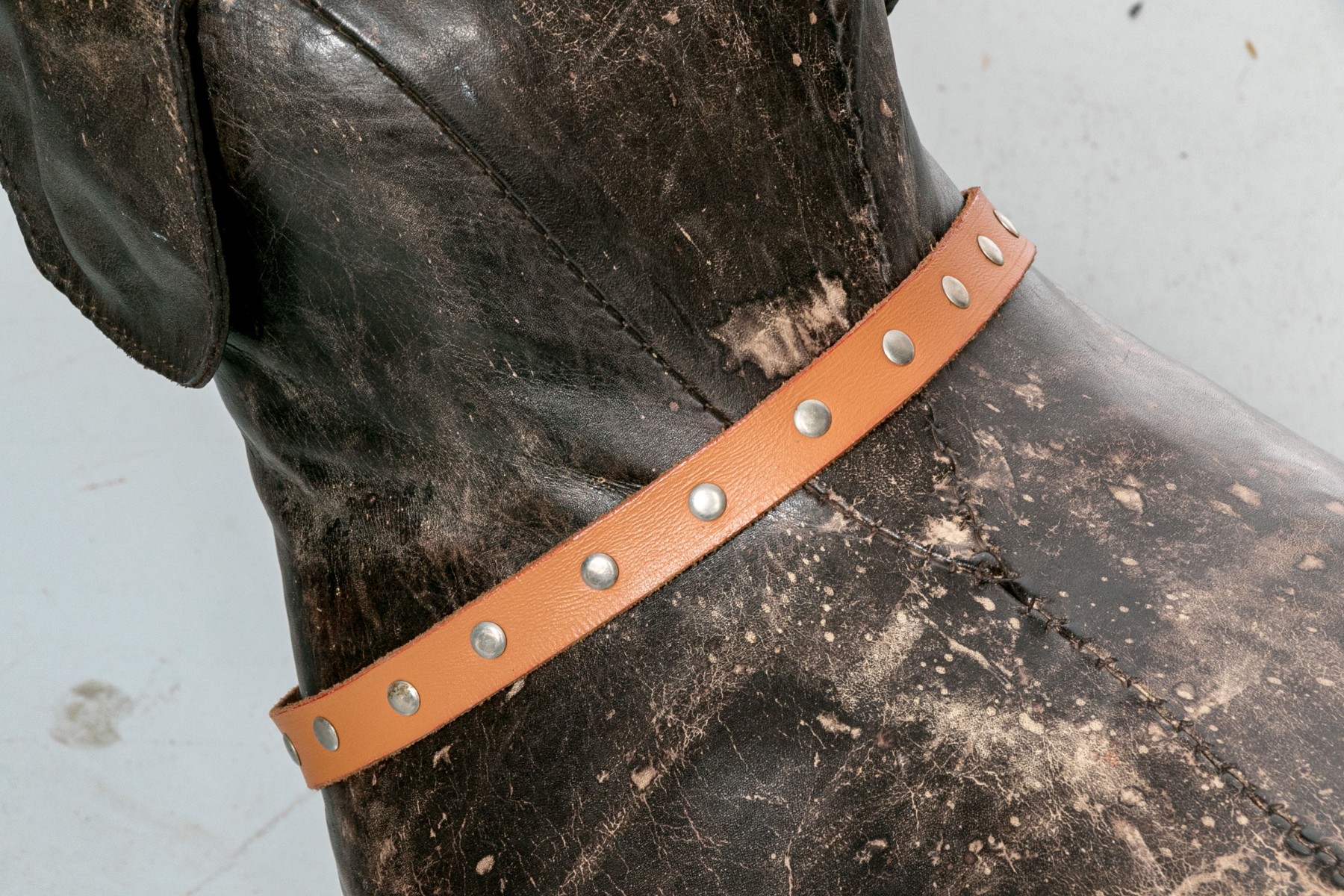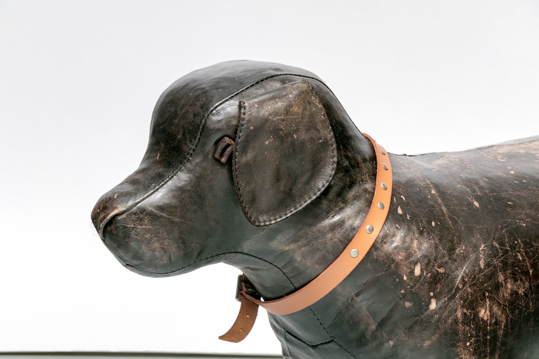 This leather dog figurine is wearing a collar with nailhead trim and is made out of quality leather material.