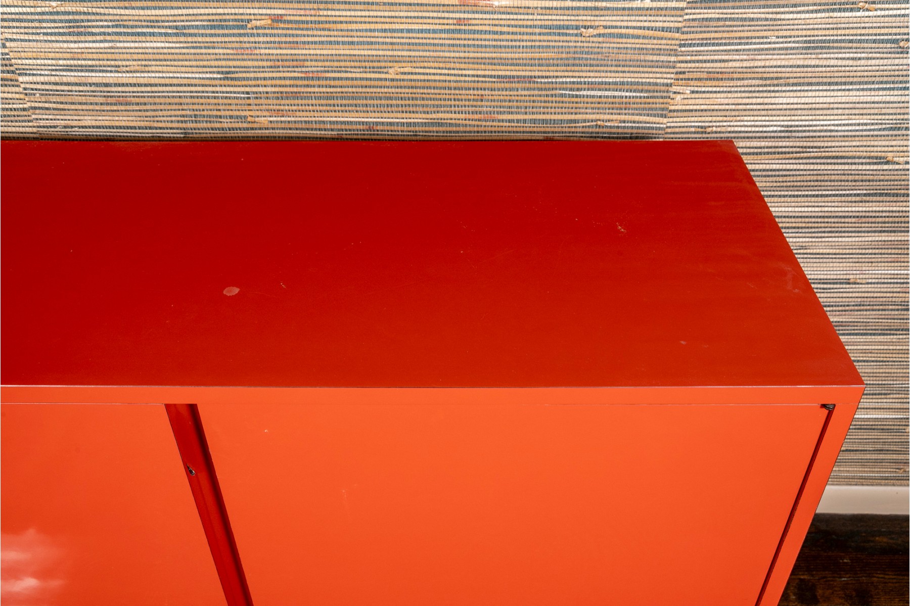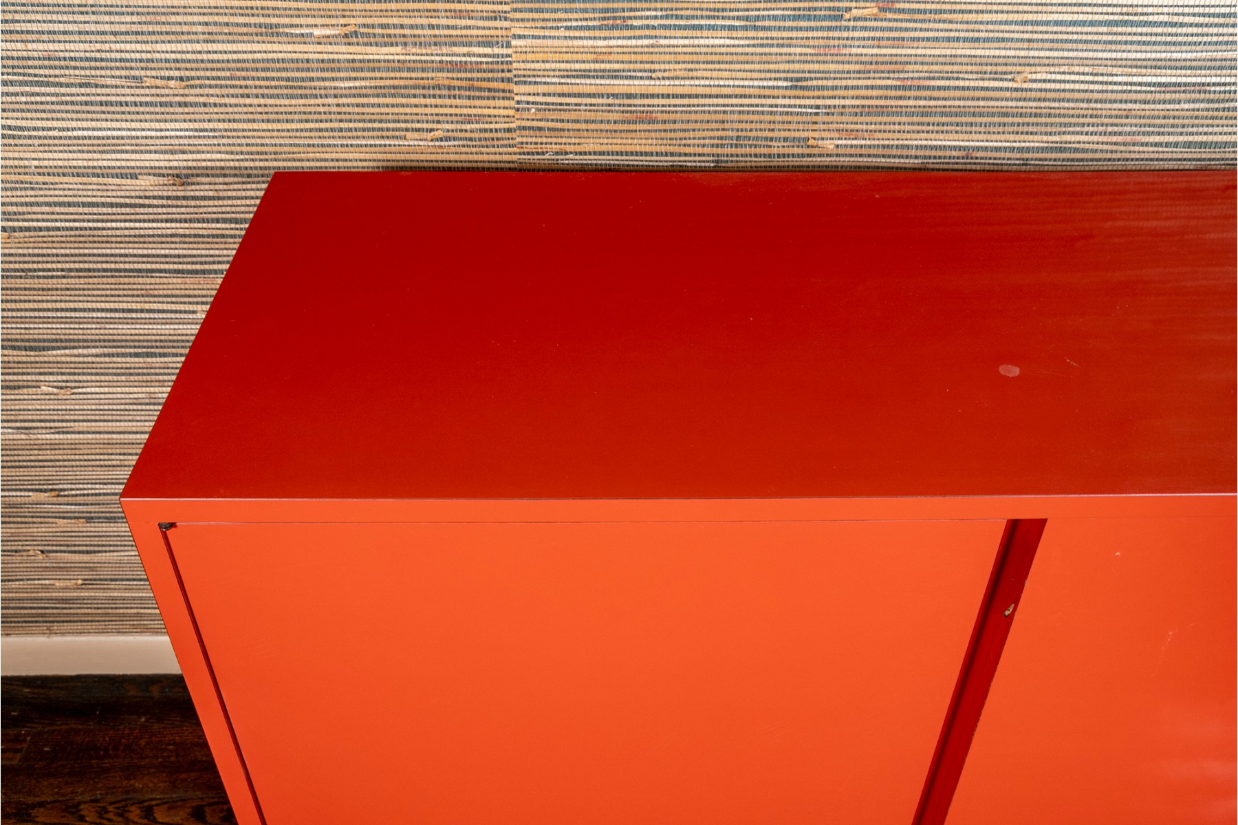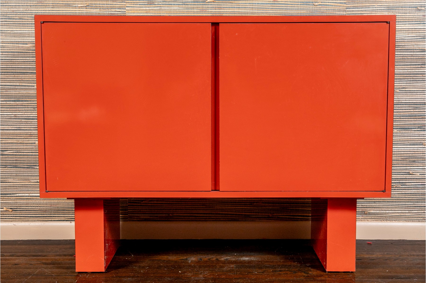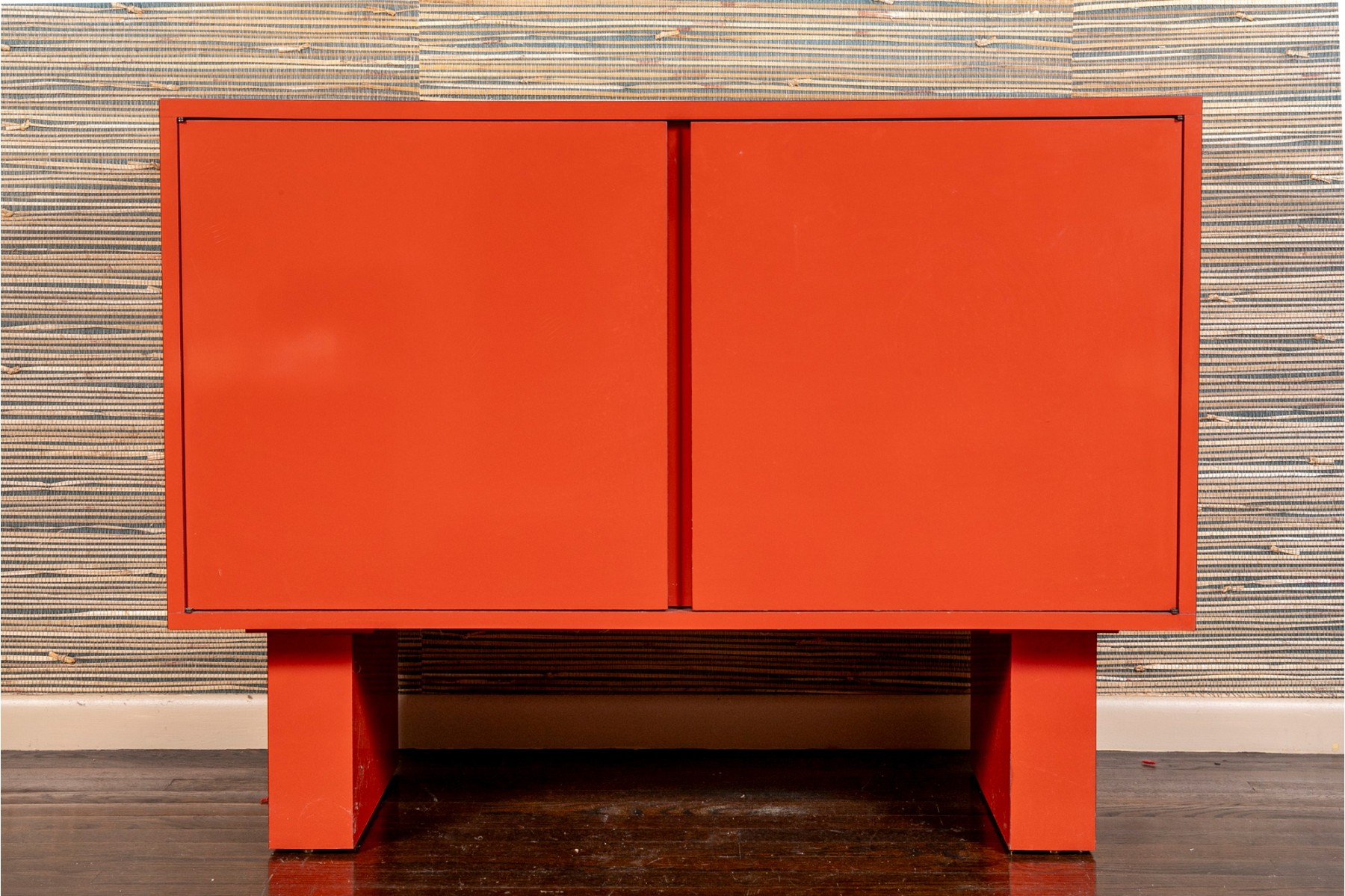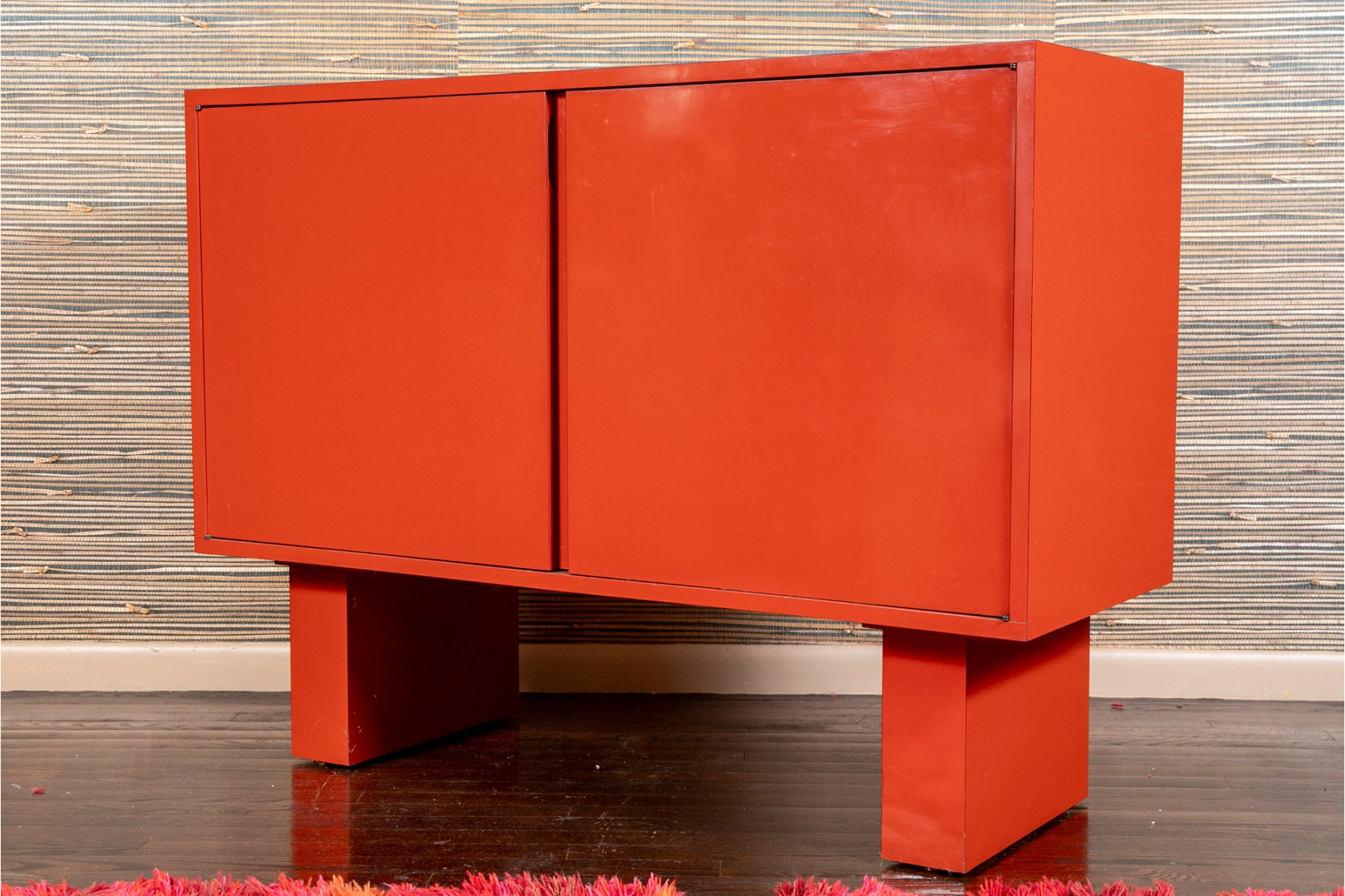 Playful MCM Laminate CabinetRaised on two ends with the case having two hinged doors opening to four shelves.