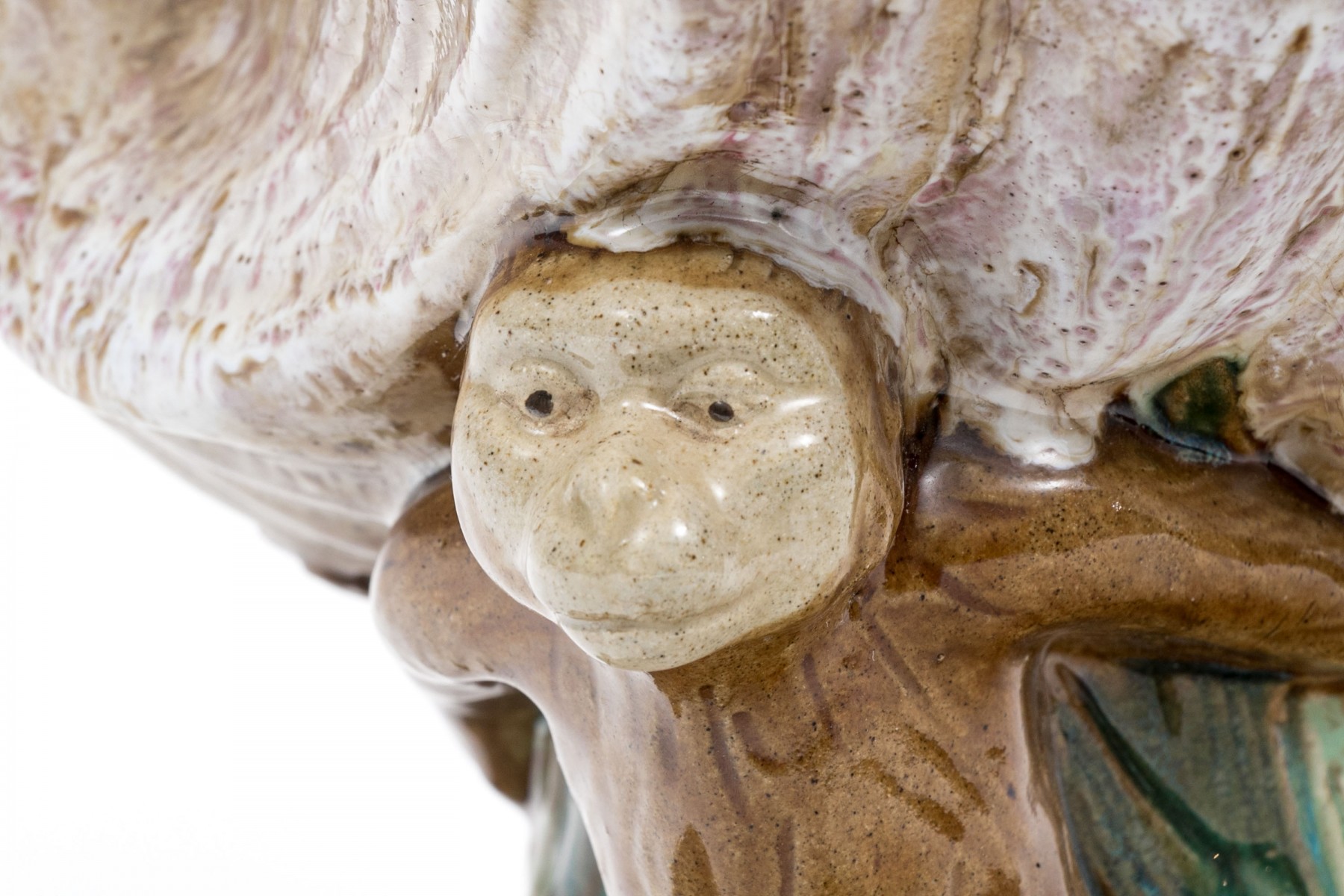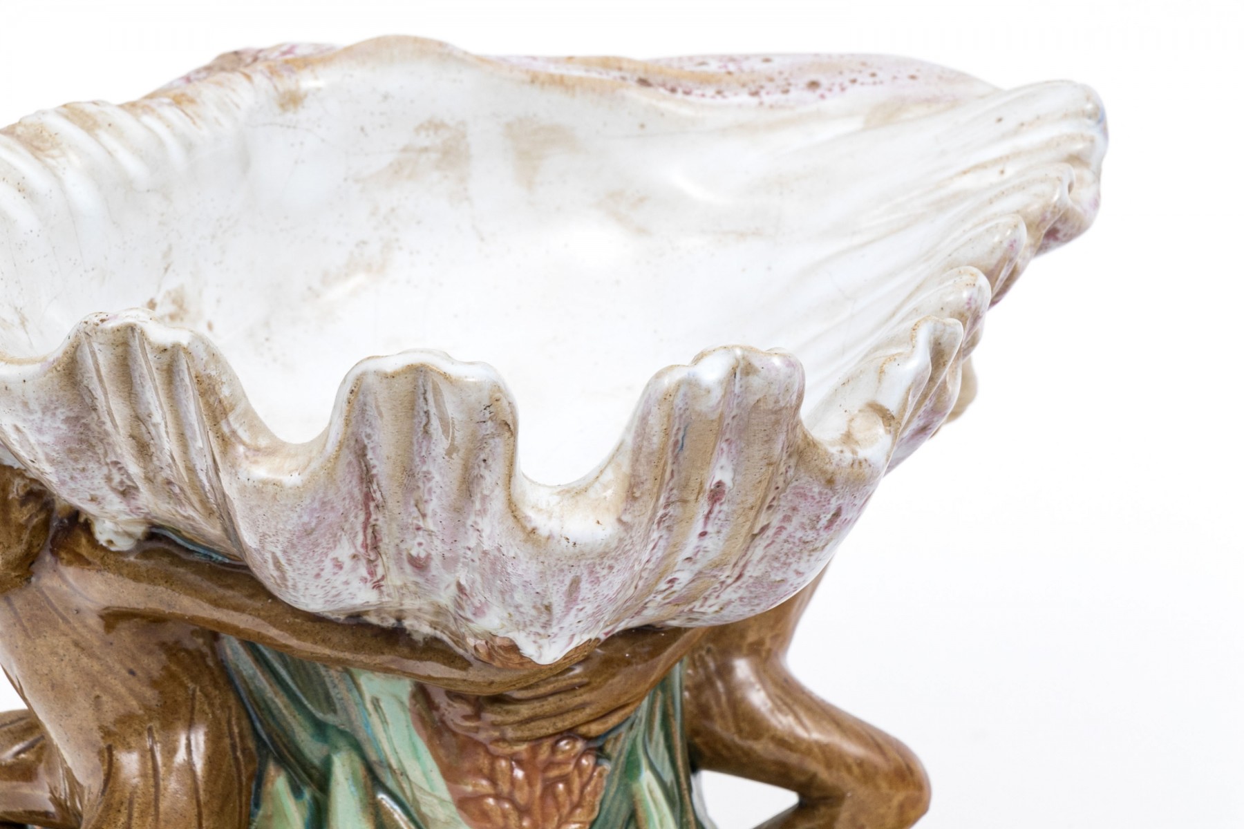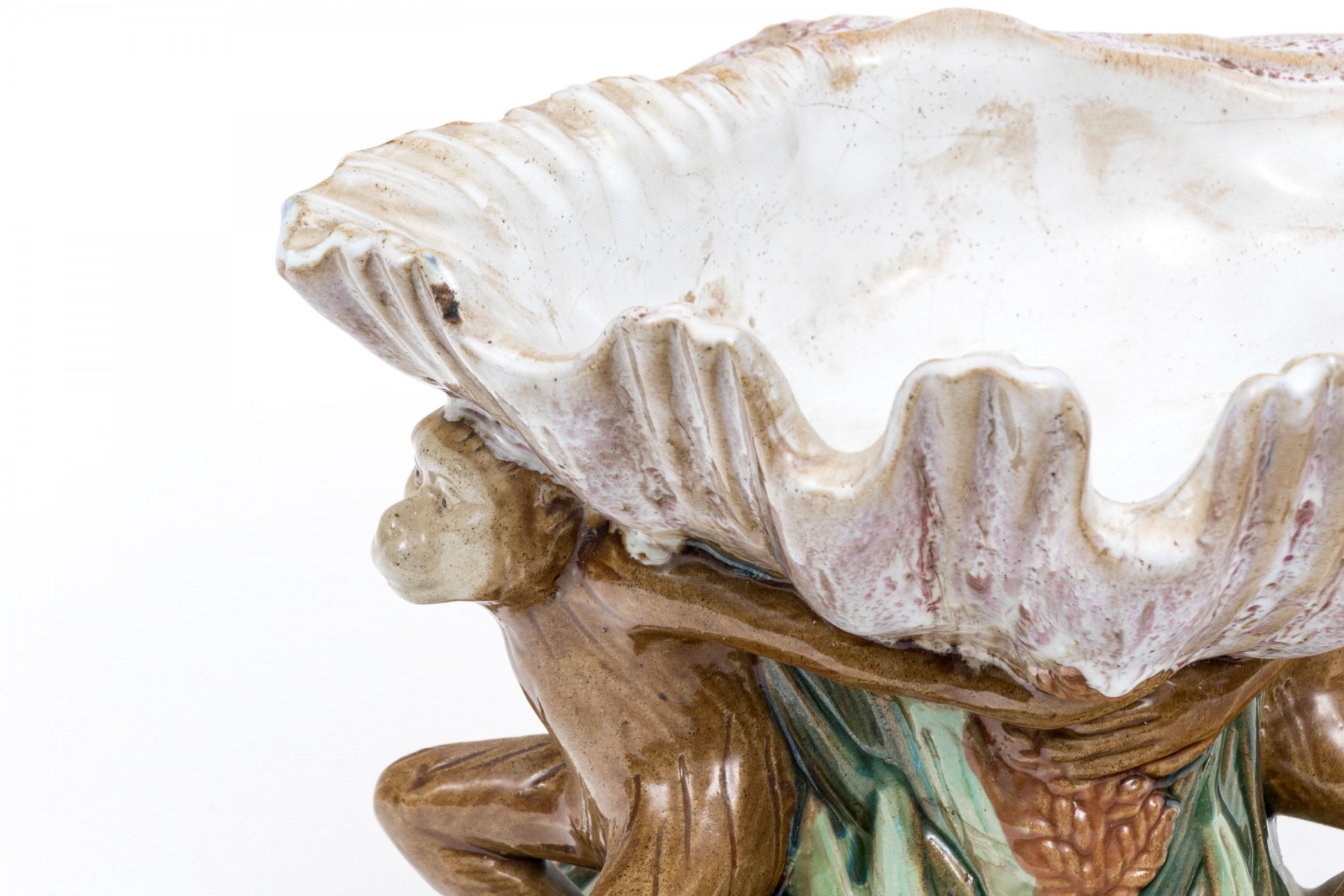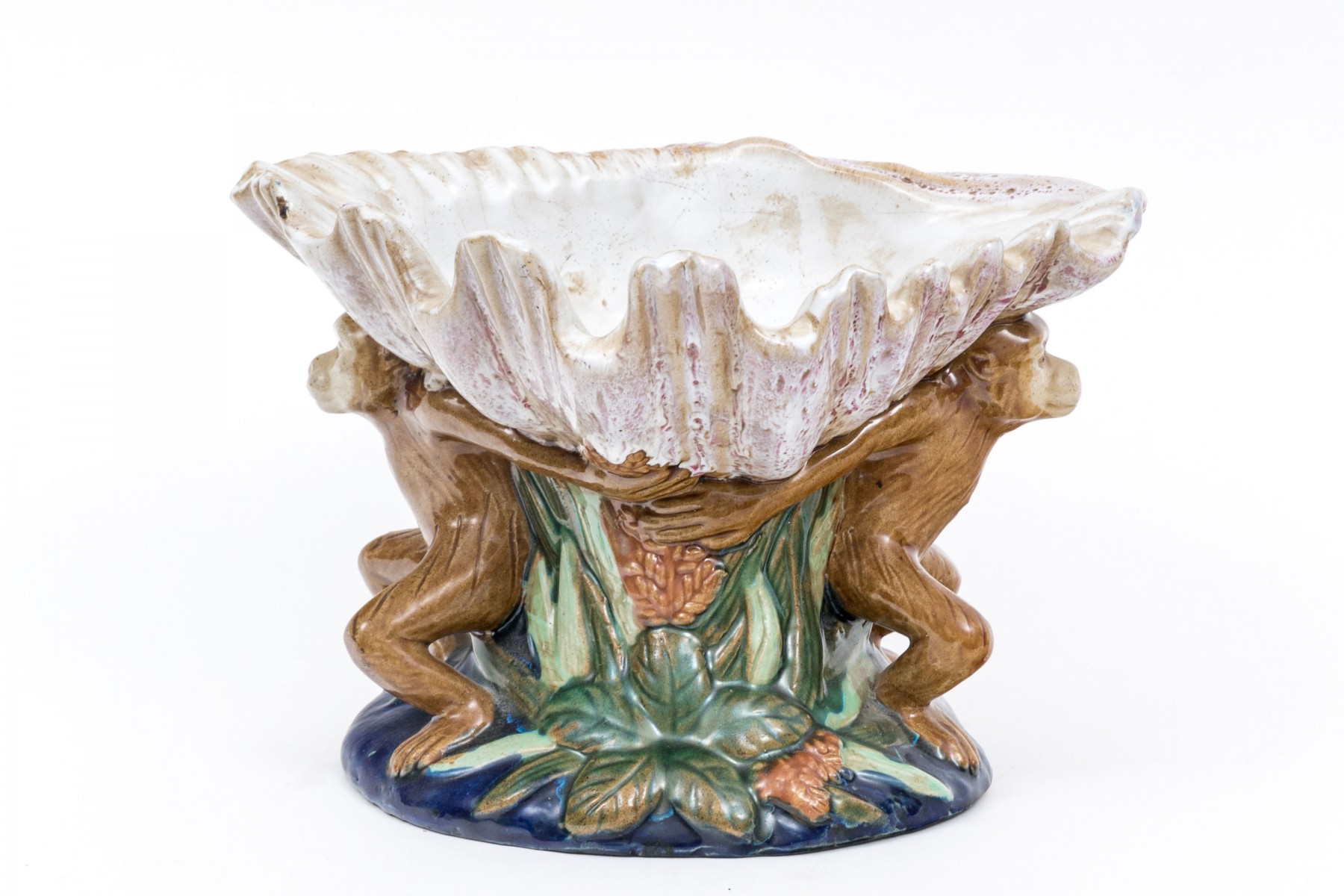 Playful vintage polychrome glazed Majolica compote bowl. Figural decoration depicting monkeys holding the shell form bowl.