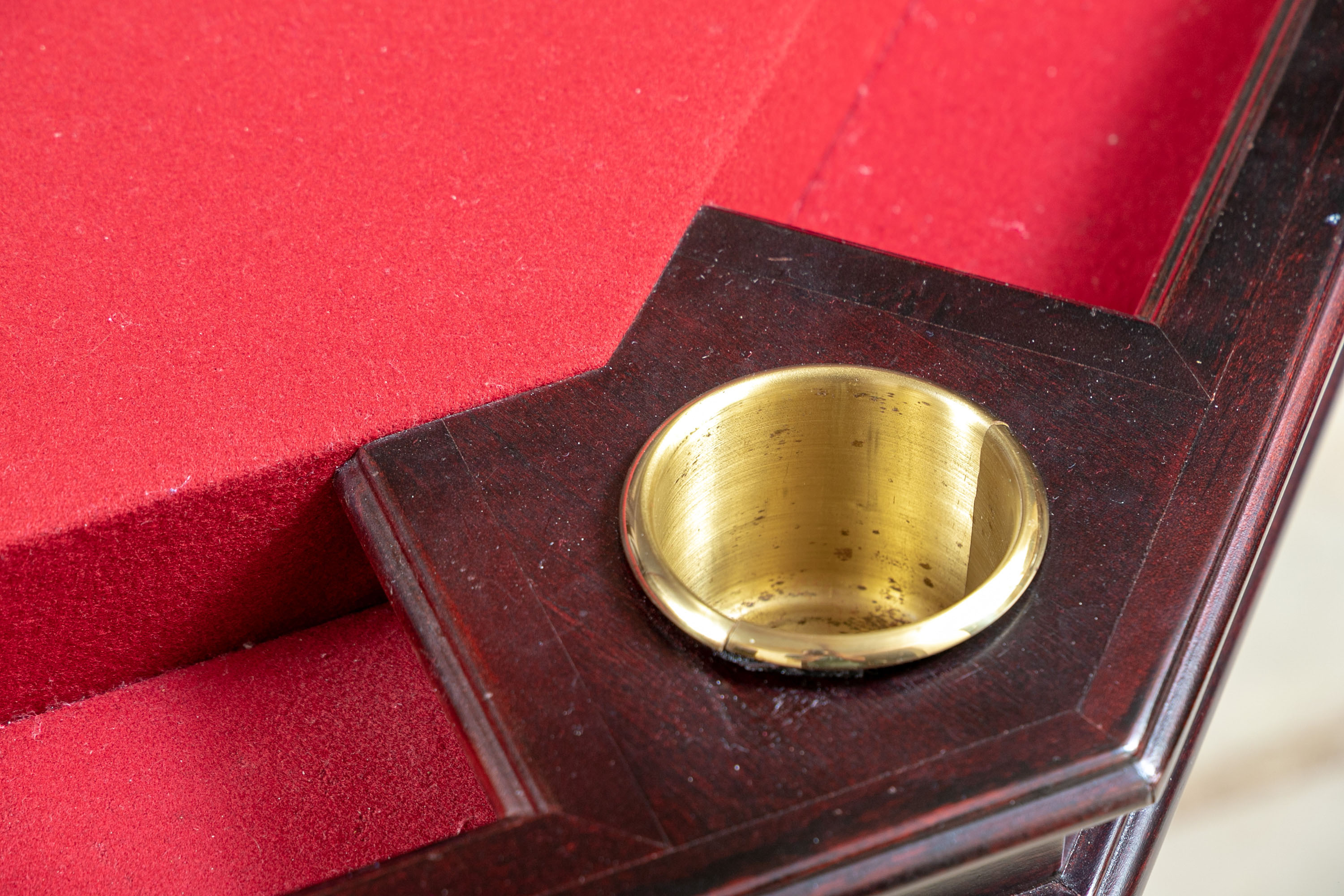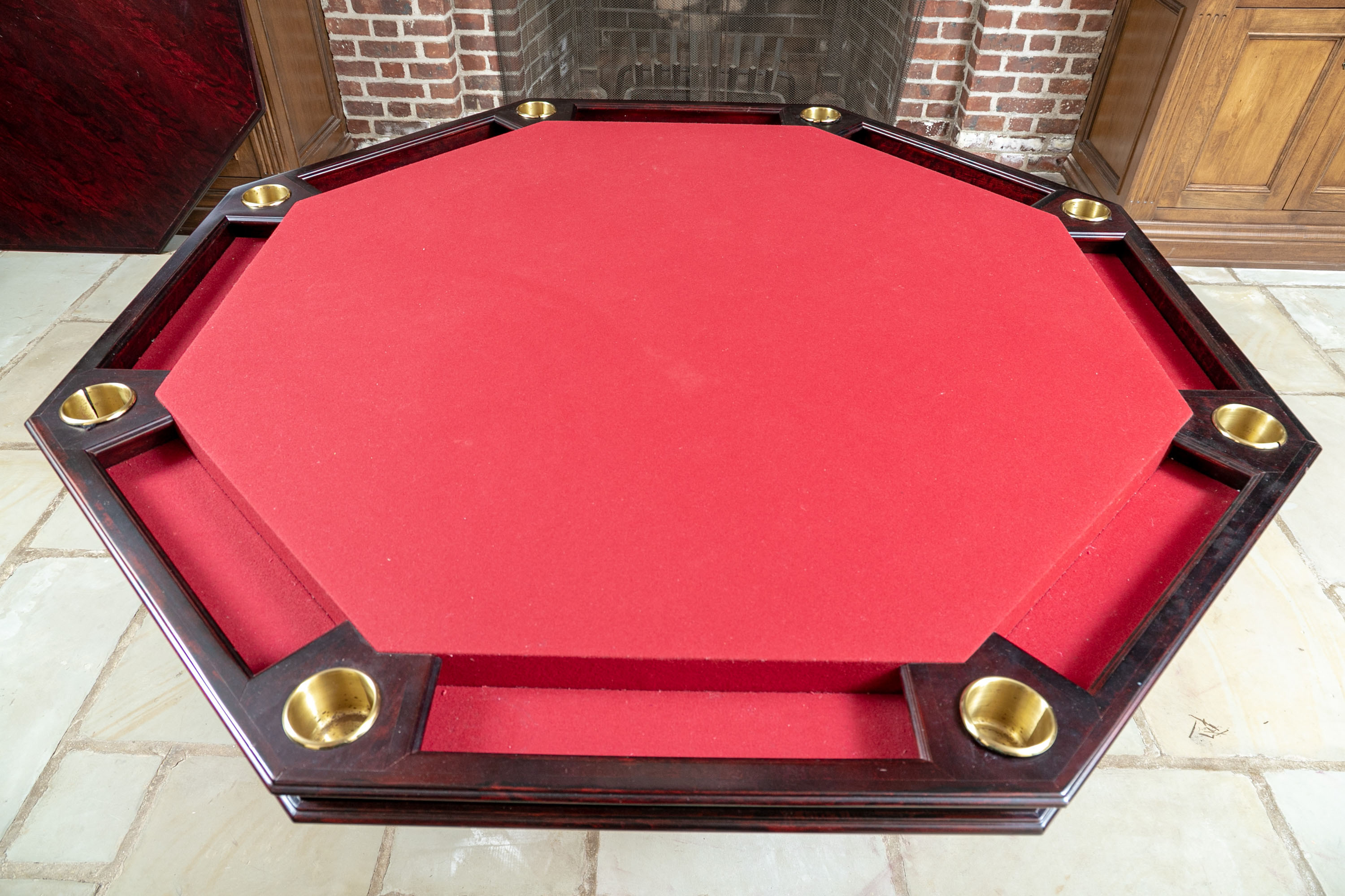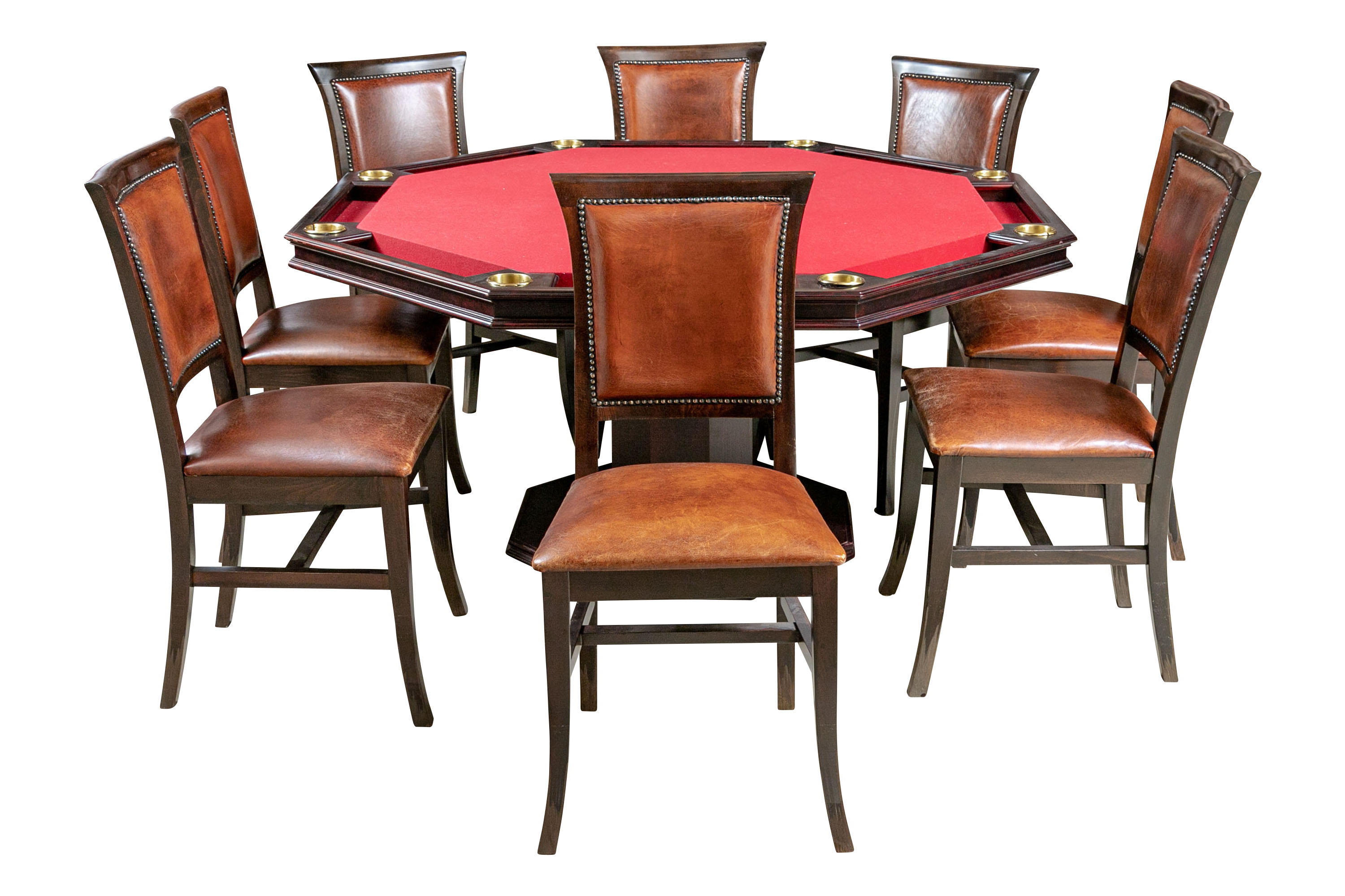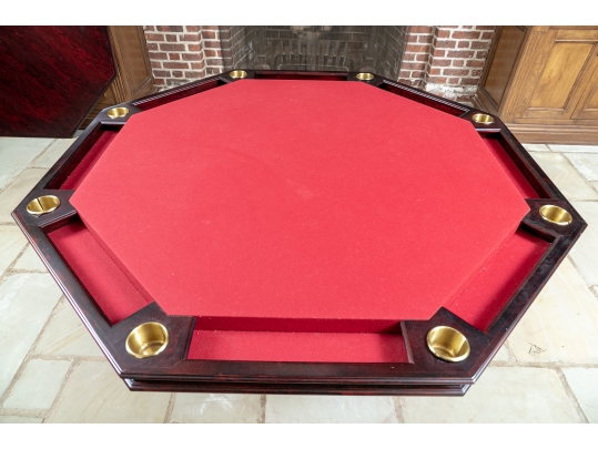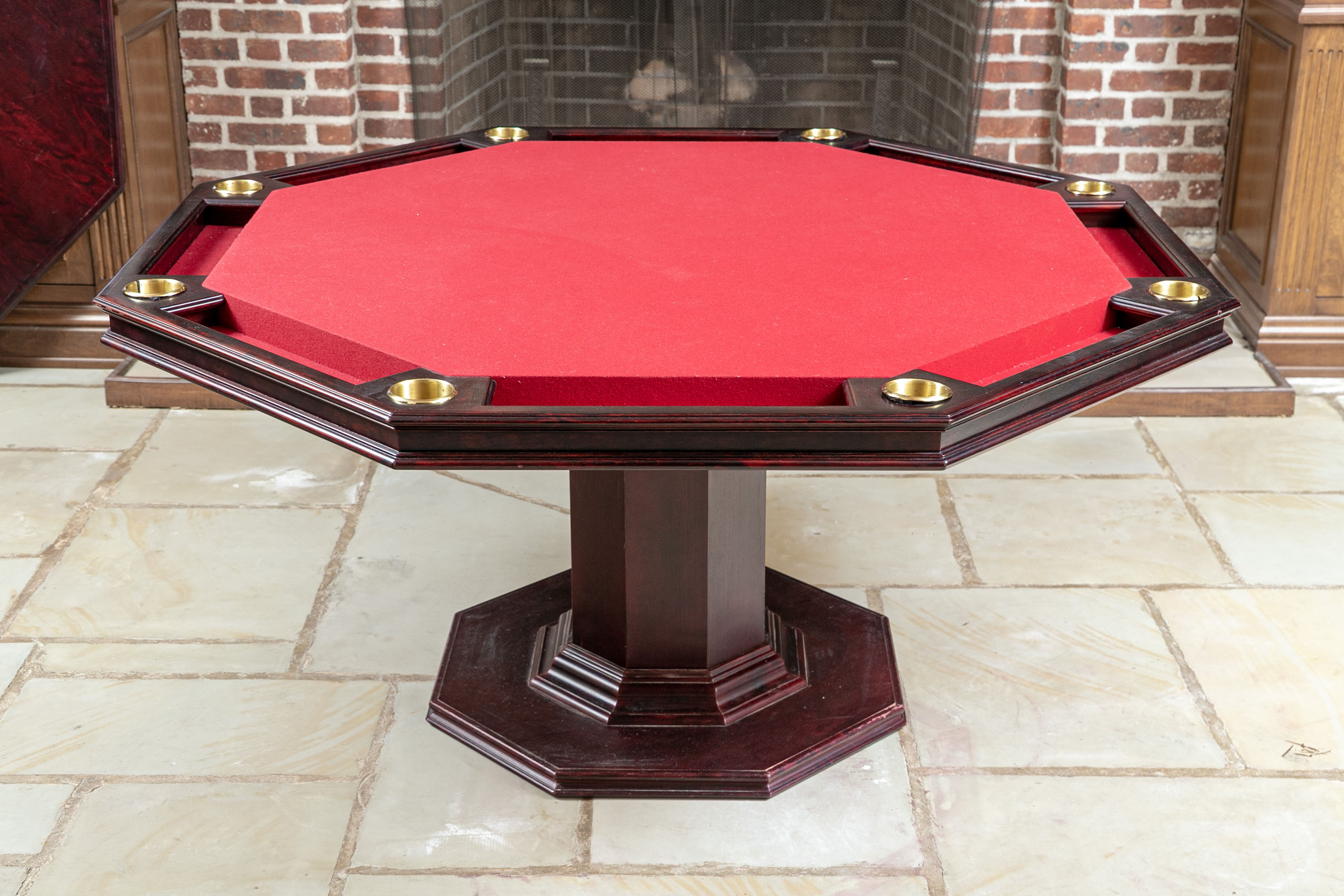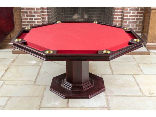 Poker table and chairs featuring table and seating for eight with red flocked top and brass cup holders on a pedestal base. Table comes with wood cover when not used for poker. Eight chairs included and they have faux leather back and seat with nailhead trim.