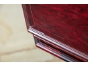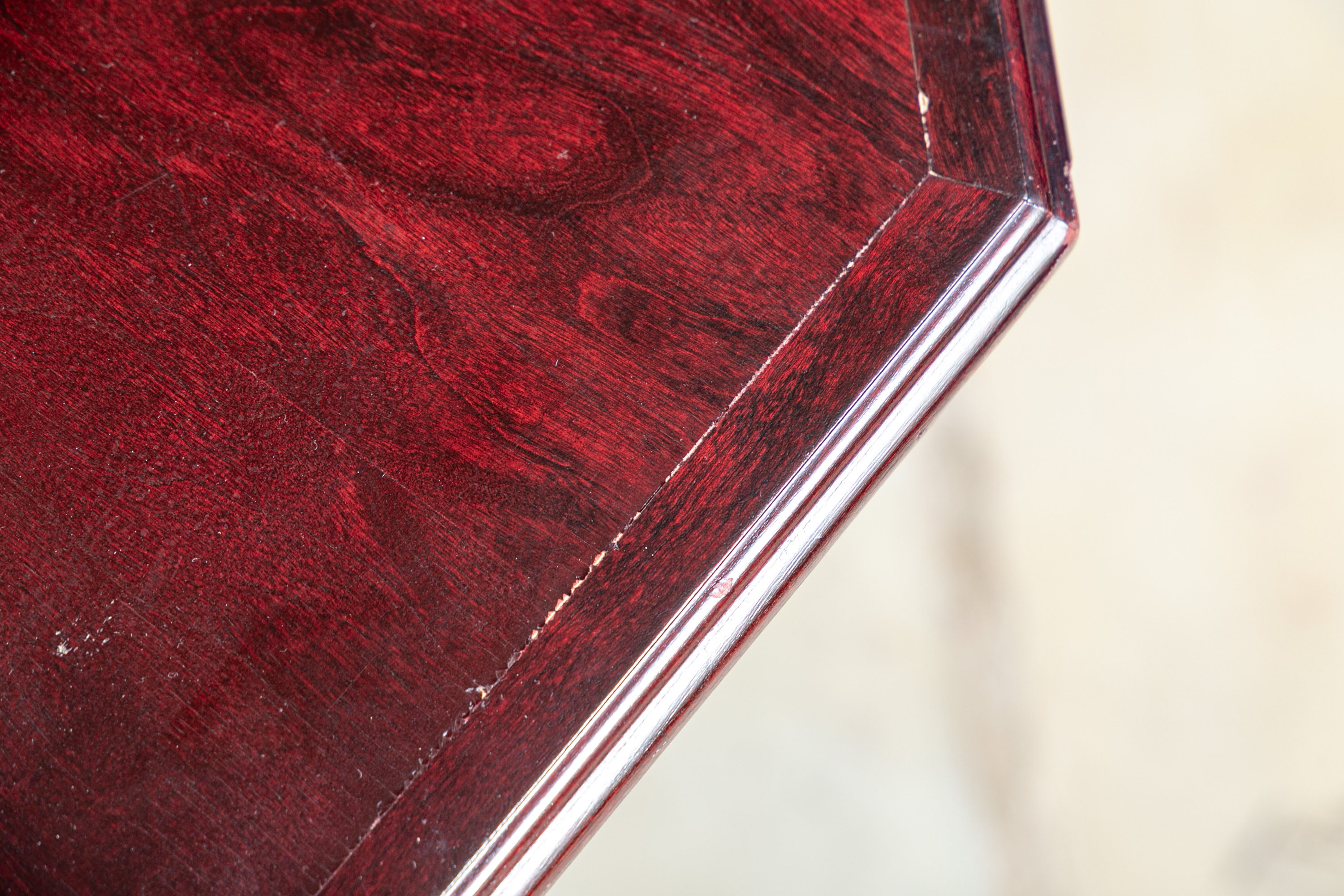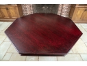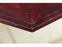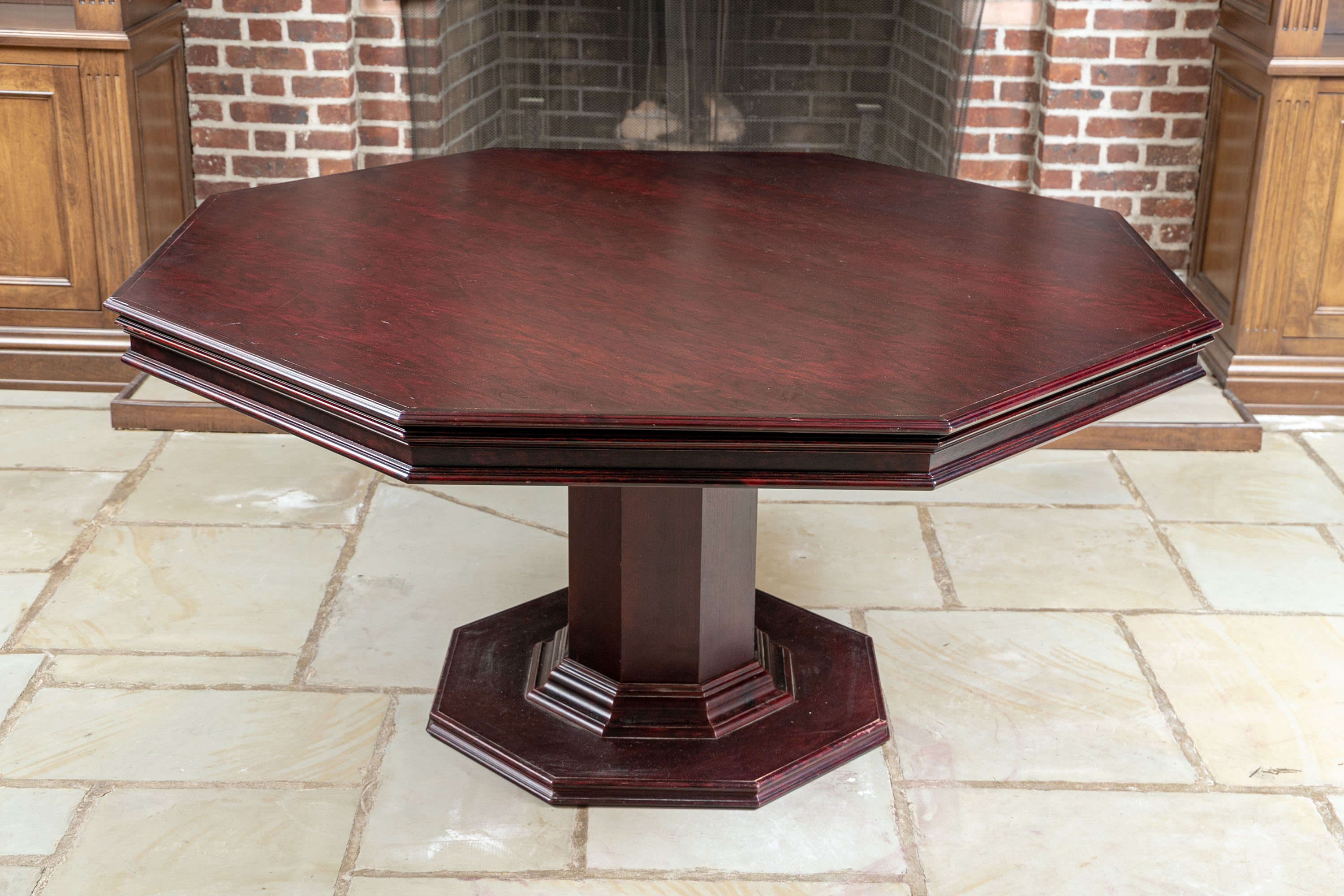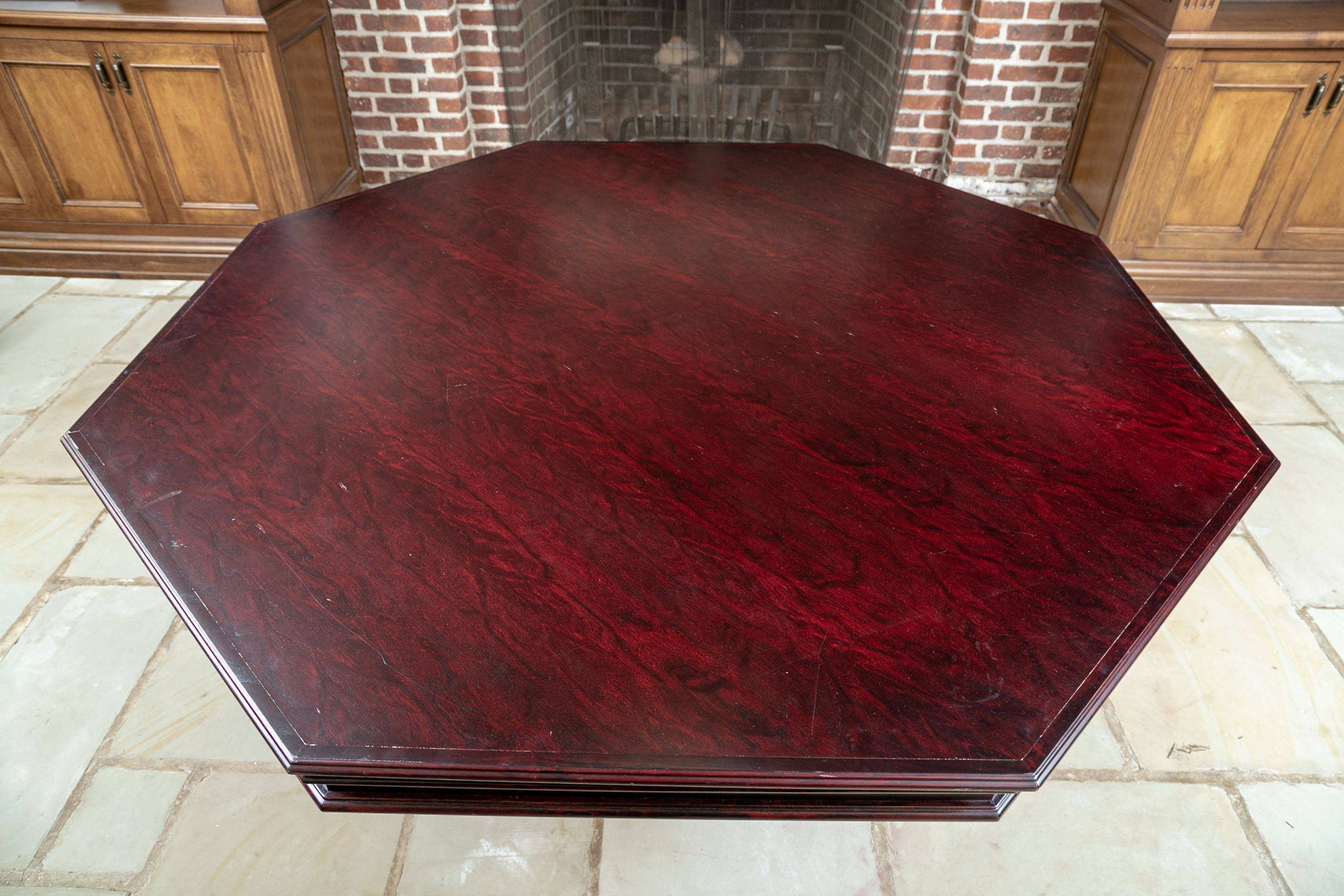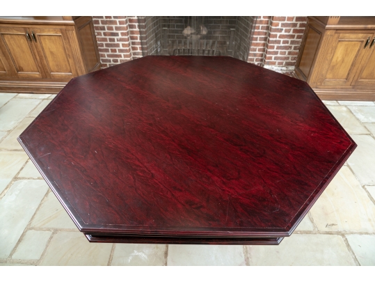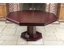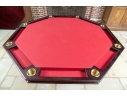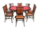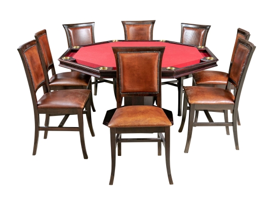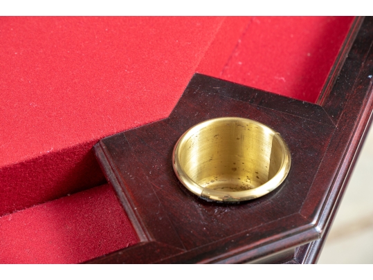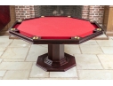 Poker table and chairs featuring table and seating for eight with red flocked top and brass cup holders on a pedestal base. Table comes with wood cover when not used for poker. Eight chairs included and they have faux leather back and seat with nailhead trim.