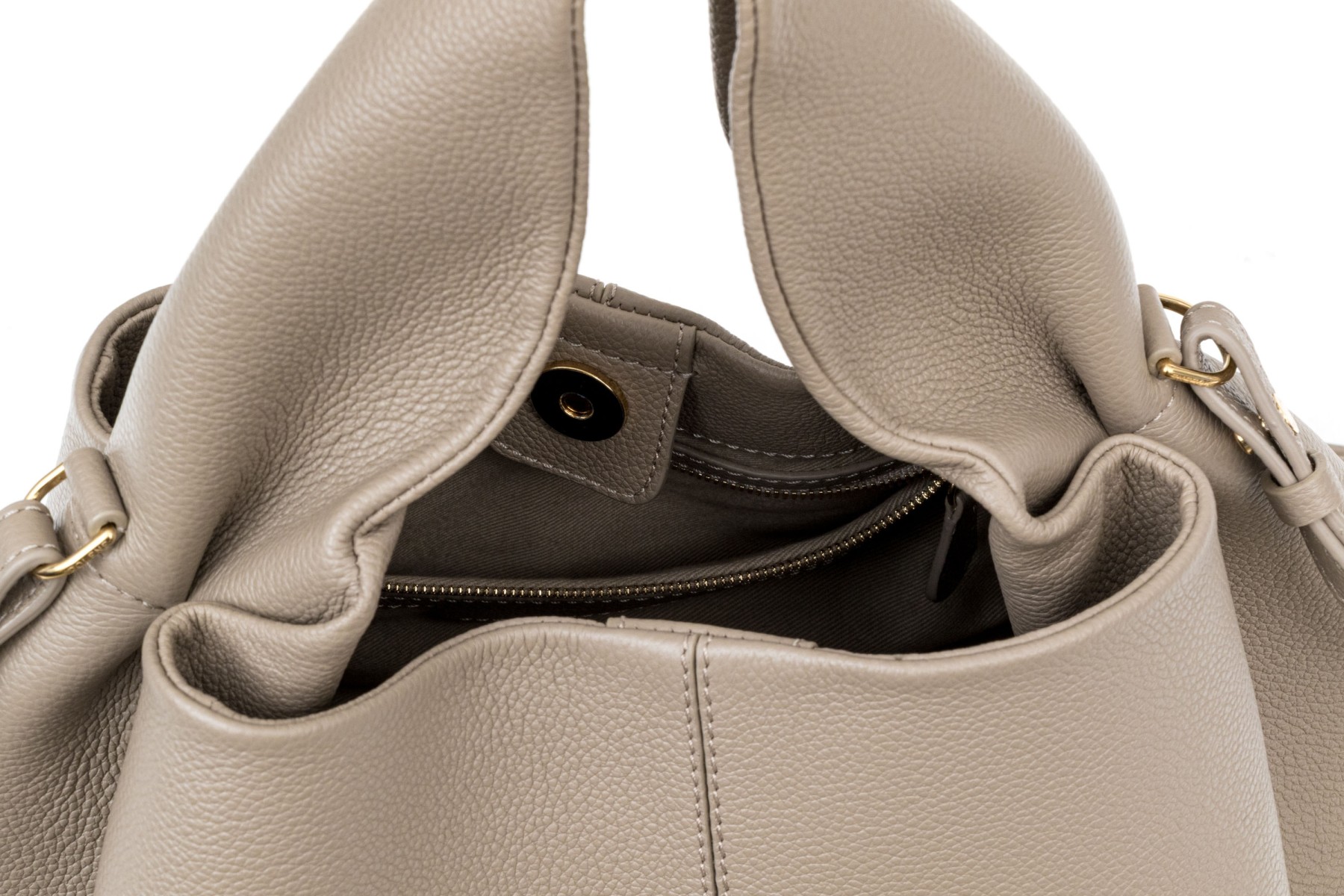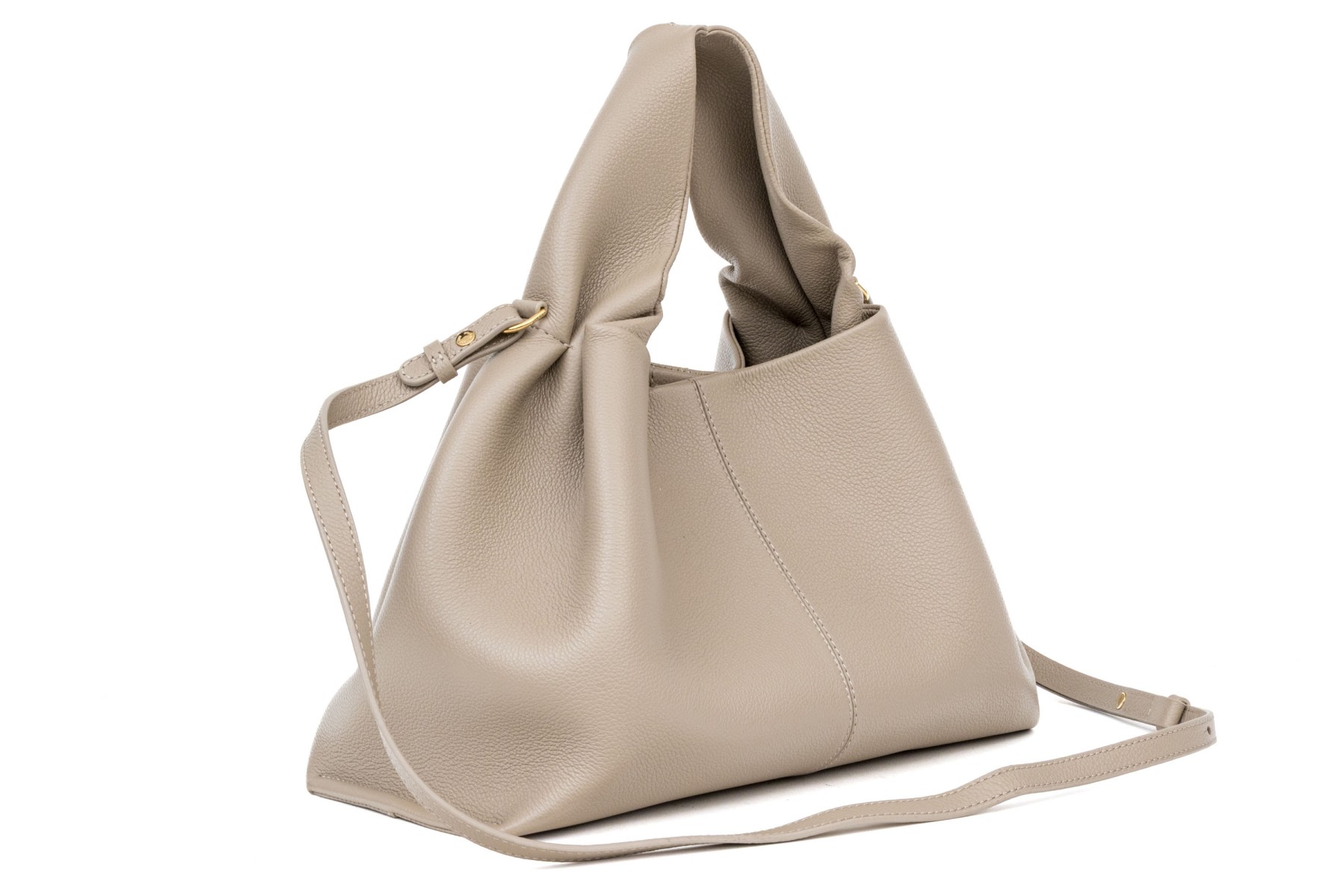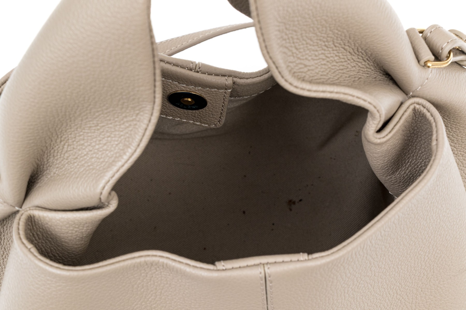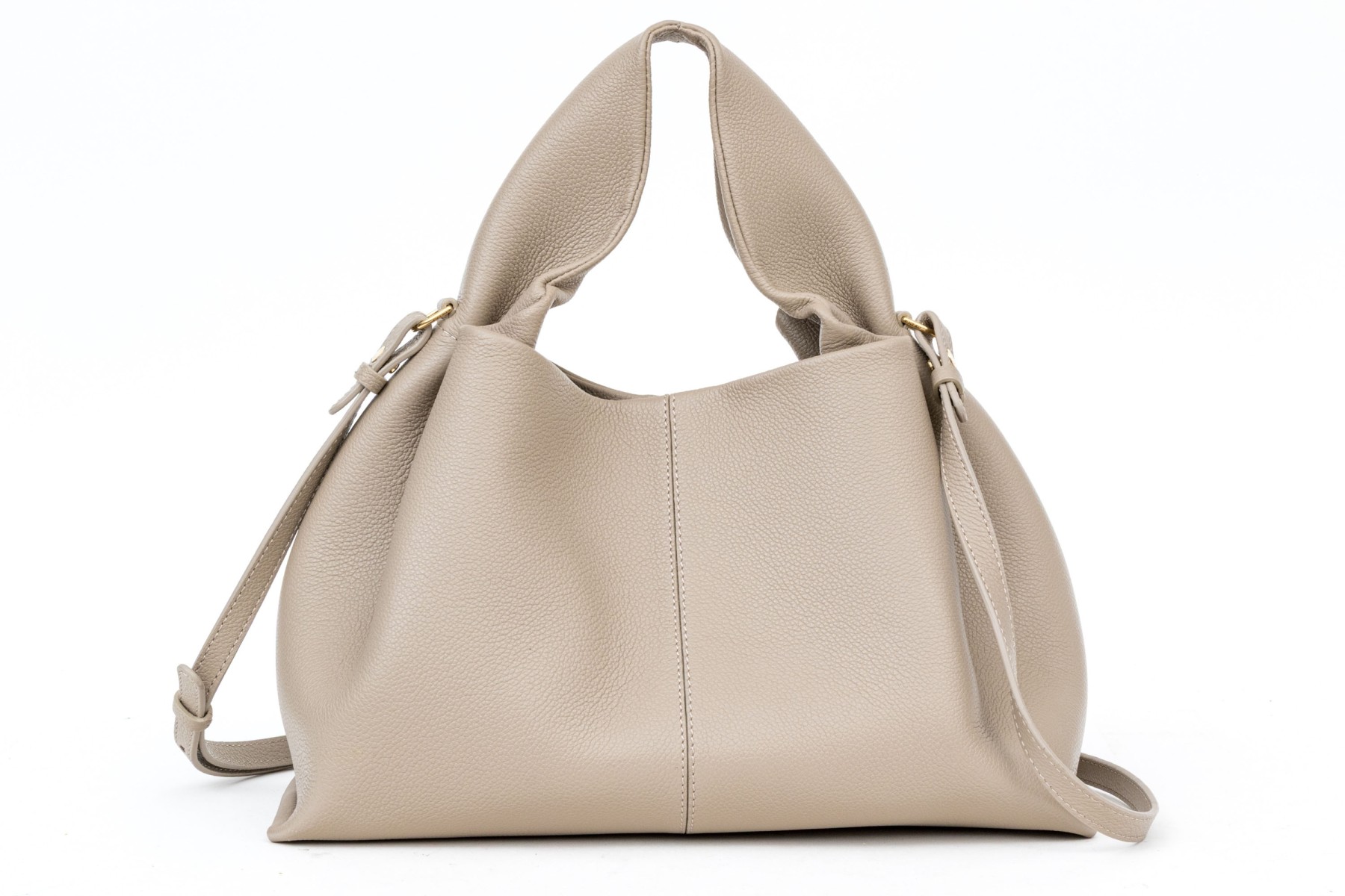 Crafted in supple taupe-grain leather, this Polène Numéro Dix handbag features a softl structure with signature knotted handles at the top. The bag includes an adjustable and detachable shoulder strap