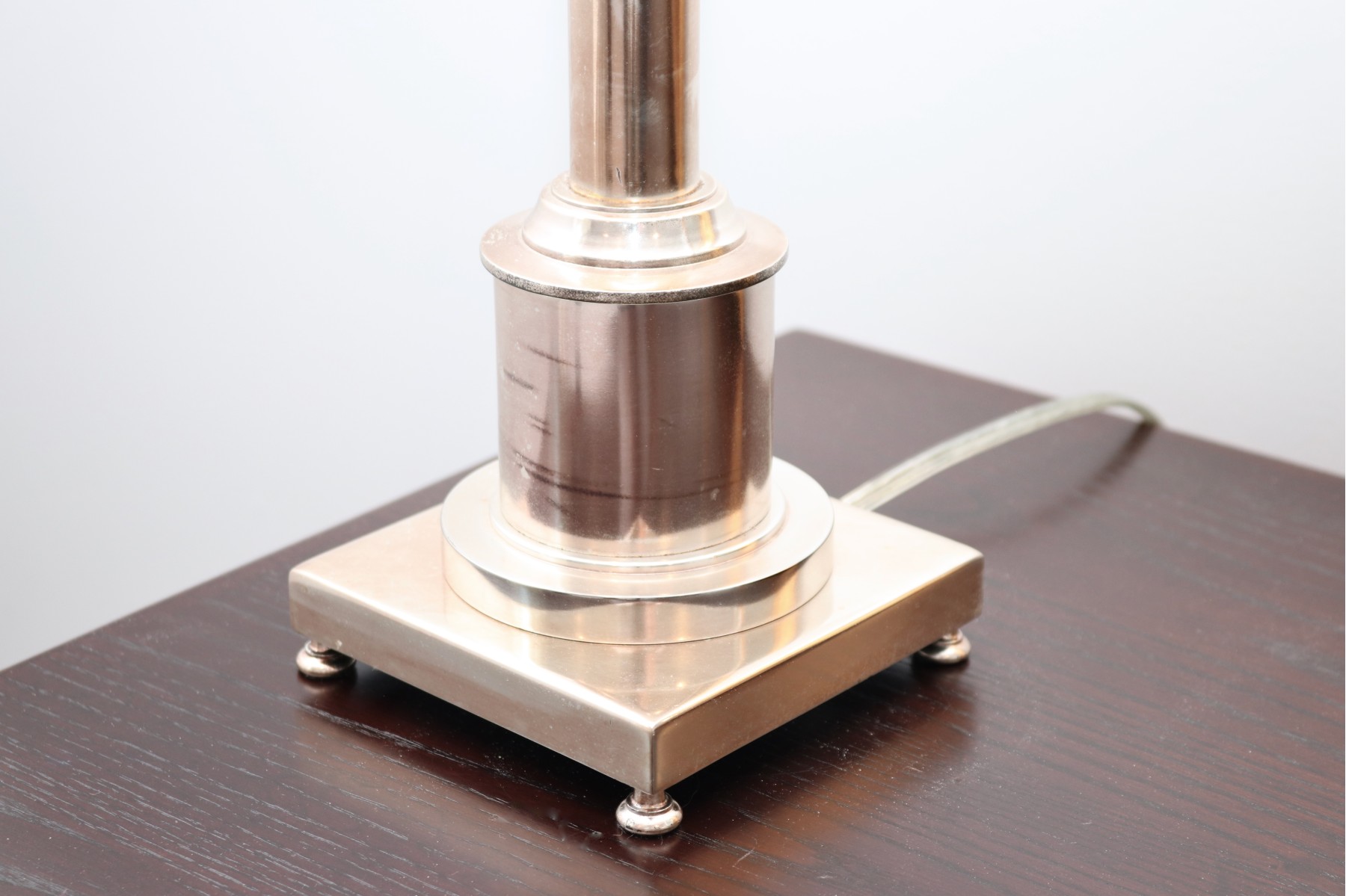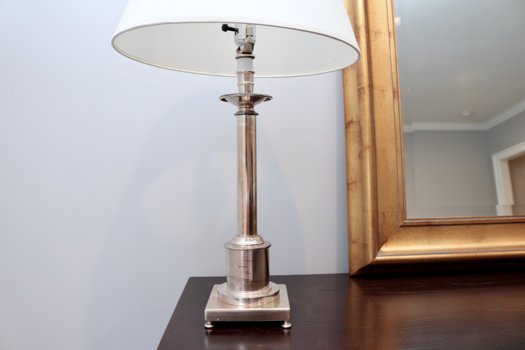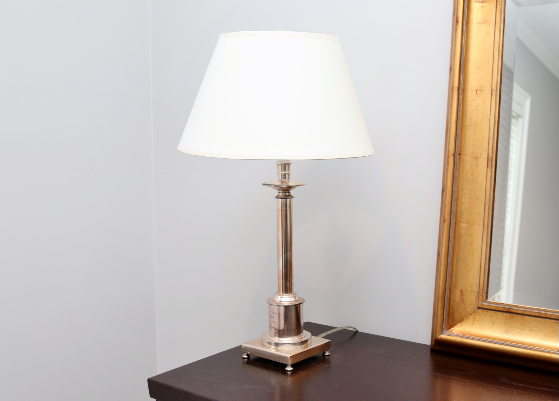 This sleek table lamp features a polished nickel column base with architectural detailing and a stepped square plinth resting on small ball feet. Topped with a classic white tapered shade and coordinating finial, it blends traditional design with contemporary shine. Perfect for bedside, desk, or console table use.