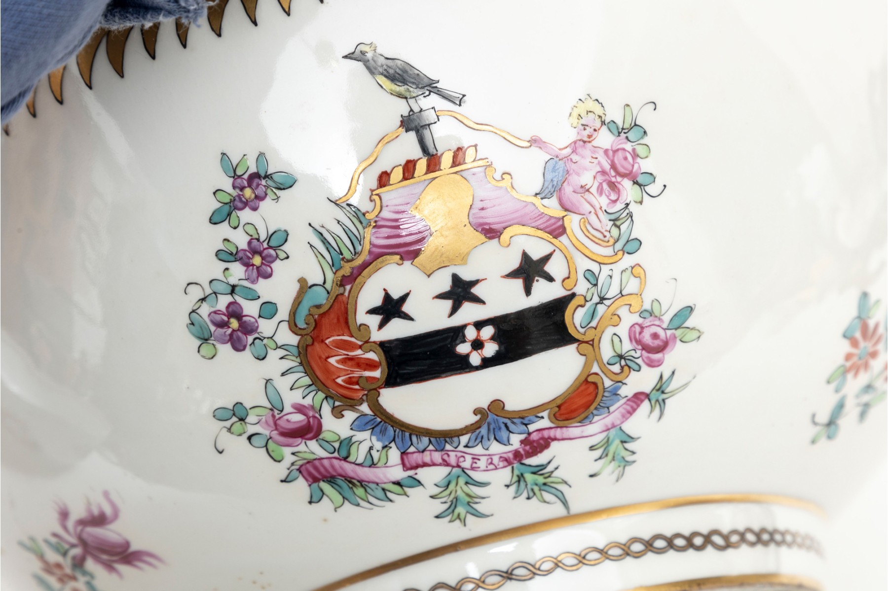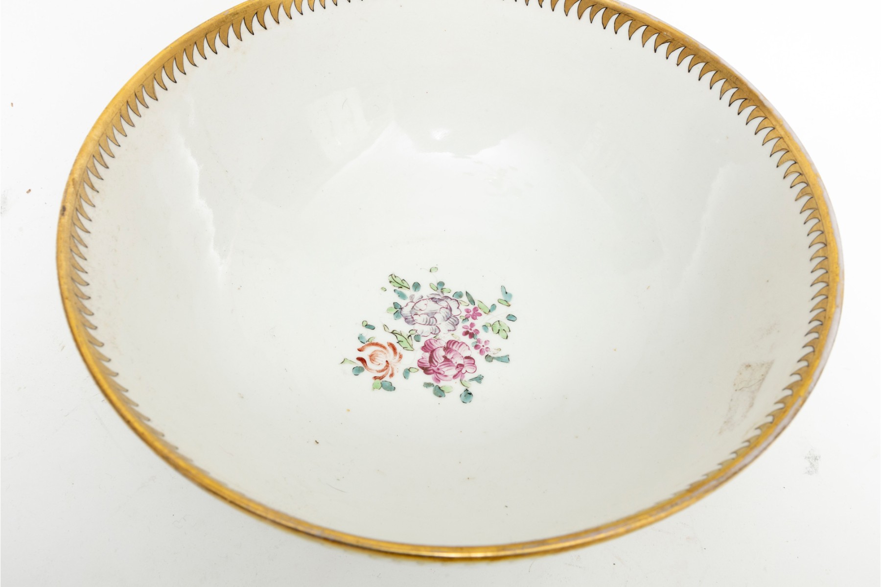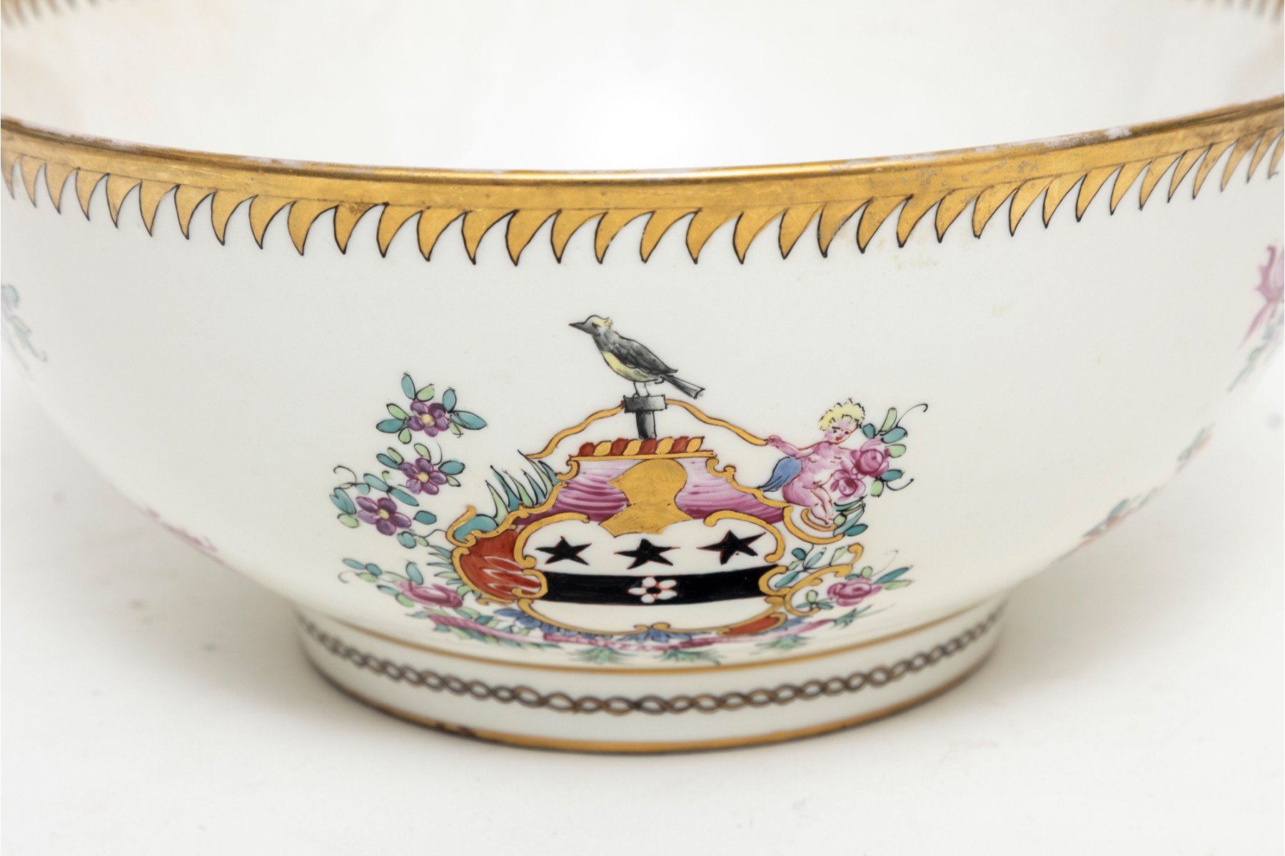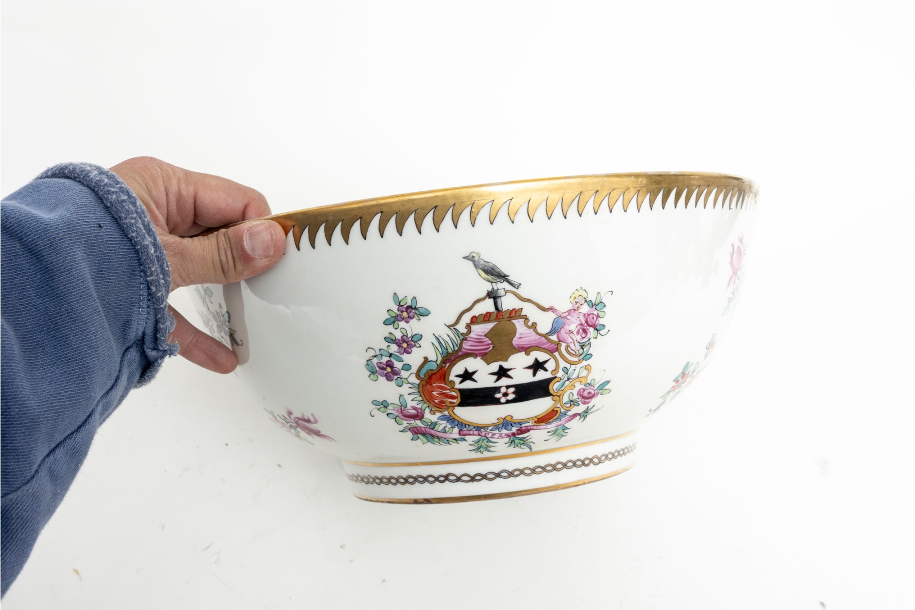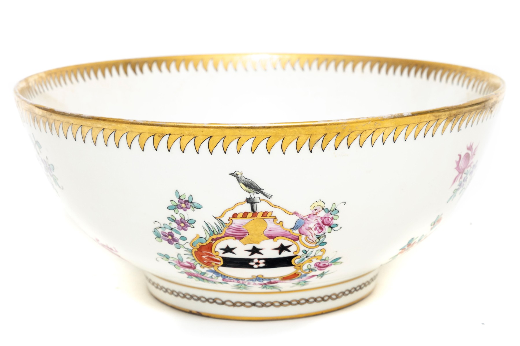 Porcelain de Paris antique Chinese export punch bowl displaying a vibrant gilt border around the rim and floral sprays throughout, leading to an armorial focal with a bird perched over a black and white striped shield with star motifs.