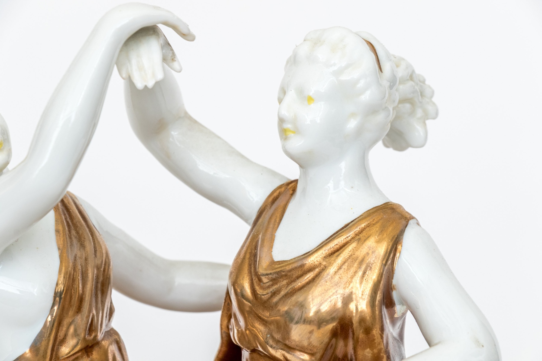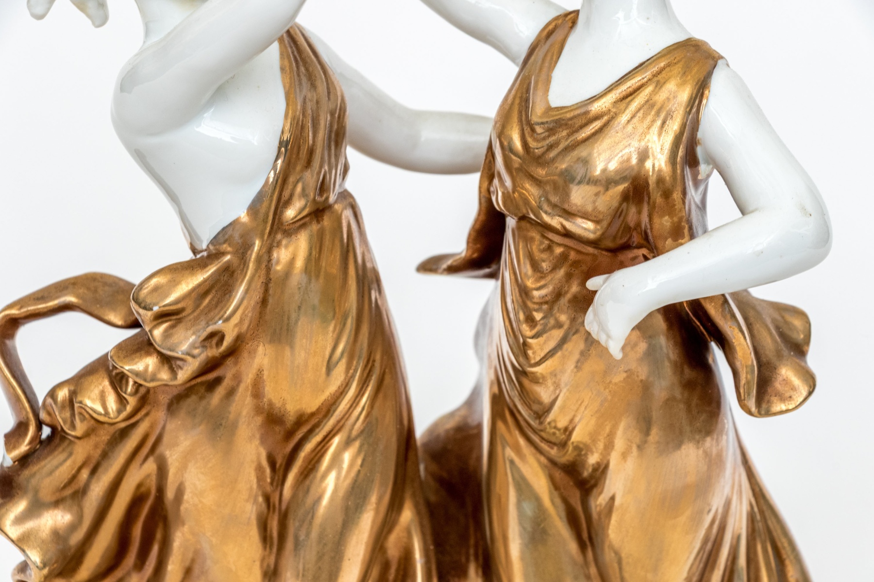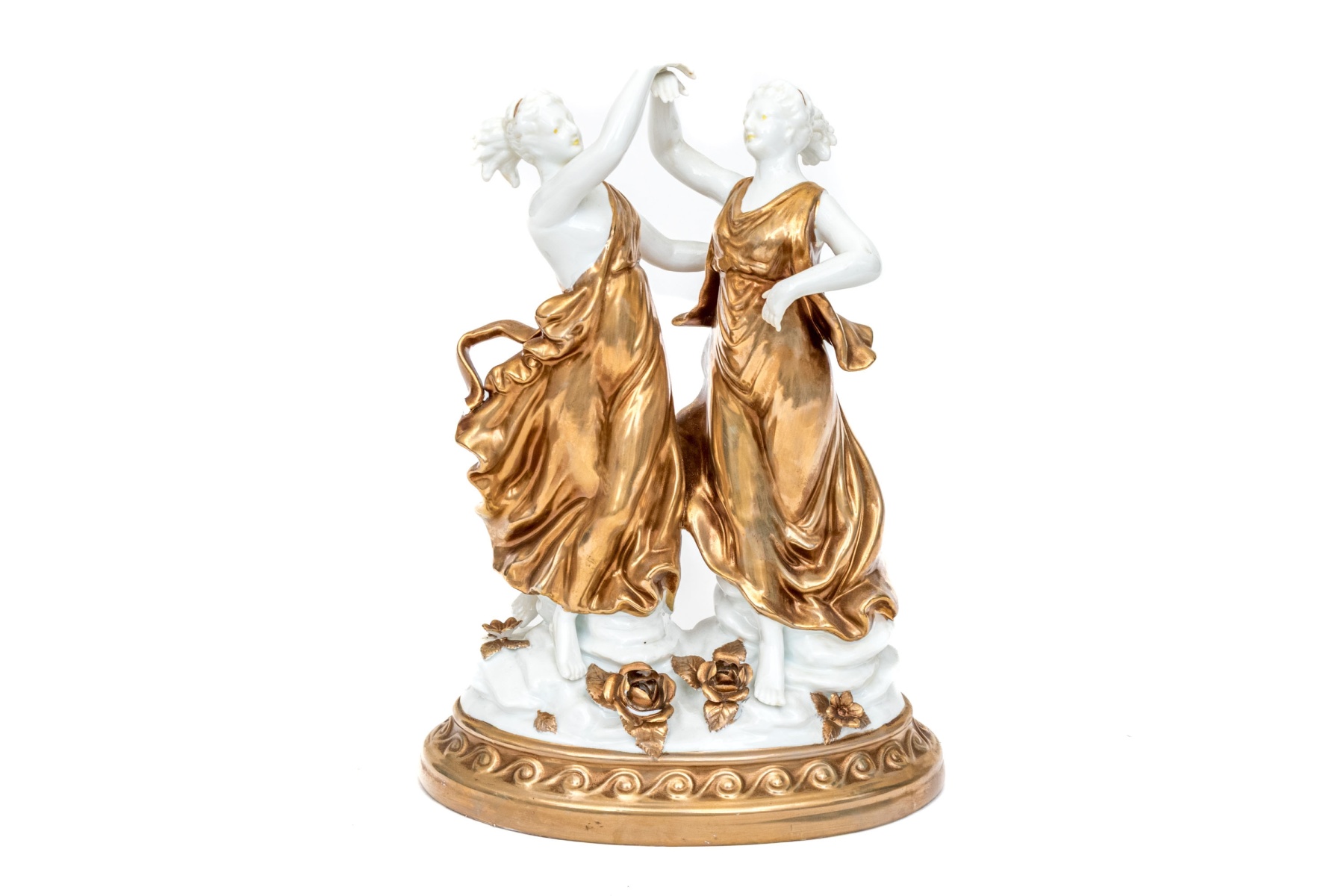 A striking porcelain sculpture in the manner of Capodimonte and Volkstedt depicting two elegant neoclassical ladies dancing with hair pulled back and arms raised, wearing lavishly gilt, billowing dresses over an oval base with large flowers a band of waving motifs around the foot.