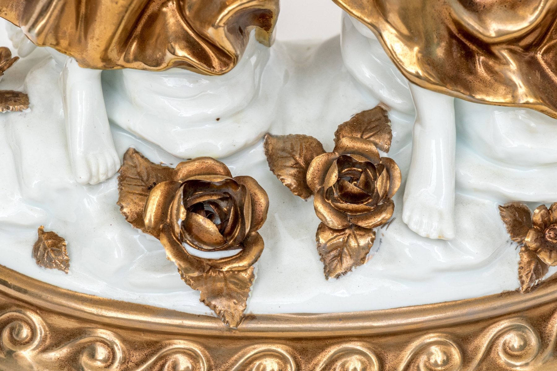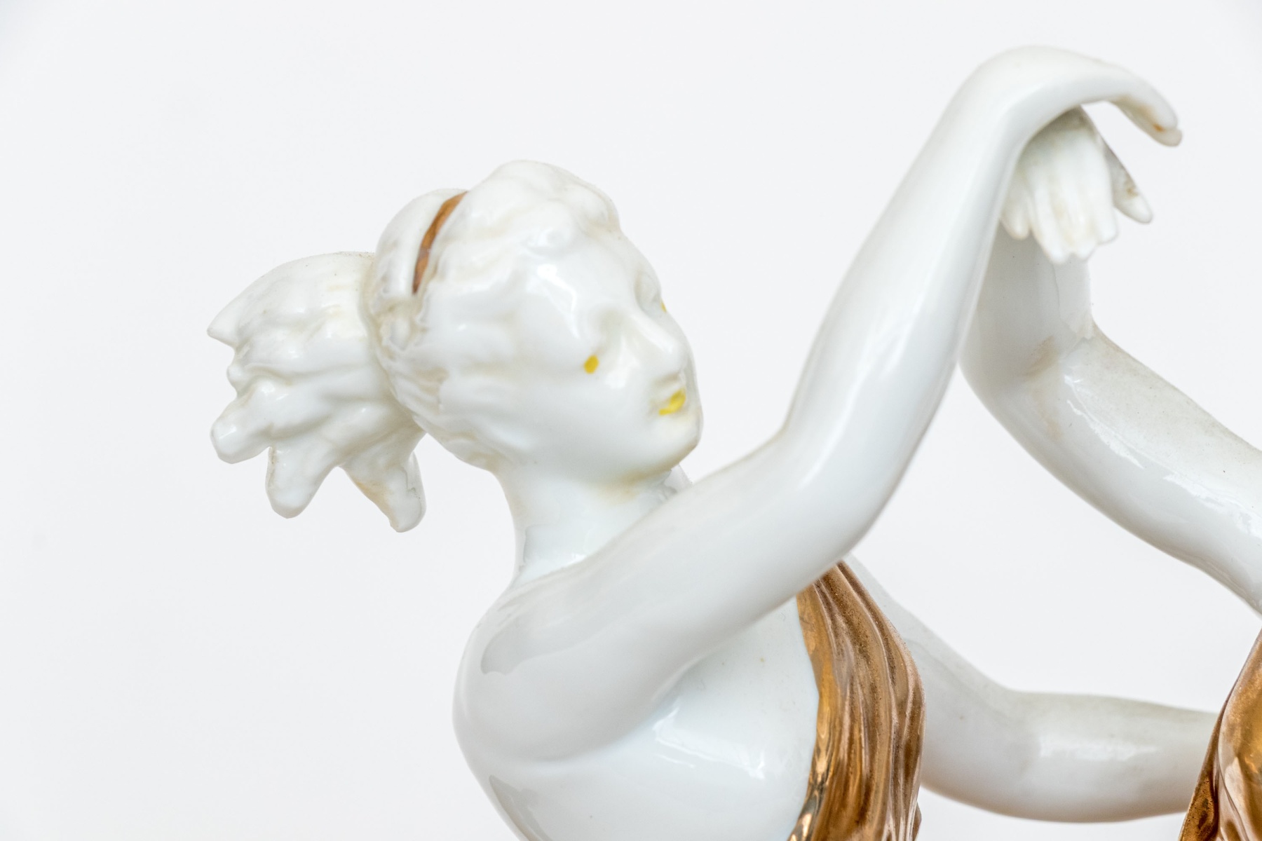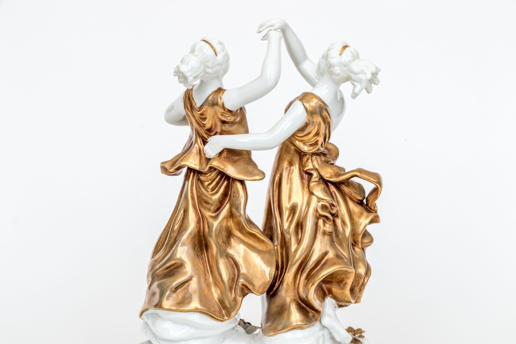 A striking porcelain sculpture in the manner of Capodimonte and Volkstedt depicting two elegant neoclassical ladies dancing with hair pulled back and arms raised, wearing lavishly gilt, billowing dresses over an oval base with large flowers a band of waving motifs around the foot.