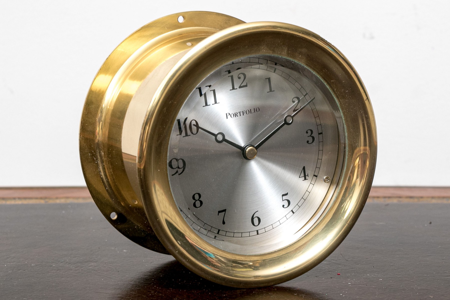 Portfolio brass and glass encased ship porthole form, wall mounted clock.