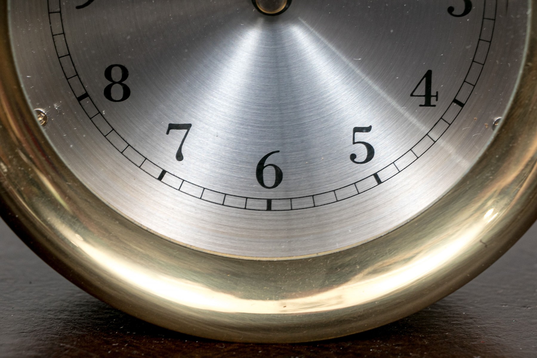 The circular dial with a metallic finish and arabic numerals and a minute and hour hand.