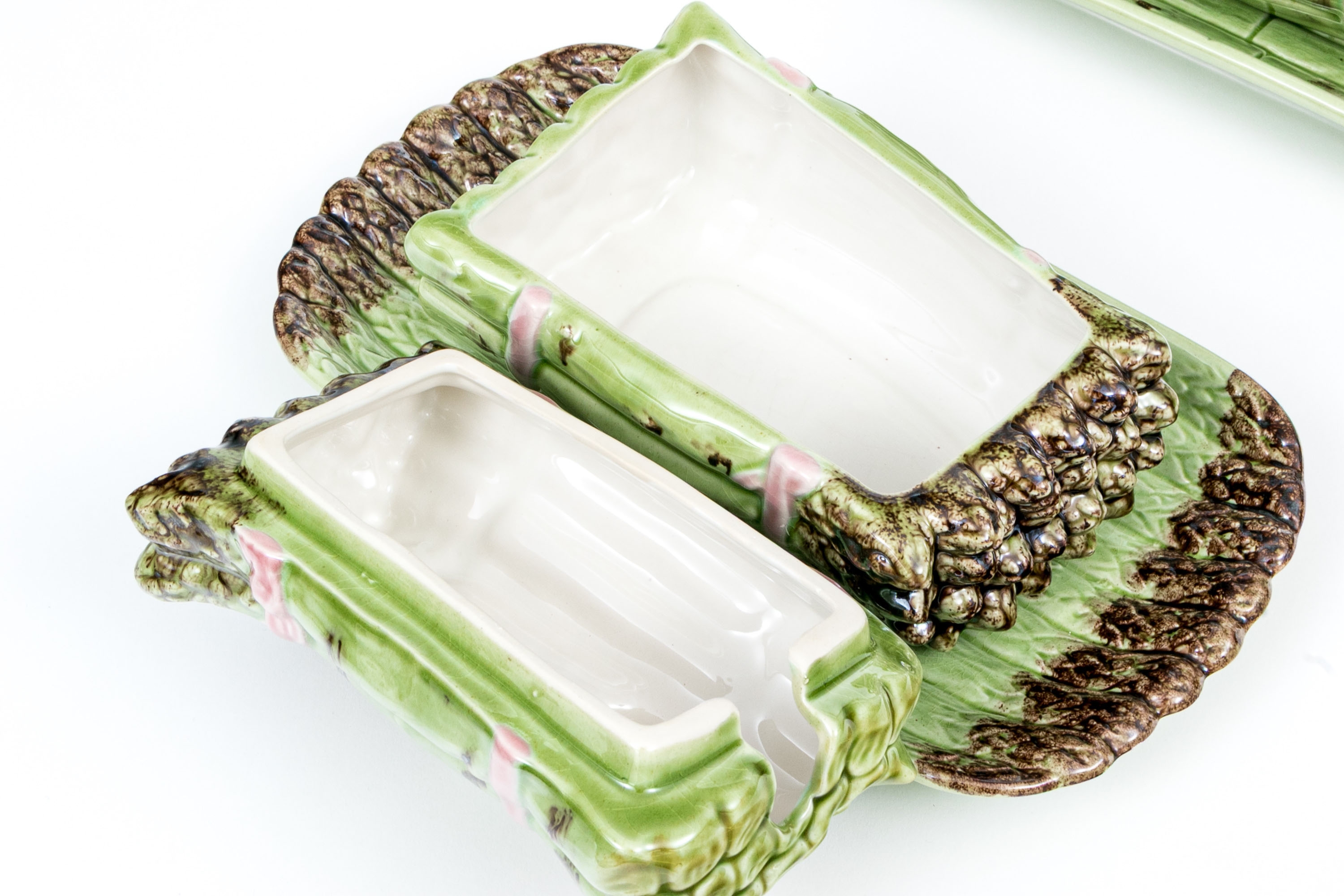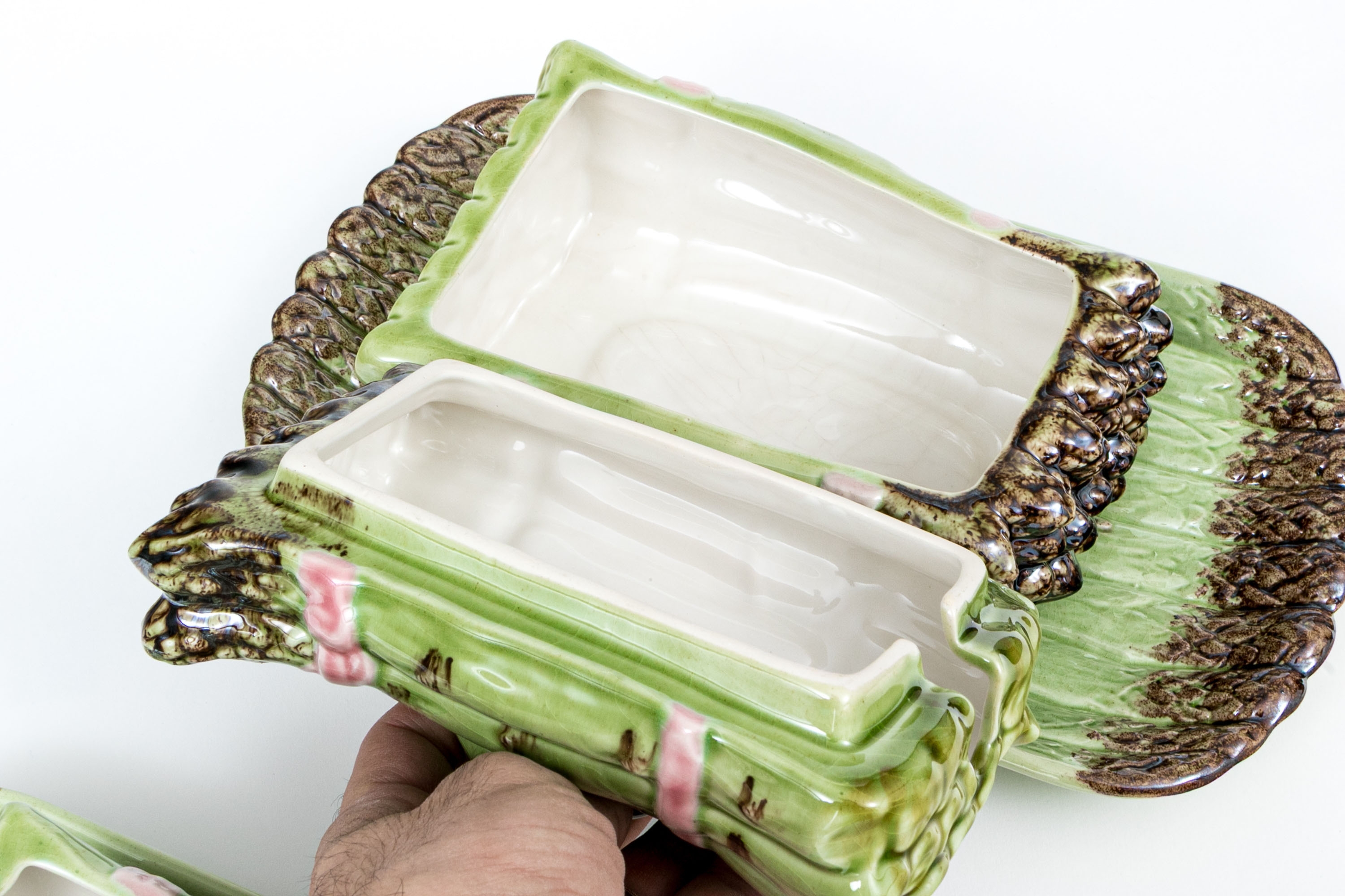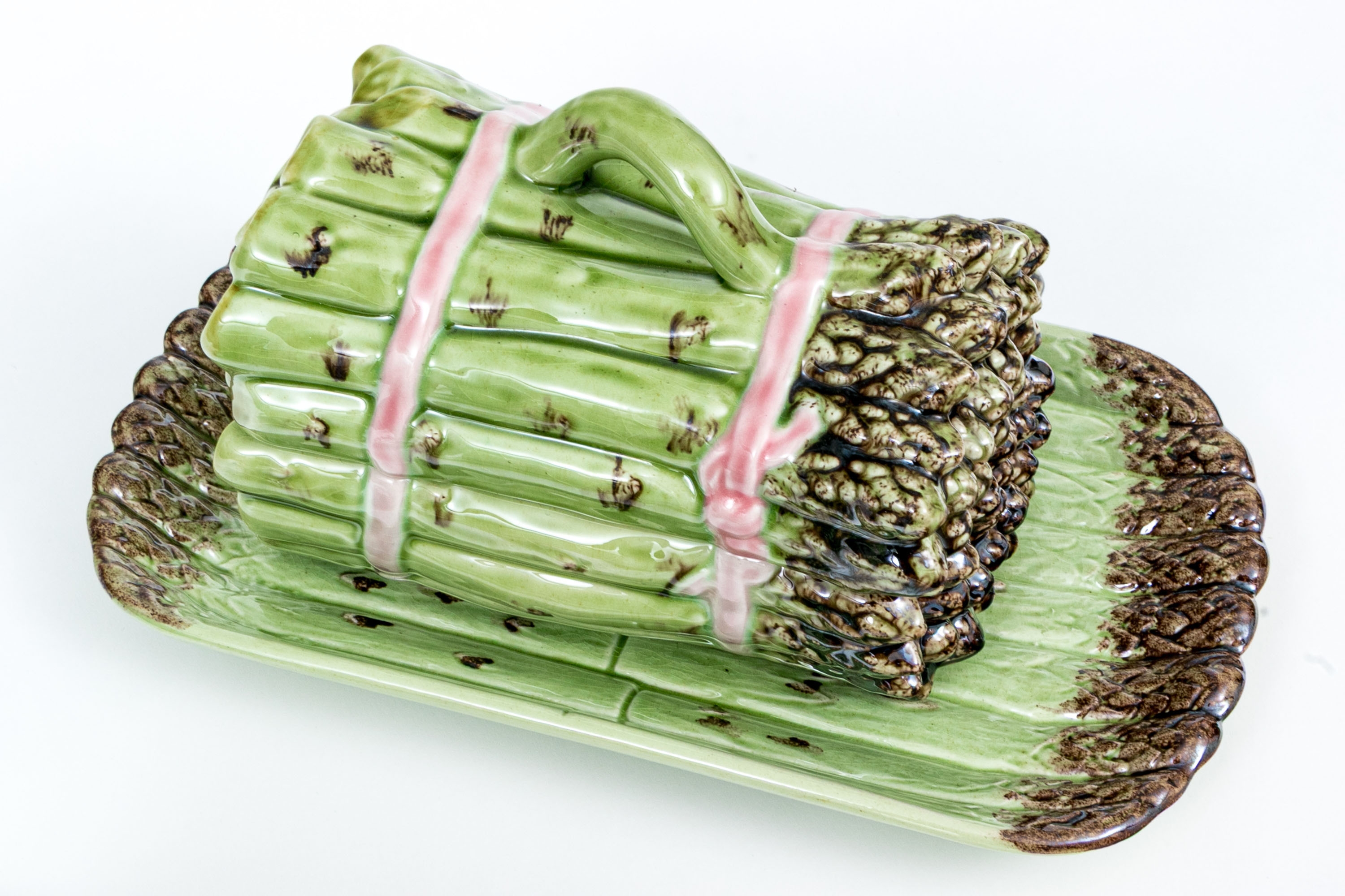 Each is wonderfully formed and painted in asparagus form. The bowl with lid and handle are in the form of a ribbon tied bunch of asparagus as is the undertray.