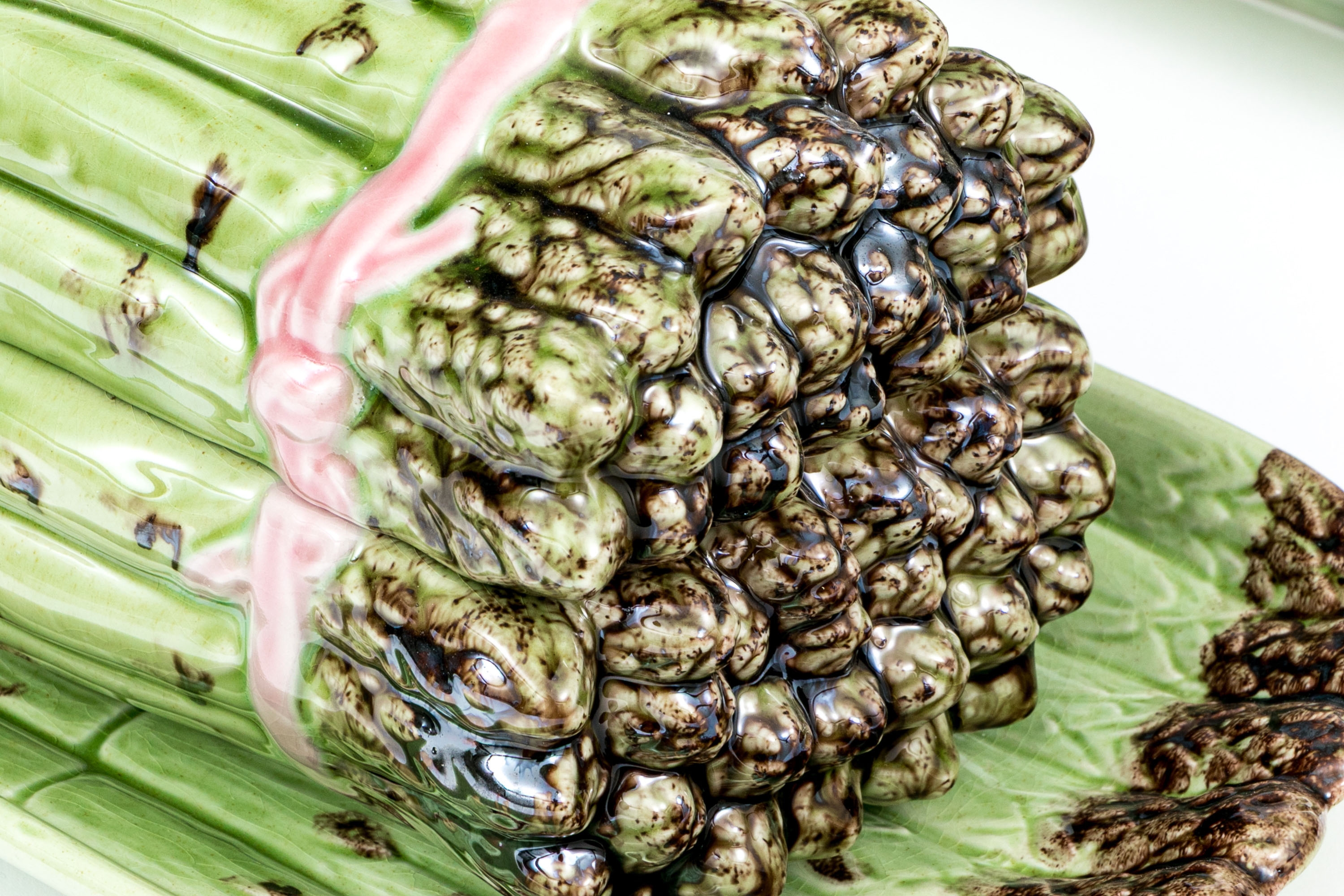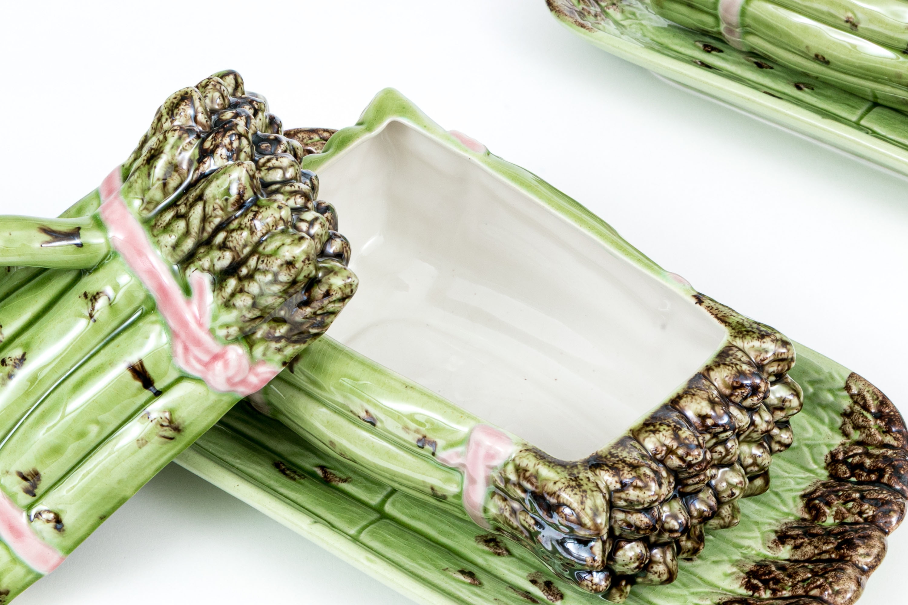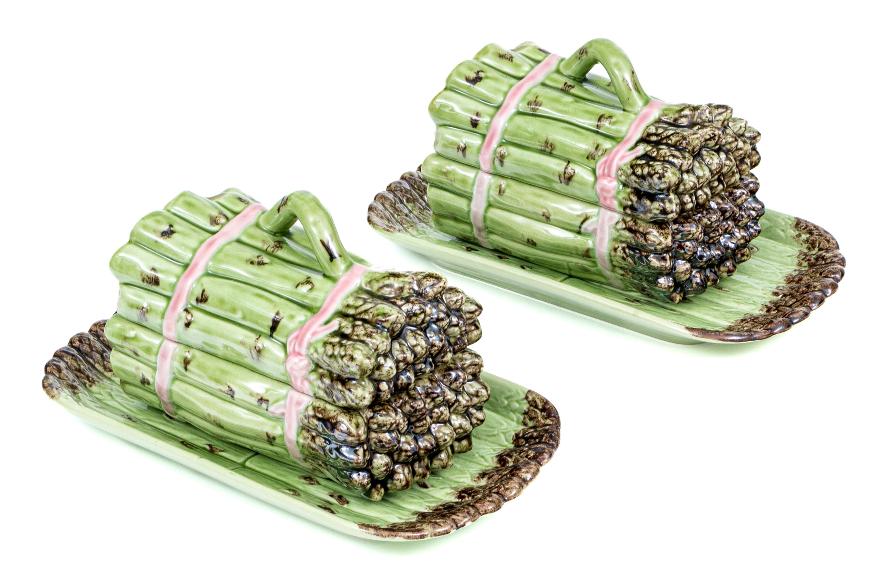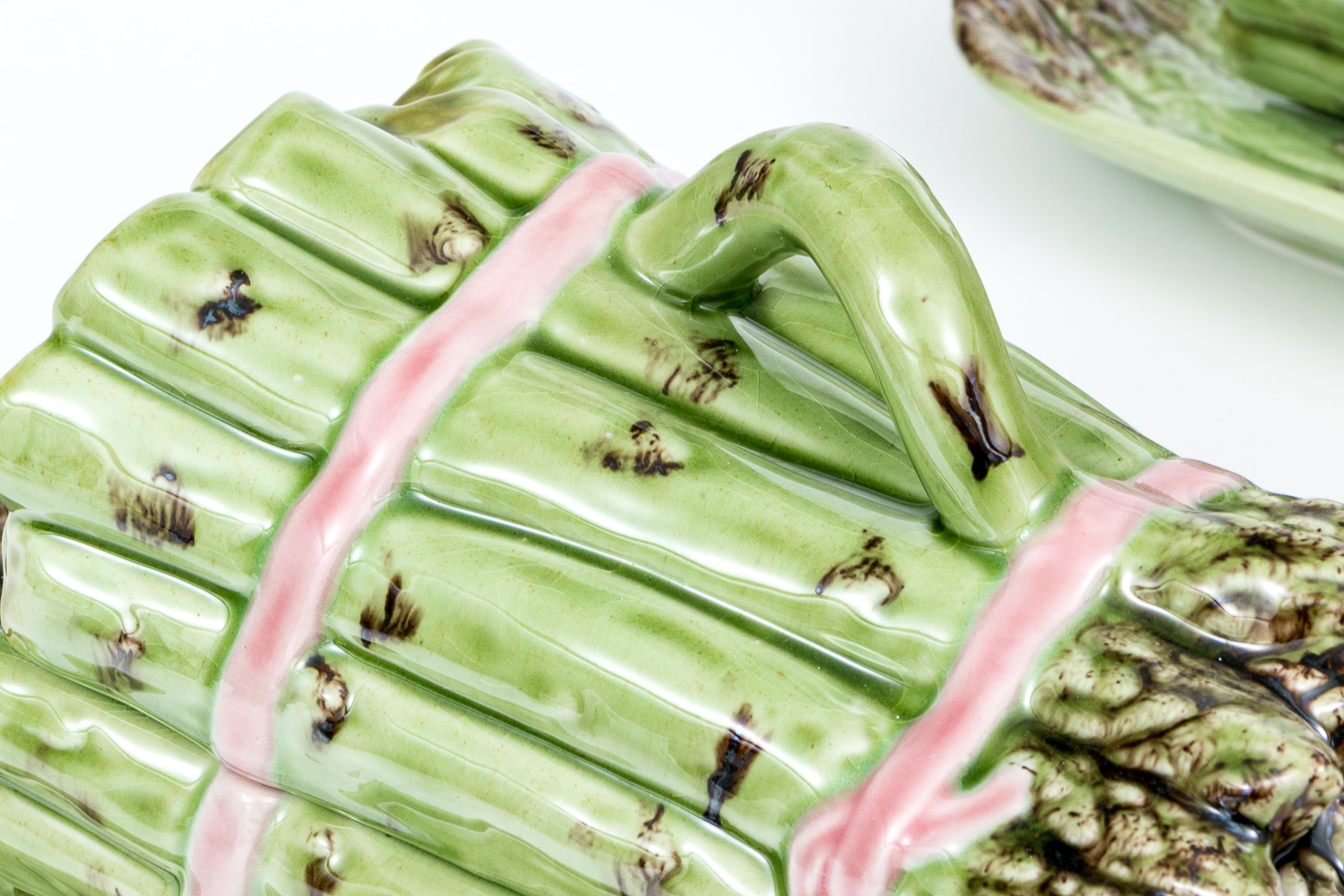 Each is wonderfully formed and painted in asparagus form. The bowl with lid and handle are in the form of a ribbon tied bunch of asparagus as is the undertray.