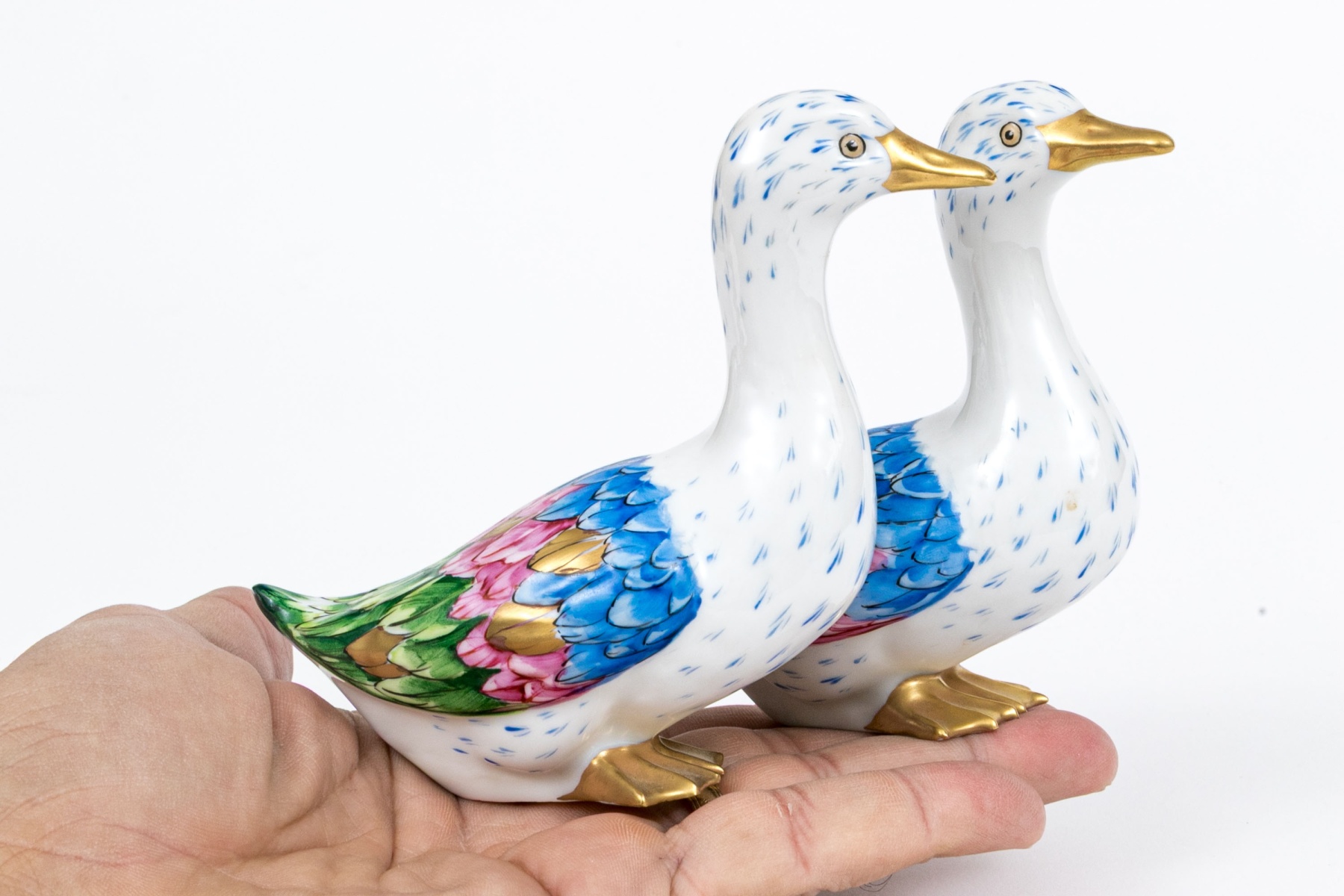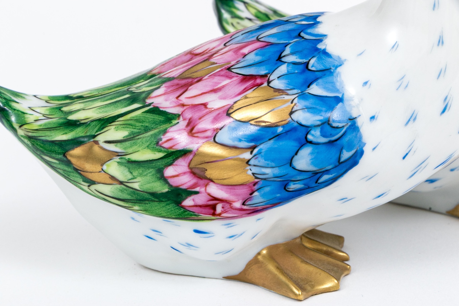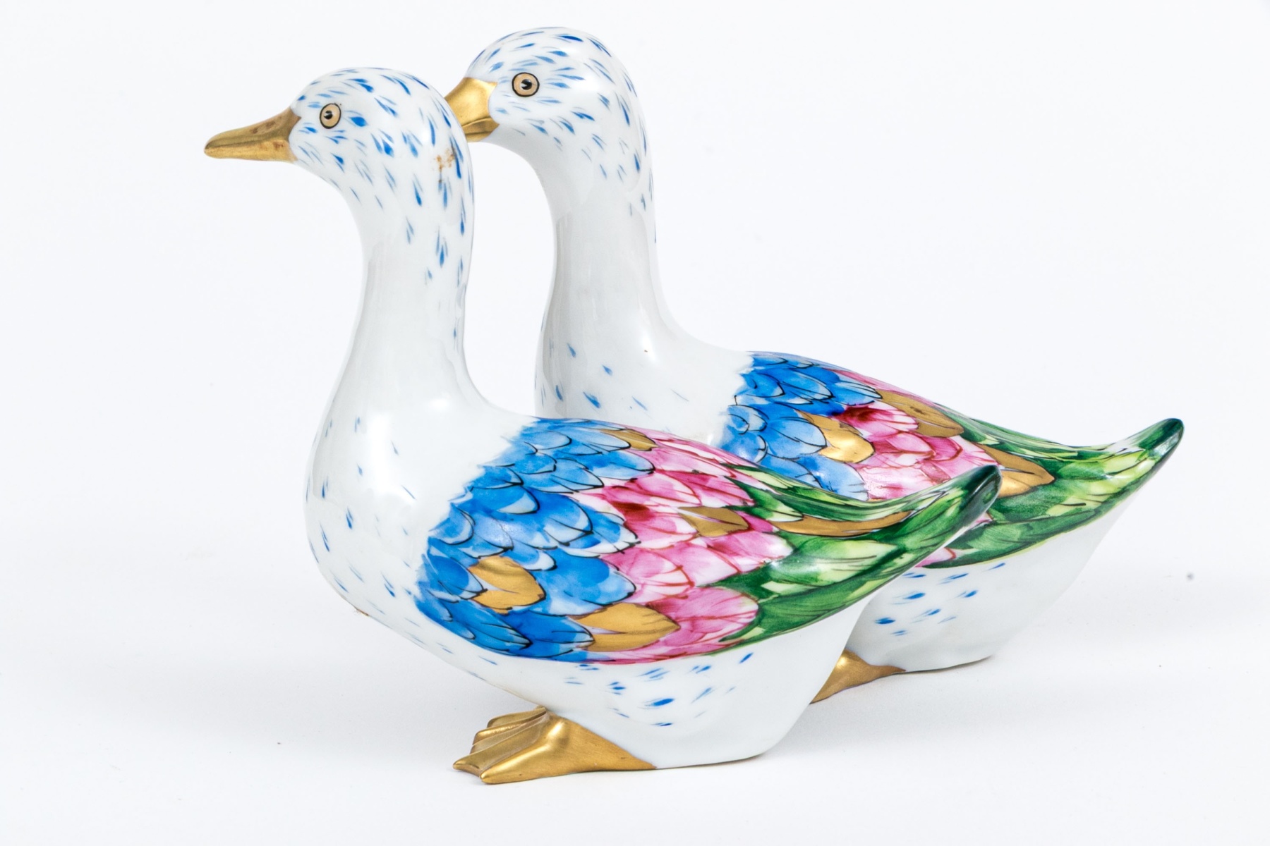 A fabulous Vista Alegre porcelain figurine depicting two duck hand-painted in vibrant polychrome colors including pink, green and blue with gilt finished beaks and feet. Marked underfoot.