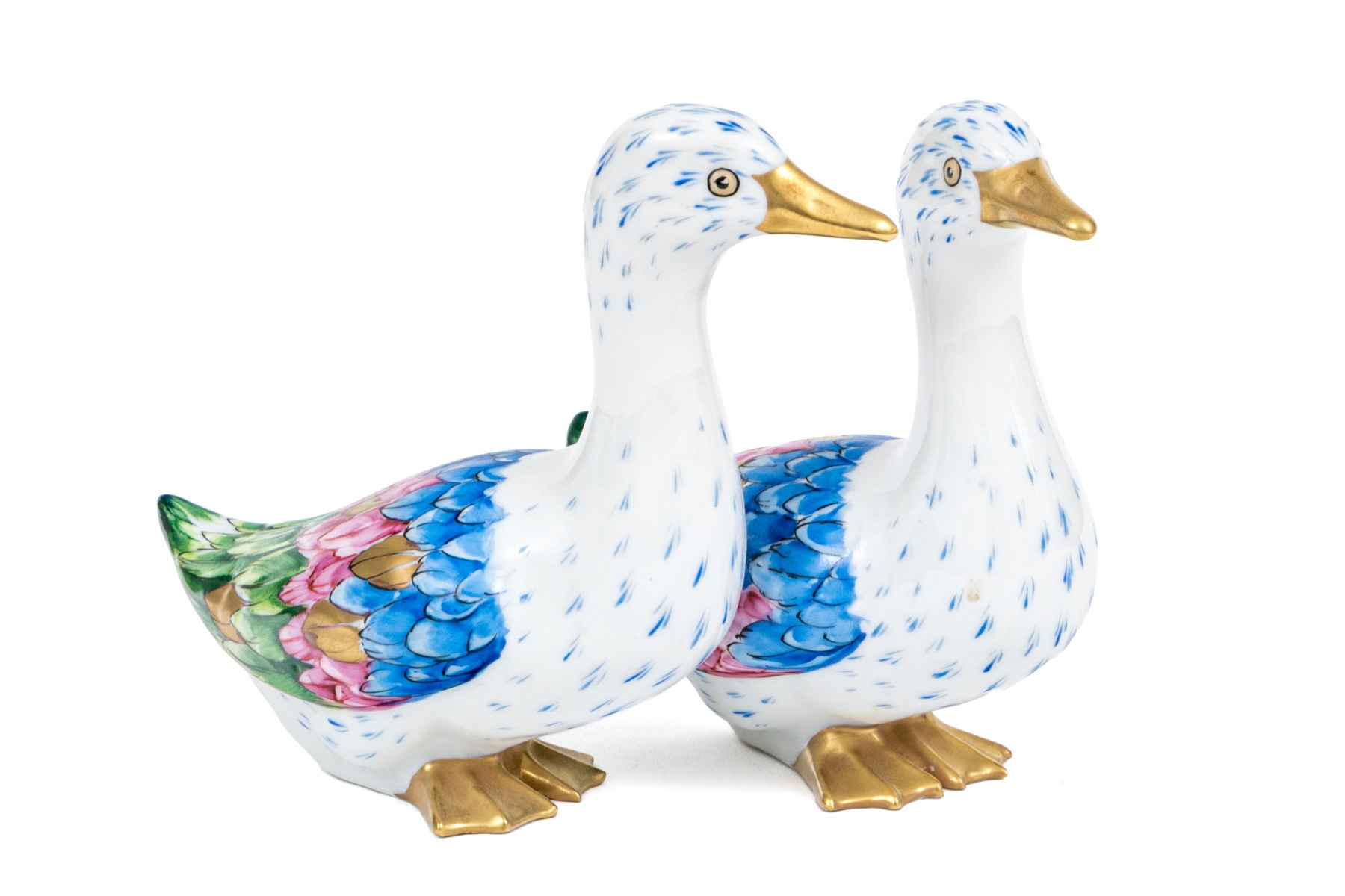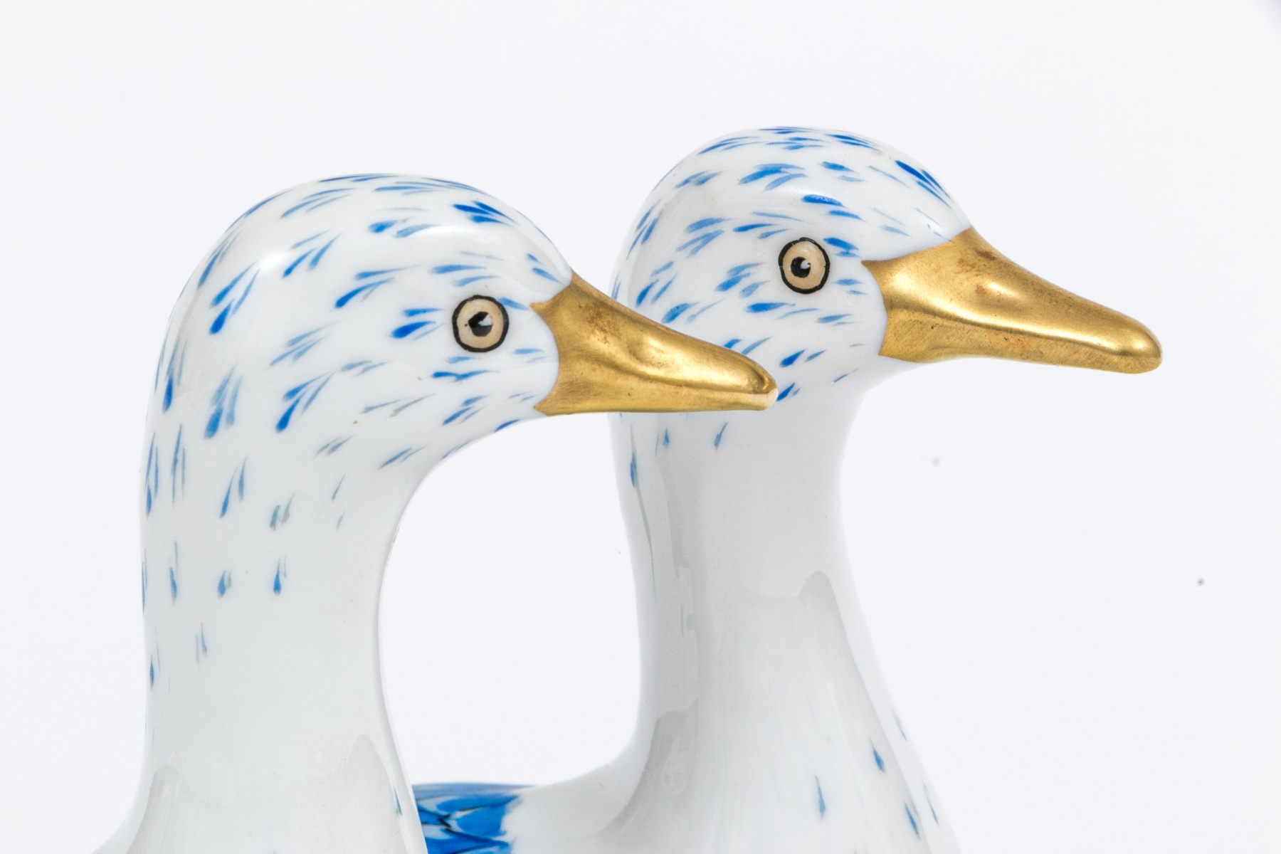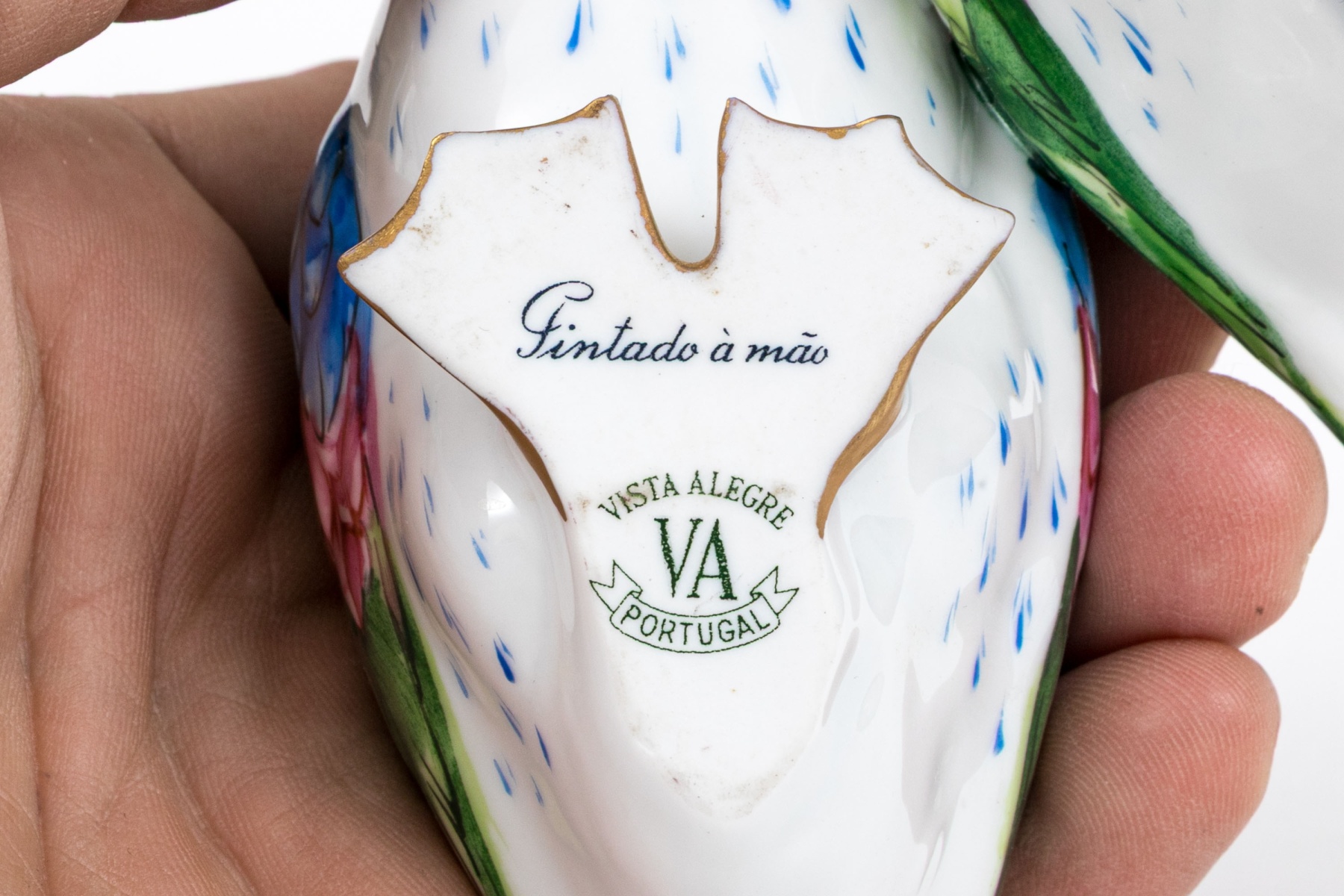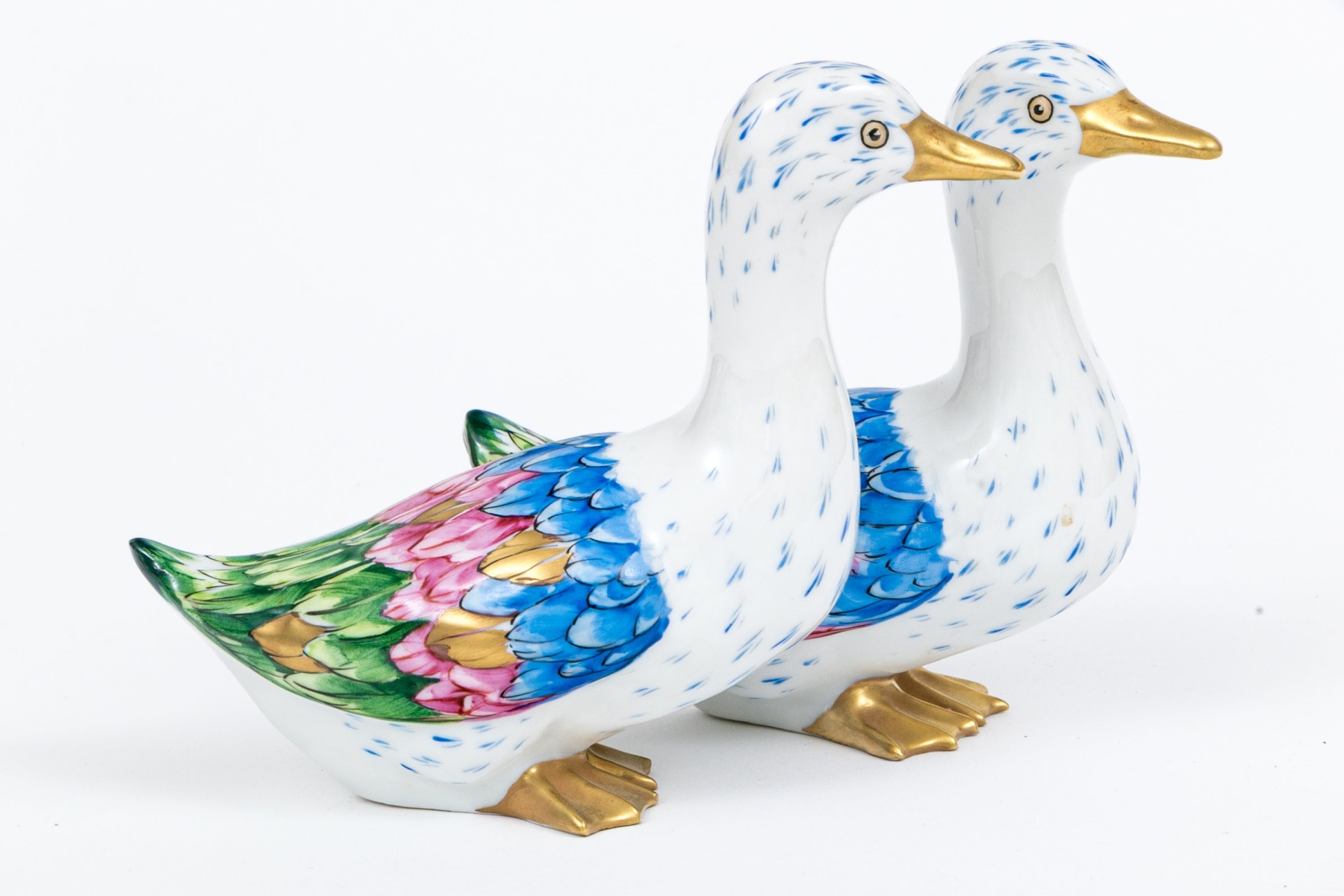 A fabulous Vista Alegre porcelain figurine depicting two duck hand-painted in vibrant polychrome colors including pink, green and blue with gilt finished beaks and feet. Marked underfoot.