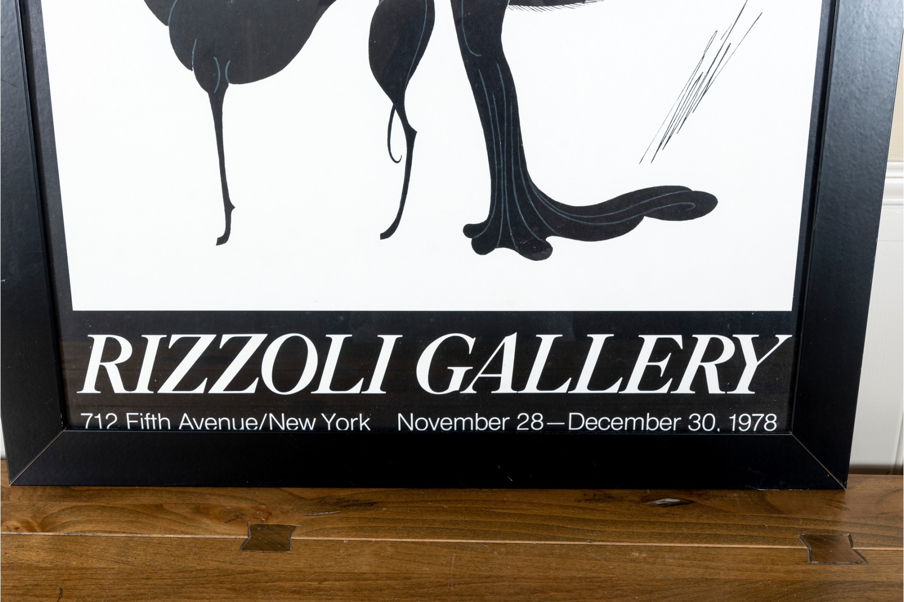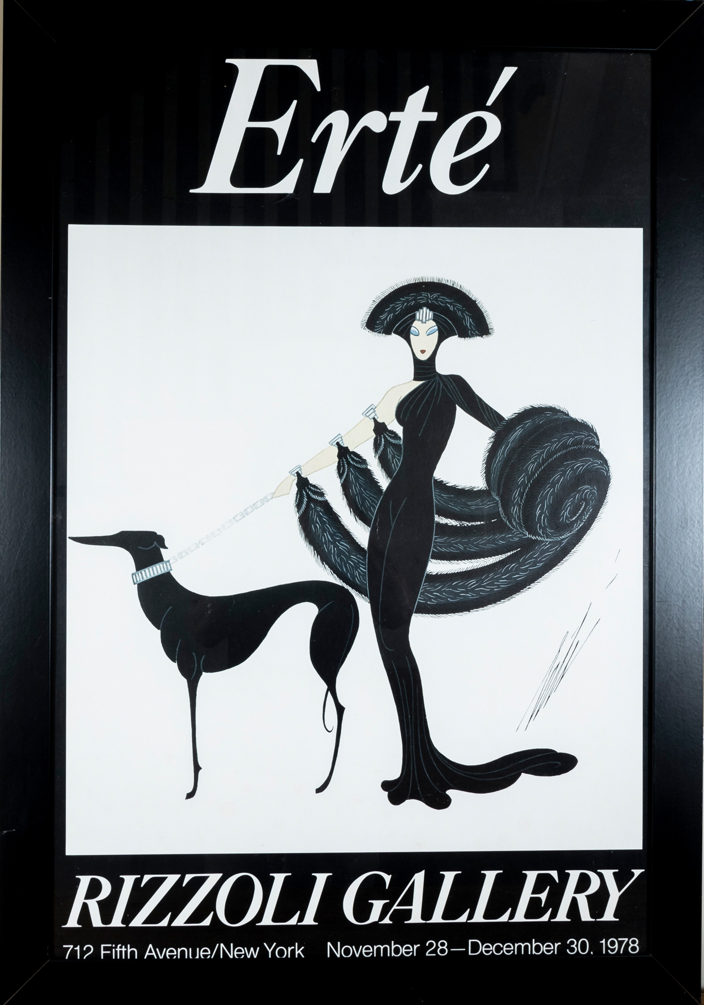 Poster for an Erte exhibit at Rizzoli Gallery featuring a fashionable lady wearing an elegant off the shoulder dress with three feathered scarves on one hand and the other hand is holding a lead attached to a greyhound dog.