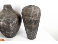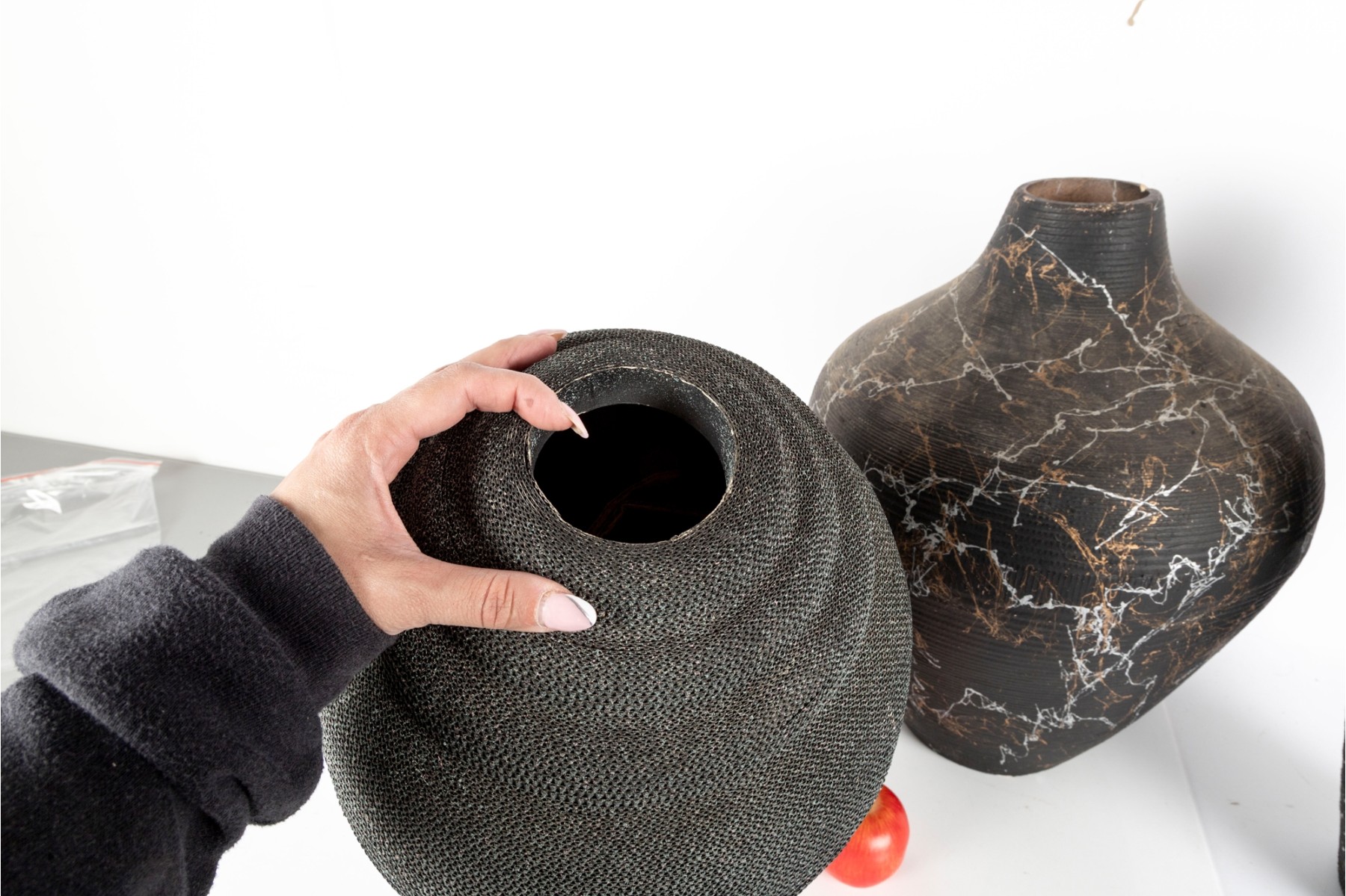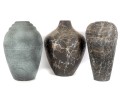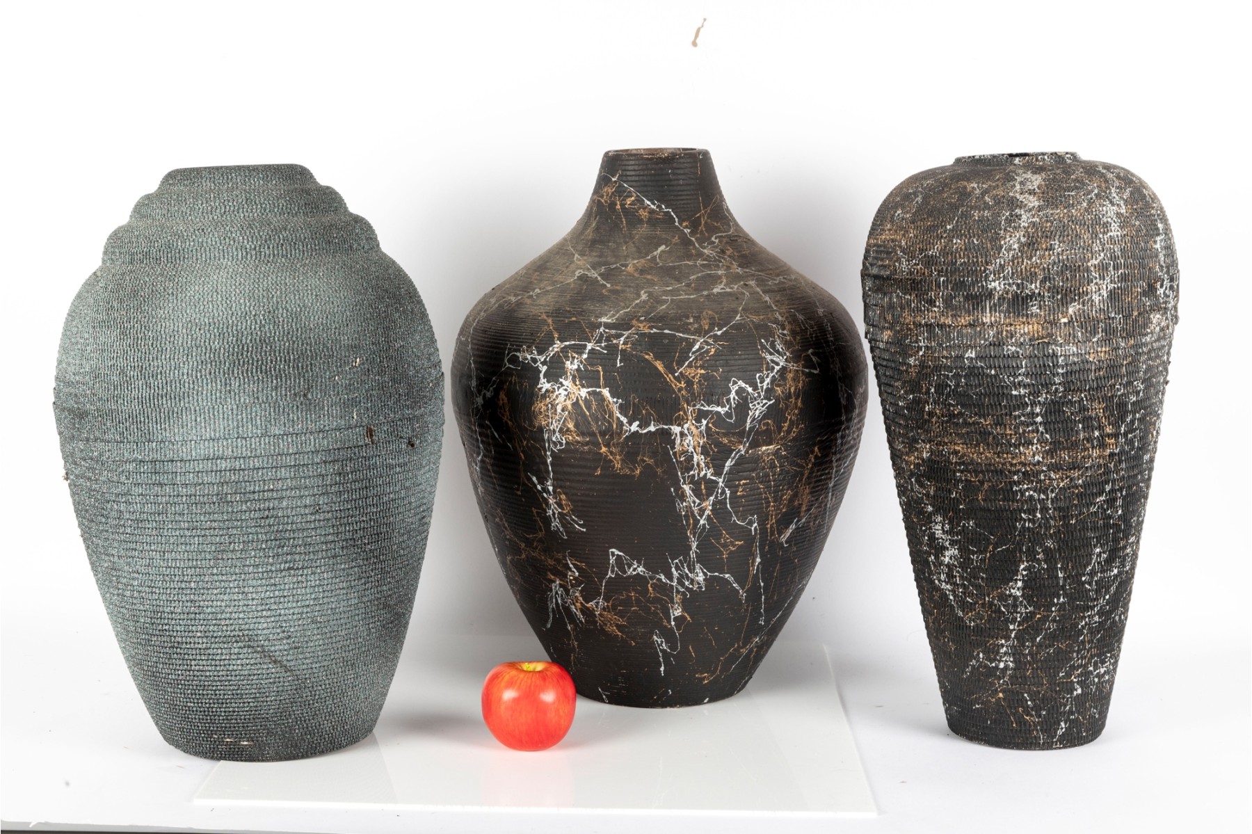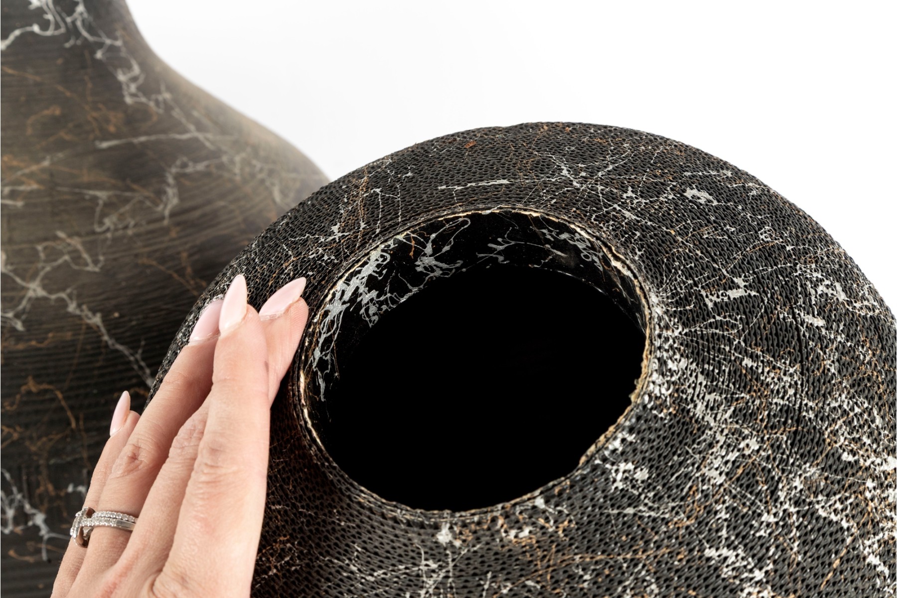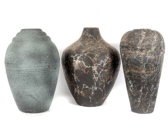 A set of three vases crafted from cut/sculpted corrugated cardboard, each featuring their own webbed or sponged pattern, lending these pieces a post-modern look.