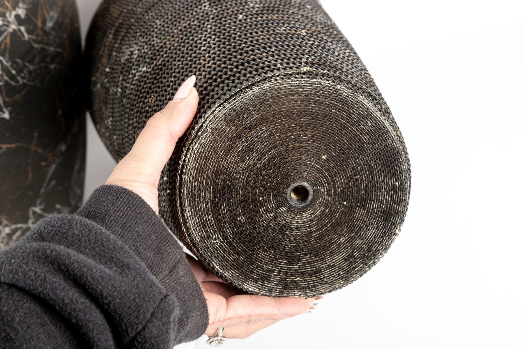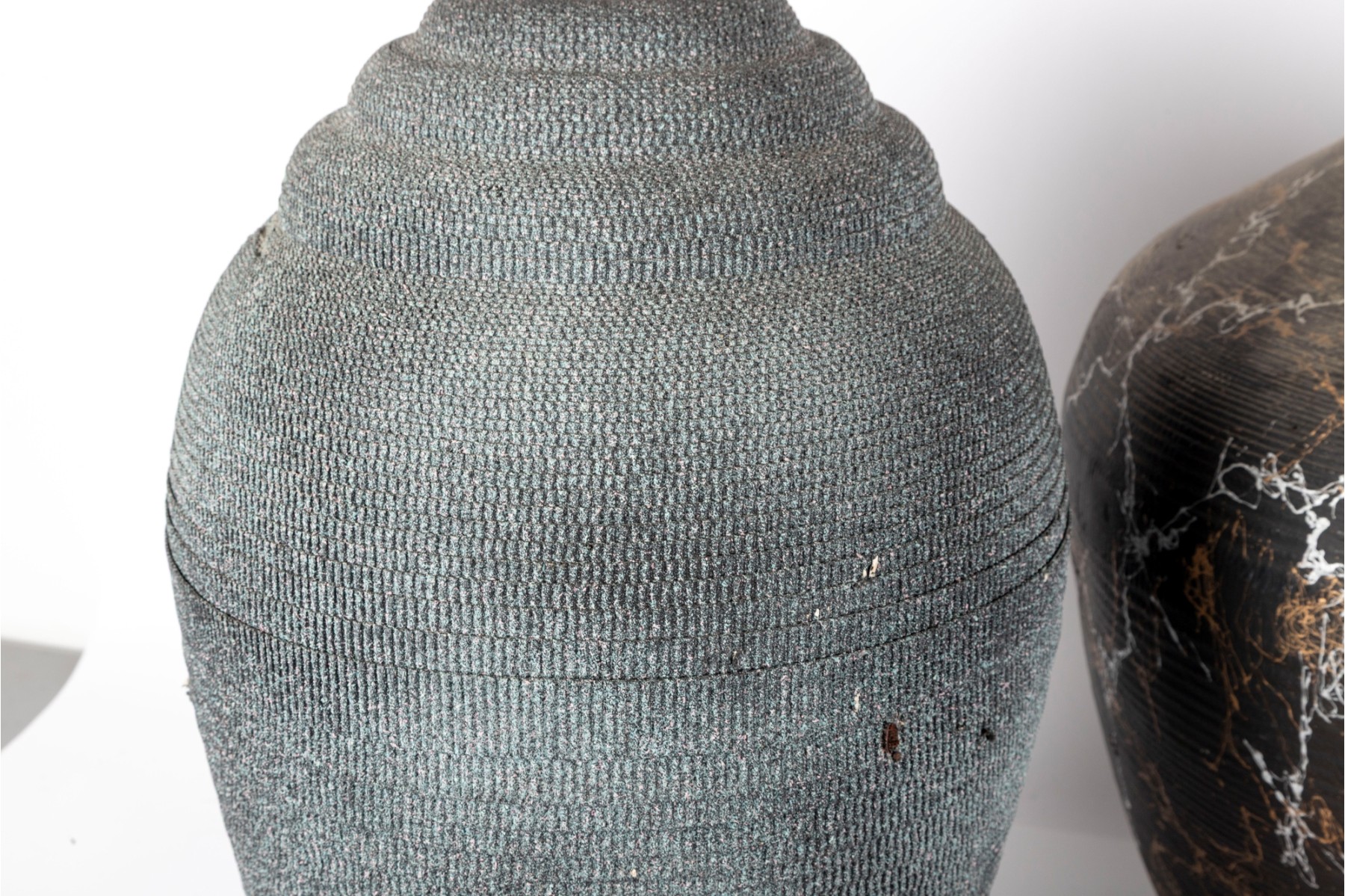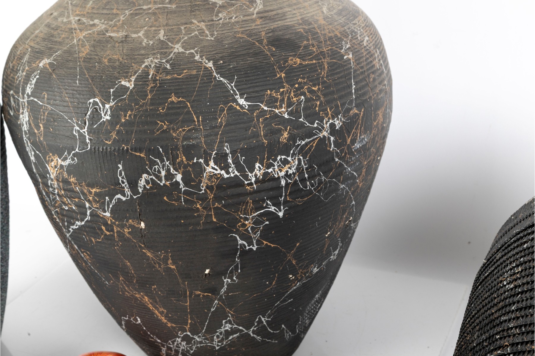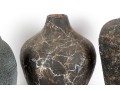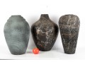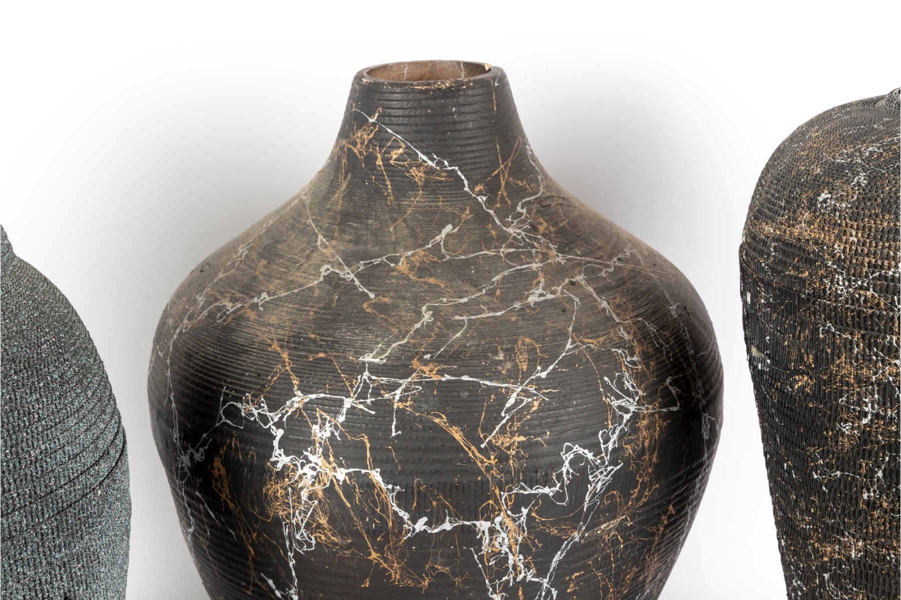 A set of three vases crafted from cut/sculpted corrugated cardboard, each featuring their own webbed or sponged pattern, lending these pieces a post-modern look.