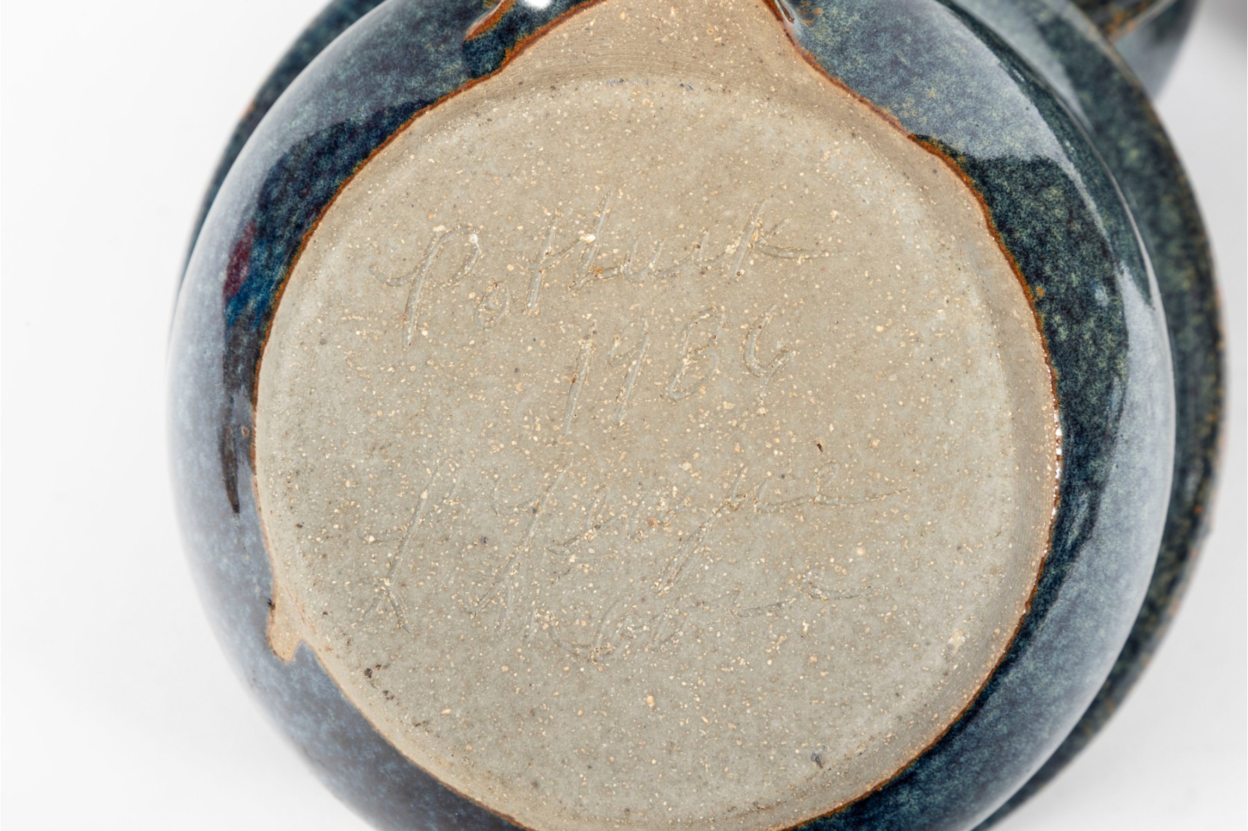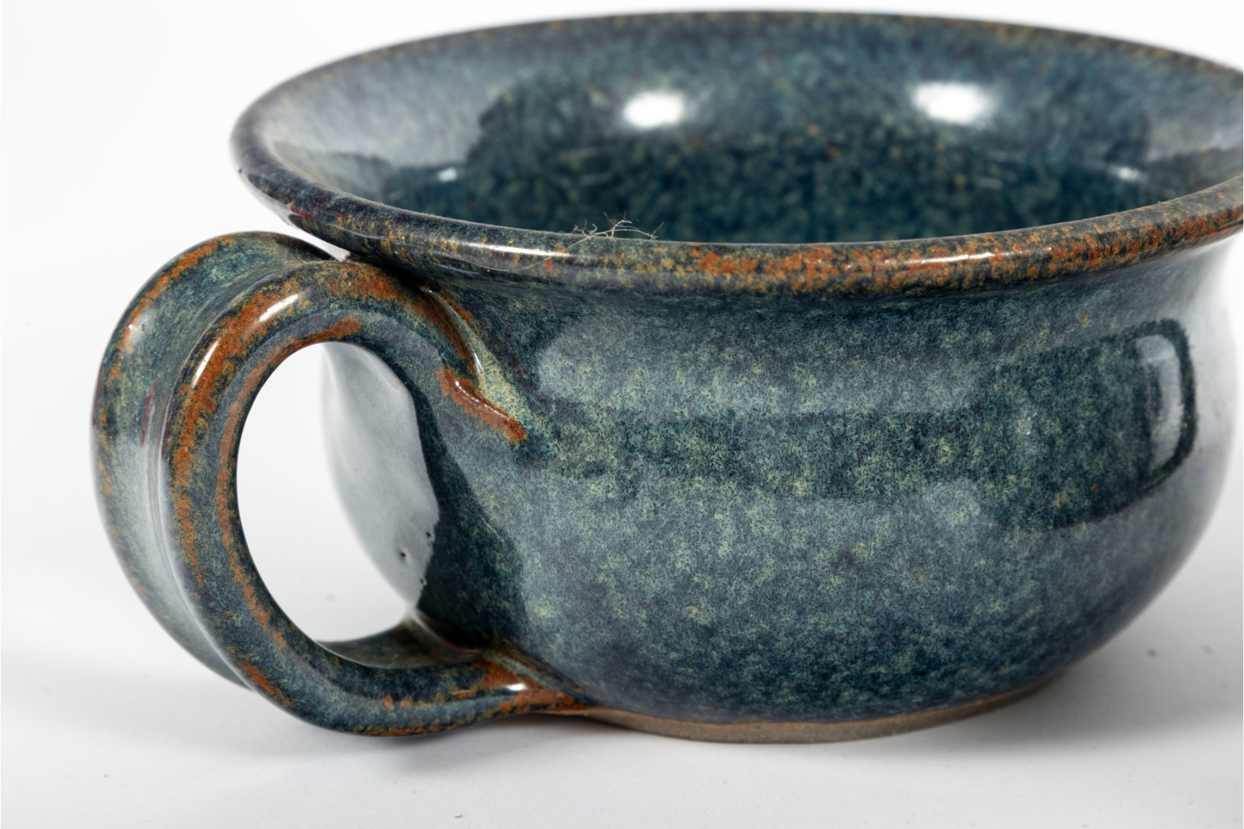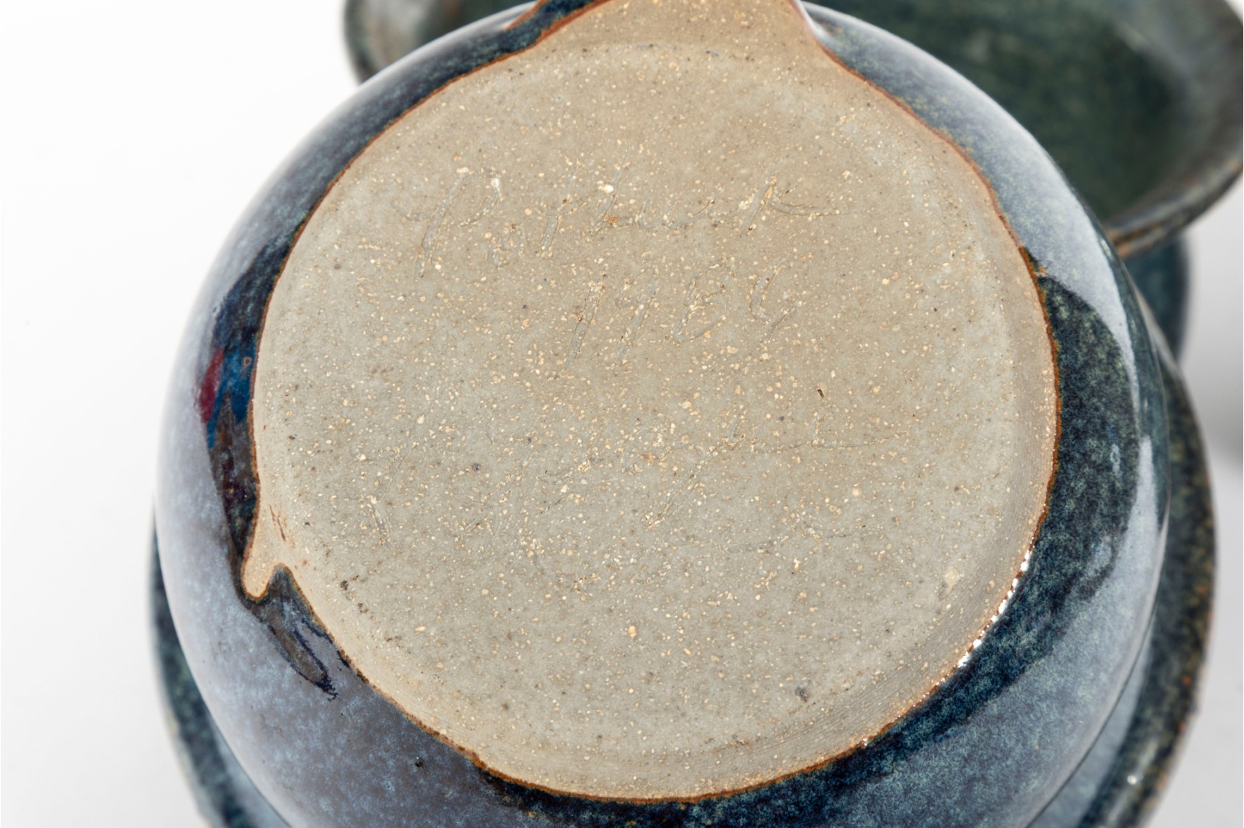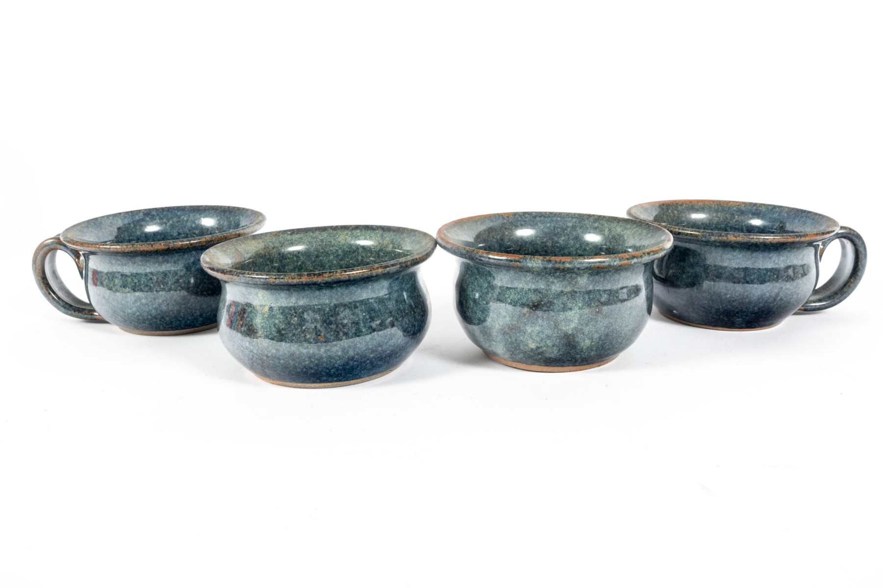 A set of four handled 5.5" soup bowls by Laura Christine Teague Moore (1943 - 2023) owner of Pot Luck Pottery. Each example is glazed in a deep gloss blue with matte clay accents over fine earthenware, dated 1986 and signed with her namesake.